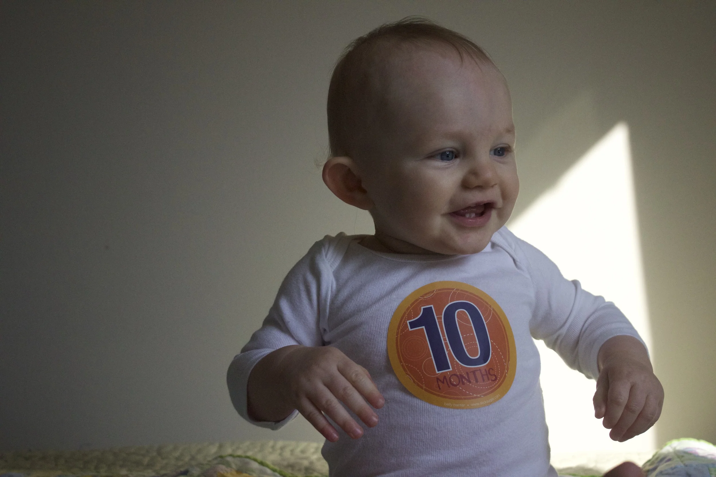 - The week before his 10-month birthday he scootched on his hands and knees a few times for a few days. And then 2 days before the crawling became “real” enough to count. :-)