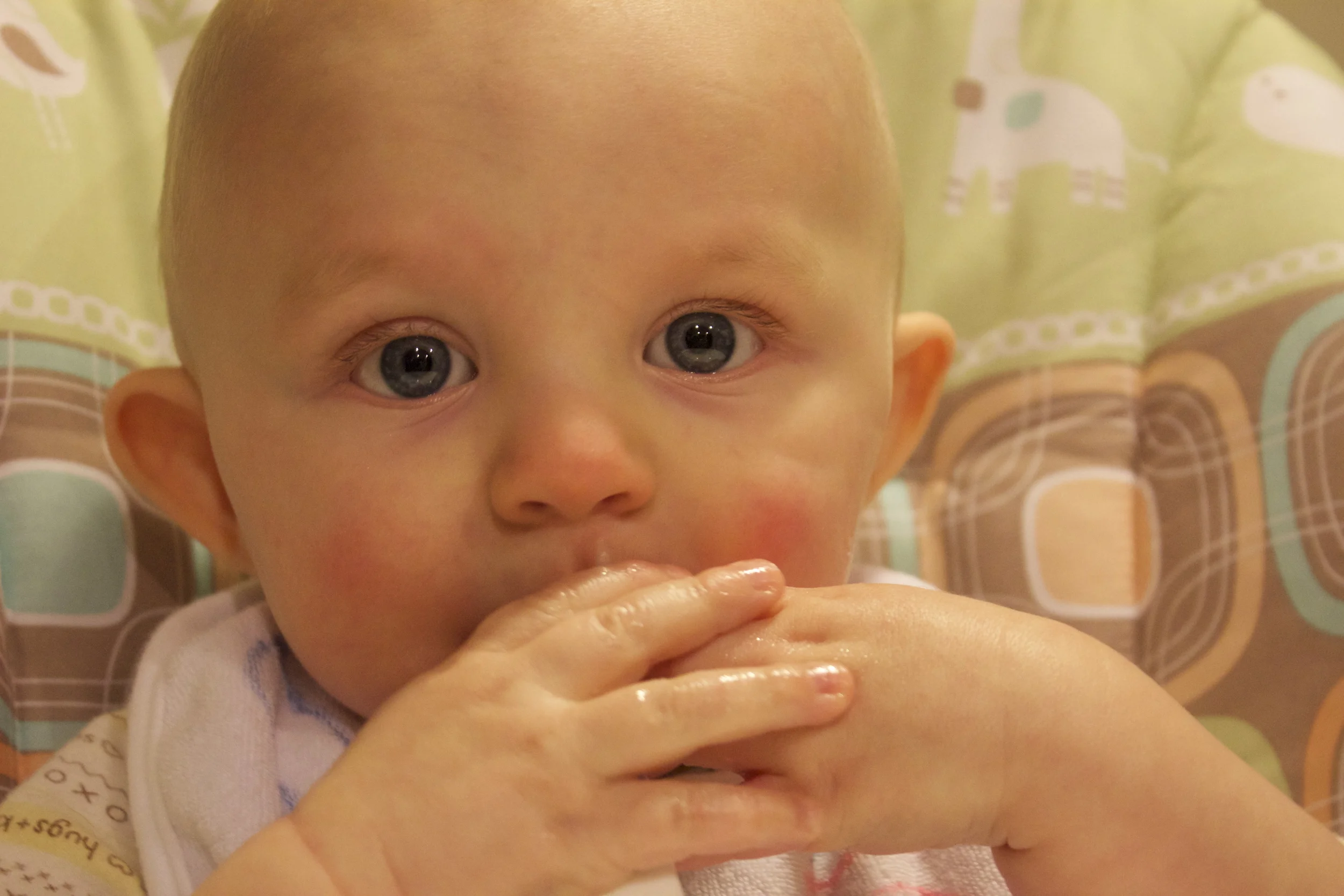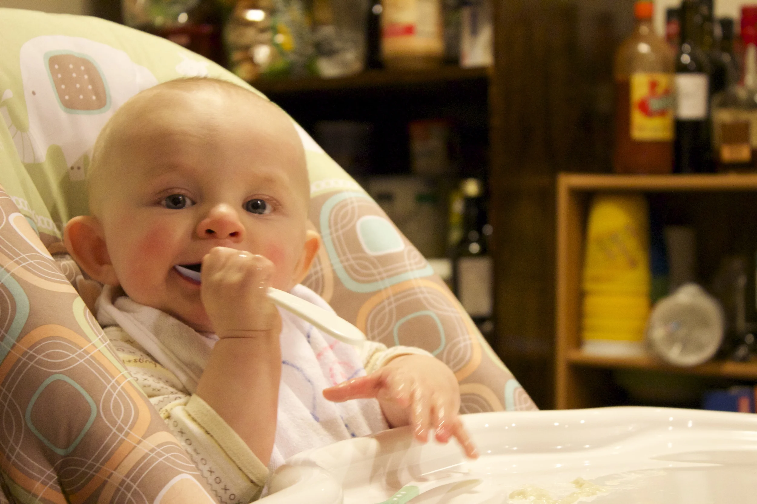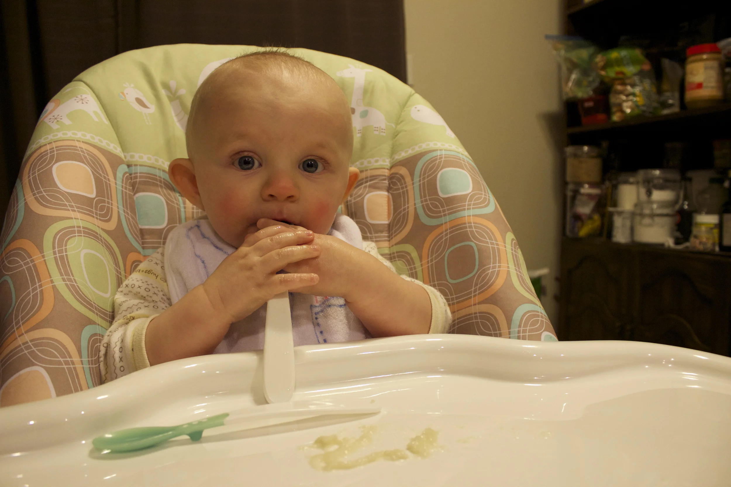 Still a day before actually eating food and we're actually encouraging him to play with his food! Still just exploring what this gooey stuff is.