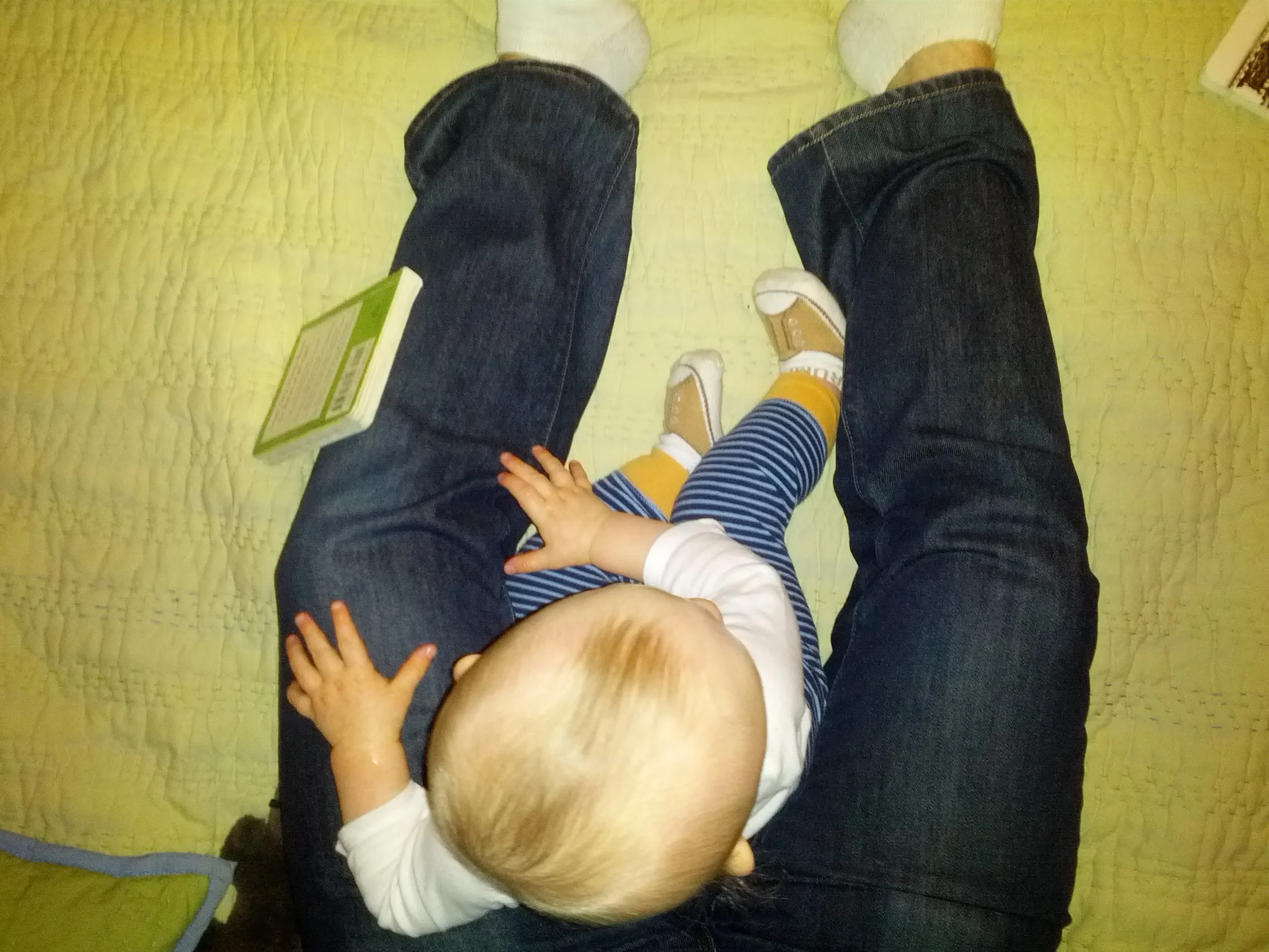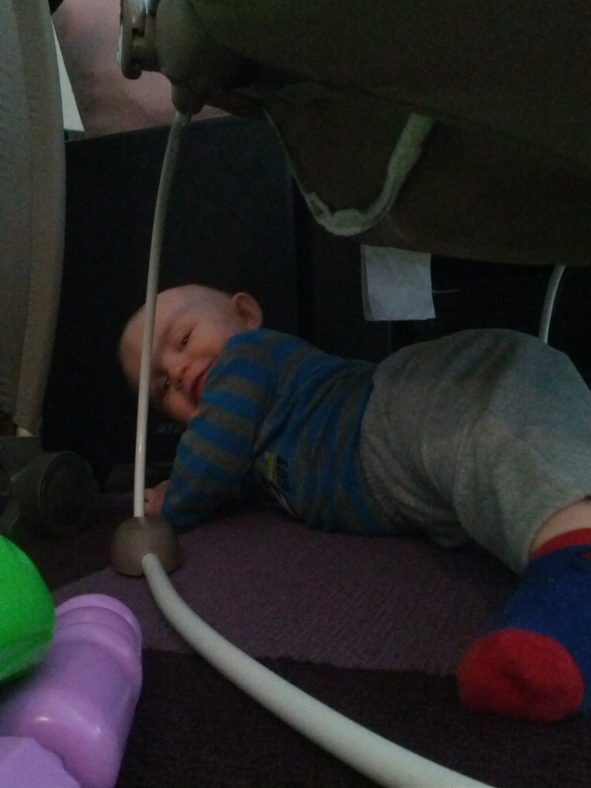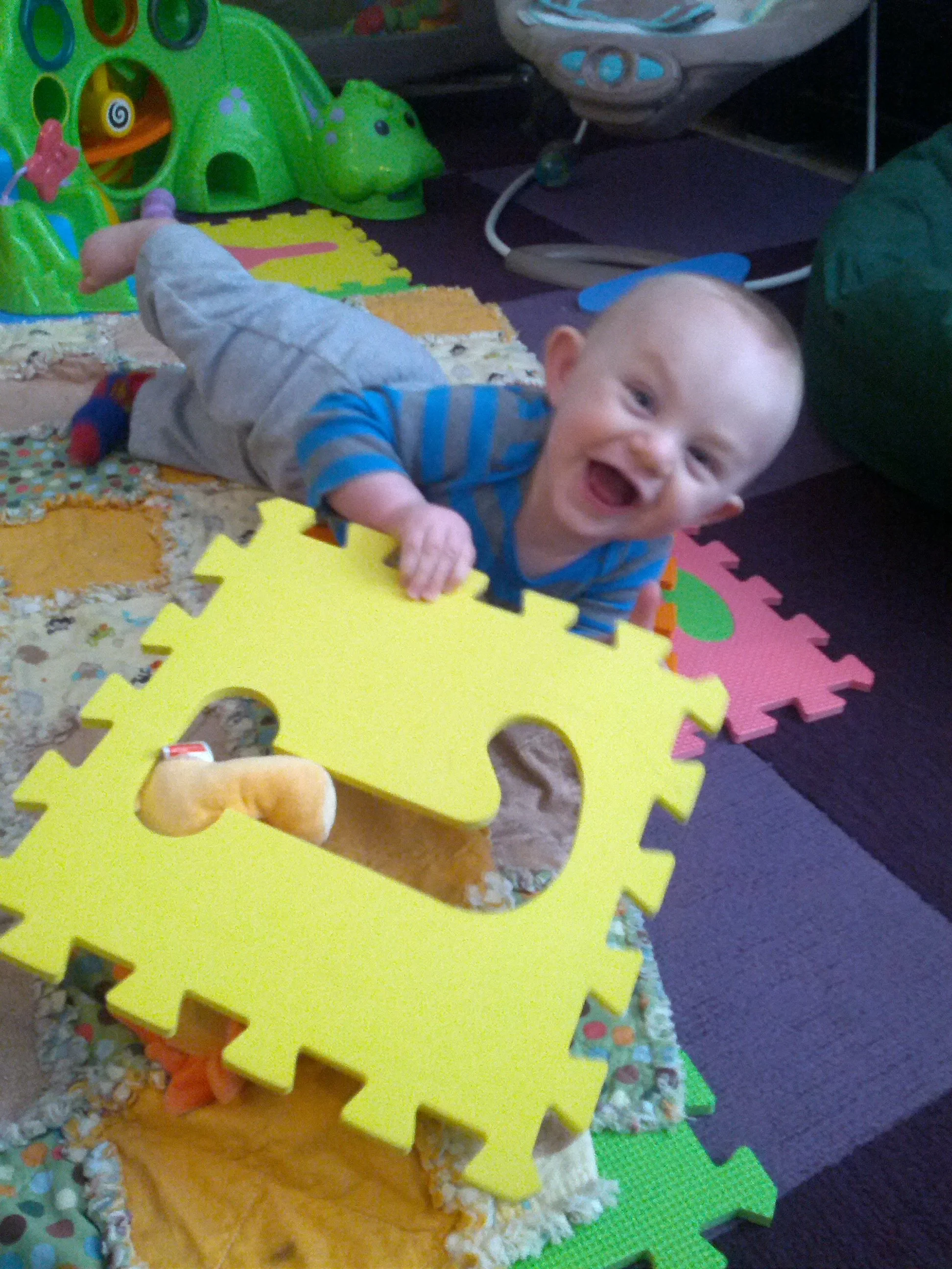 "Why do I even bother putting down toys? All he really wants are the tiles." P.S. This is one of my favorite pictures of all time now. Crazy boy, exploring his world, big smile, one sock. :-)