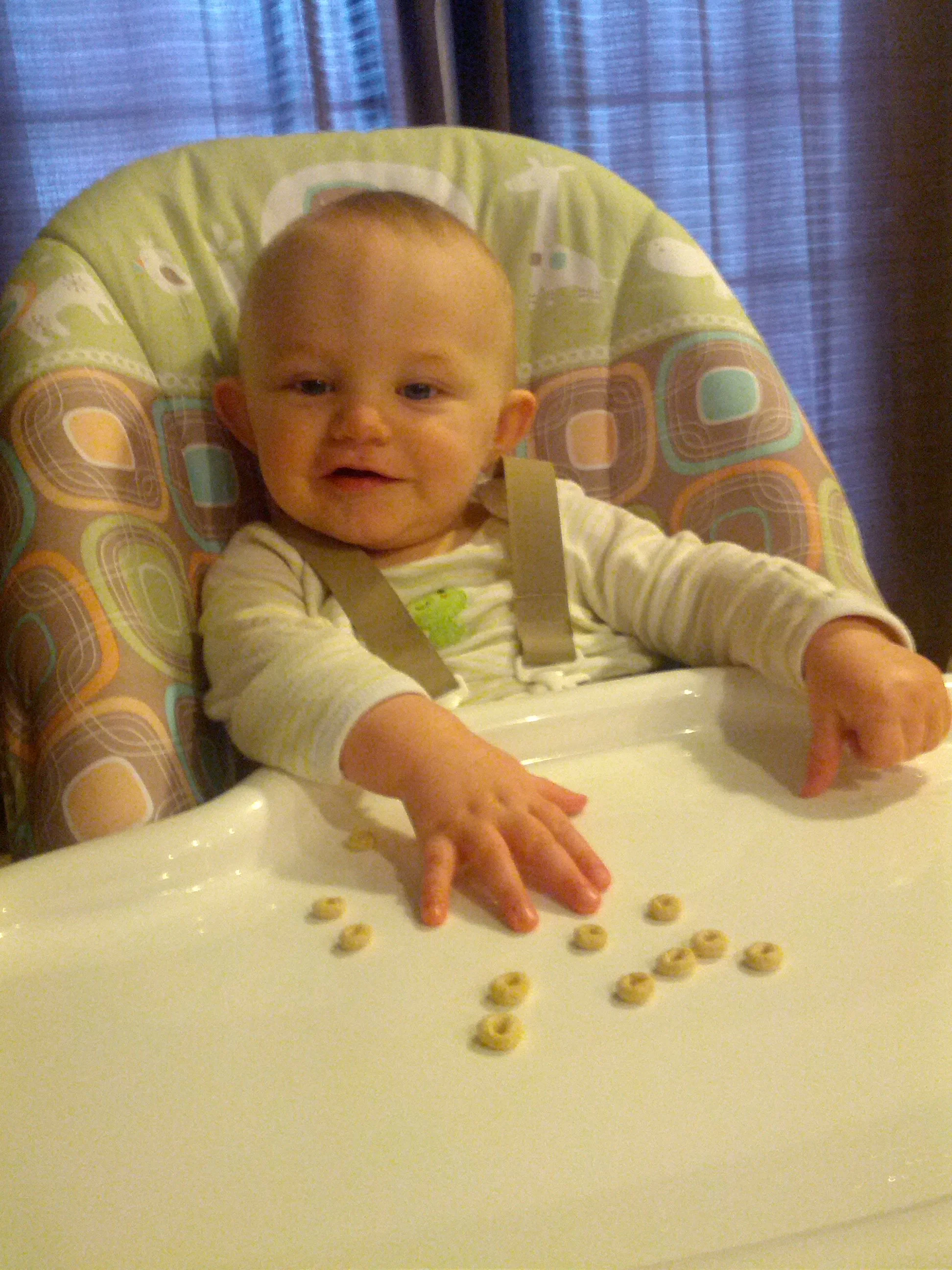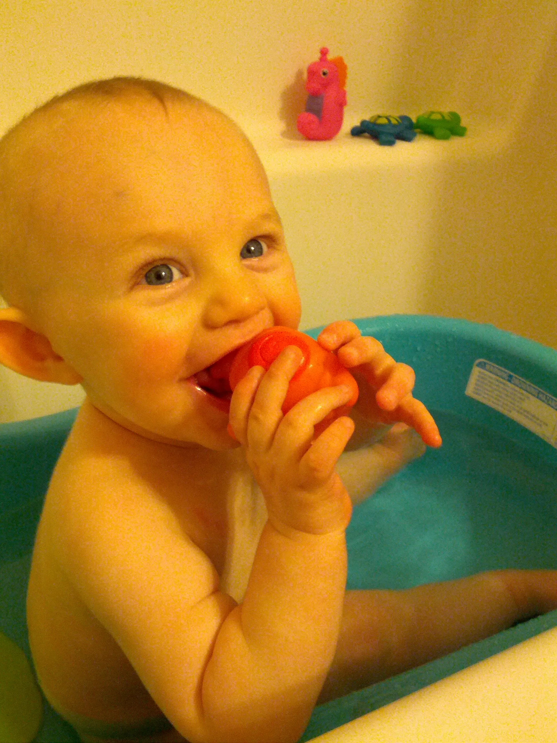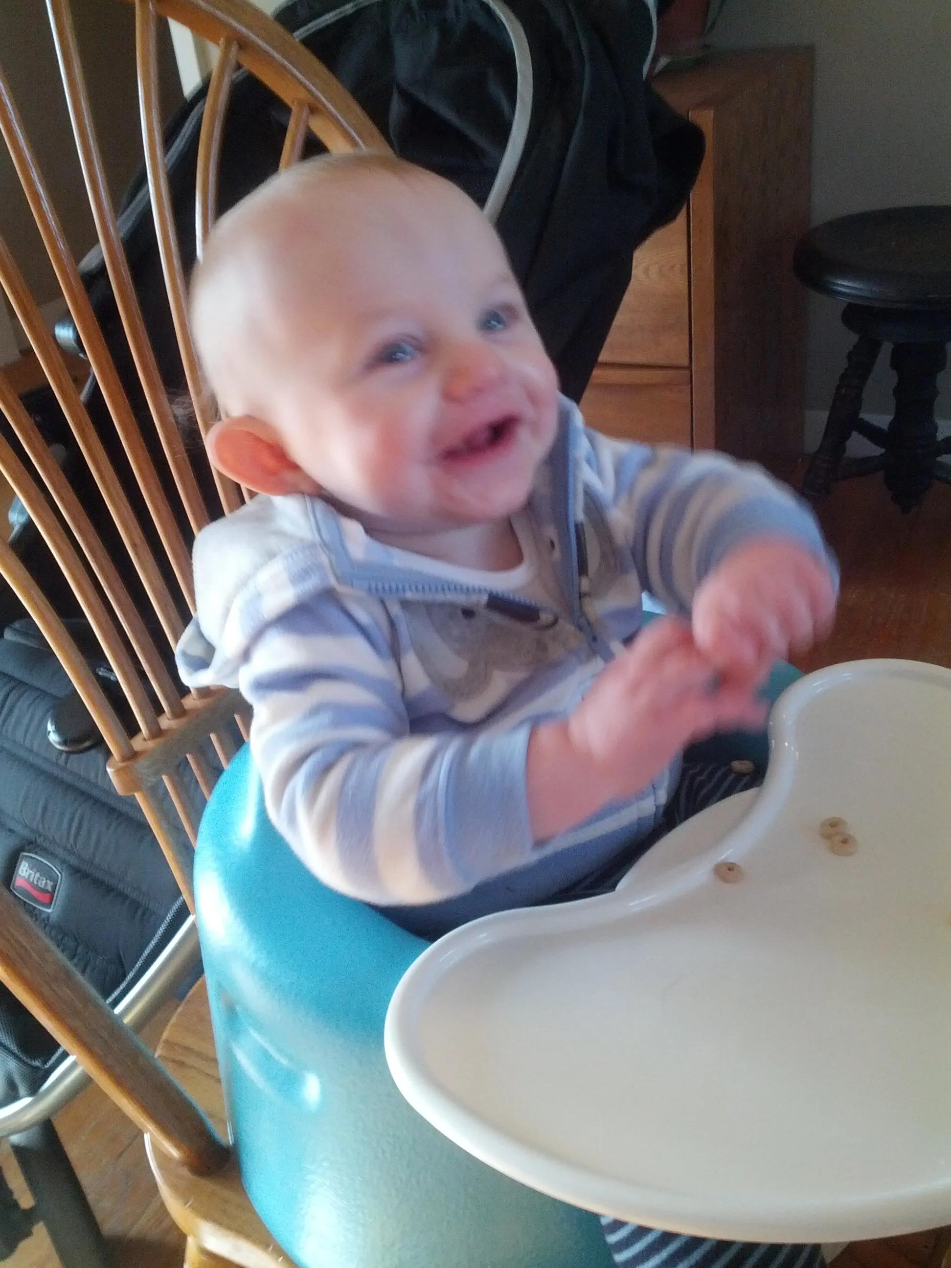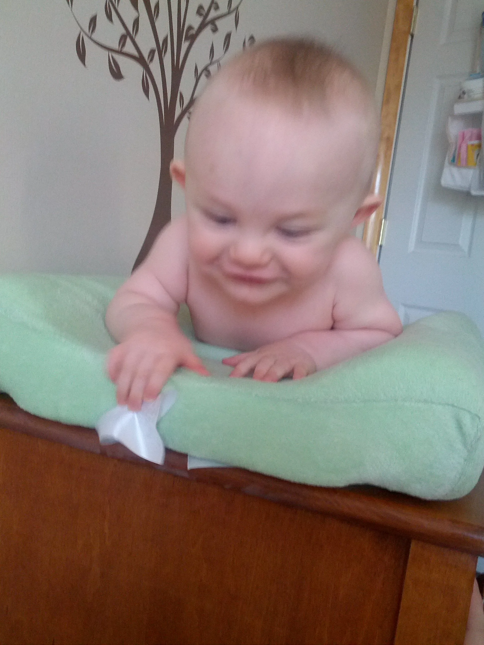 "Why do I even bother putting down toys? All he really wants are the tiles." P.S. This is one of my favorite pictures of all time now. Crazy boy, exploring his world, big smile, one sock. :-)