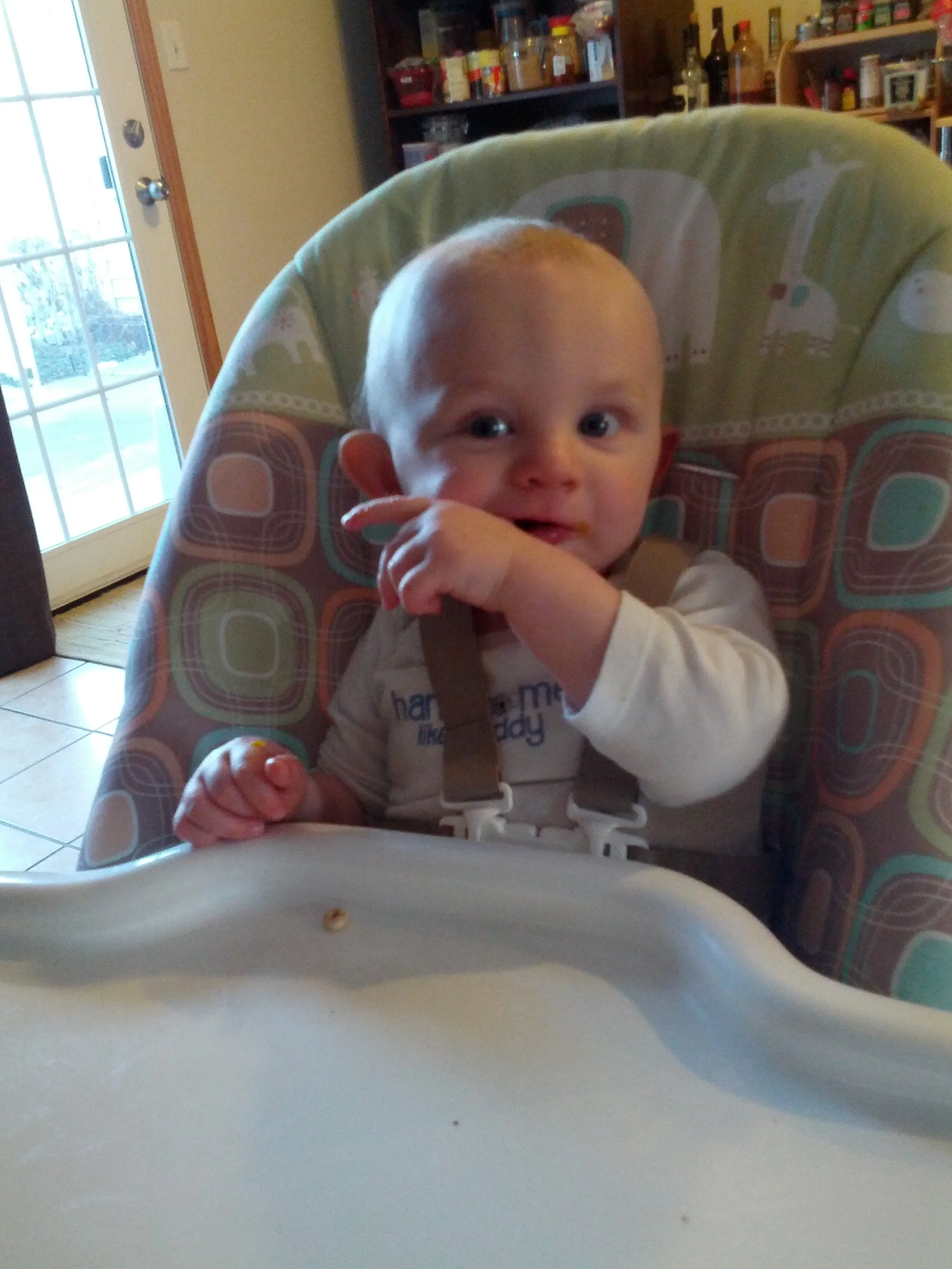 "Dad gave me a real good dinner! Applesauce and green beans but good thing he brought yogurt as a backup because I was not digging green beans. Dad even mashed up some of the butternut squash he had on his plate and shared with me!"