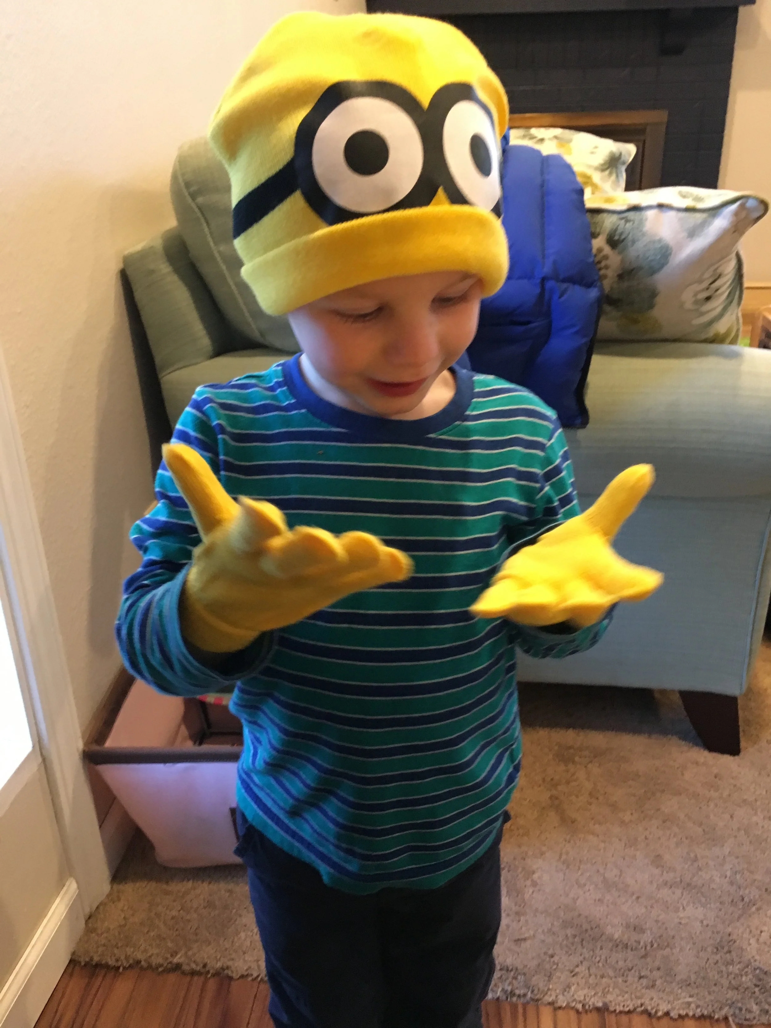 The minion gloves & hat from Uncle Mark & Aunt Sandy nearly fit!