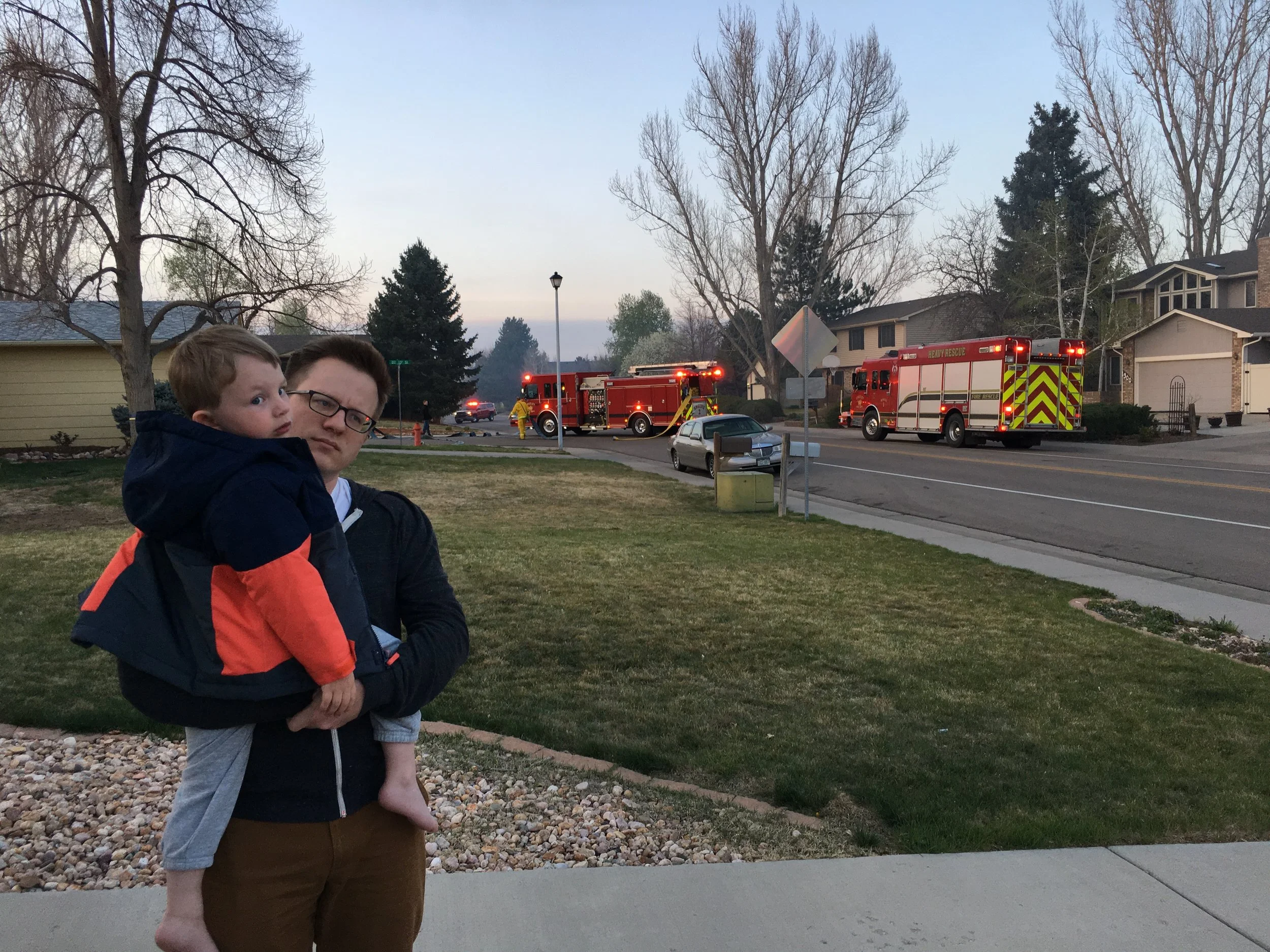 It’s nearly bedtime, but there’s excitement in the neighborhood! Some of the dry grass in the park, behind the houses on the other side of our street, caught on fire. Fantastic response from our fire department and lots of fun for G to see the trucks so close.