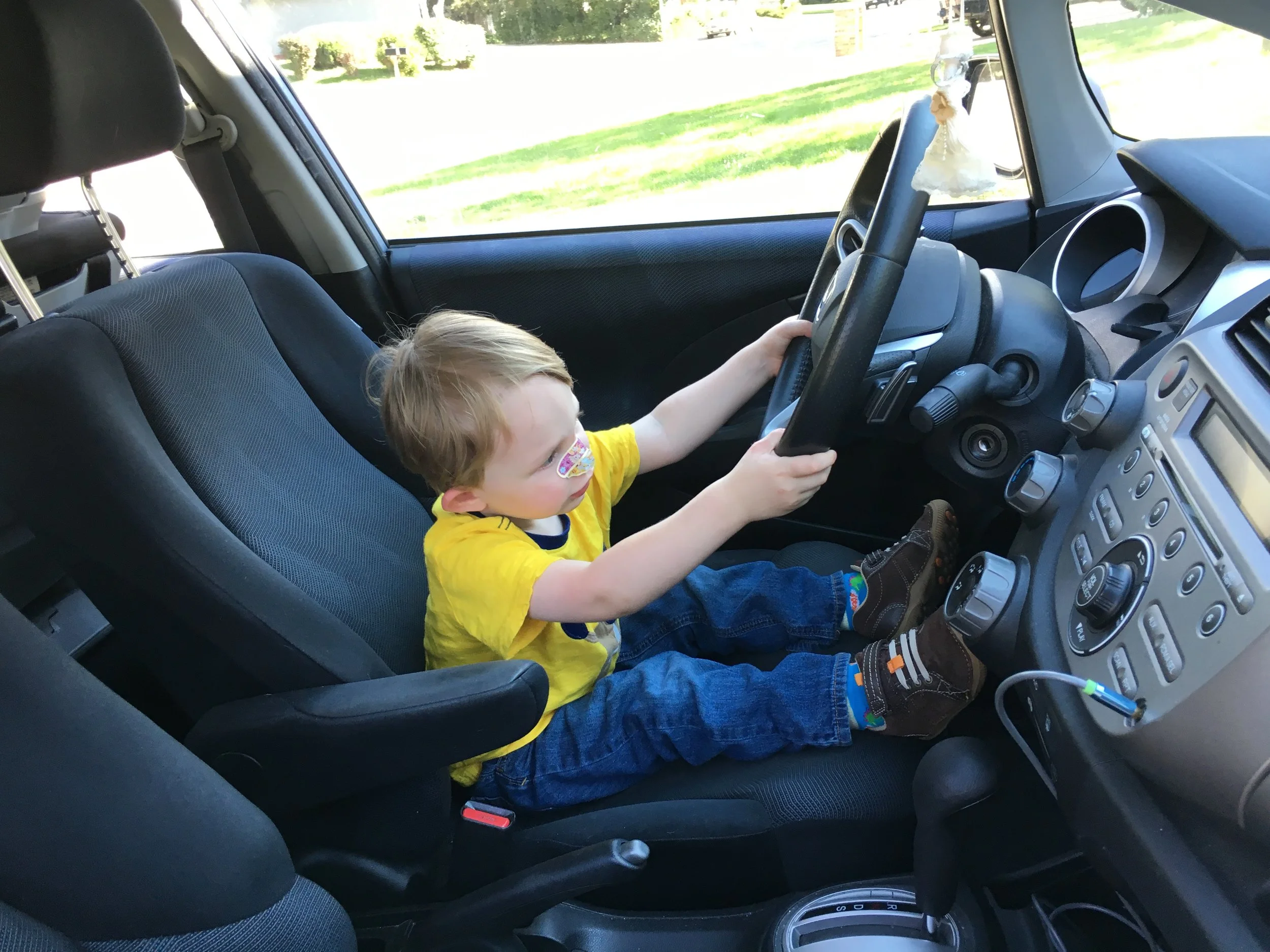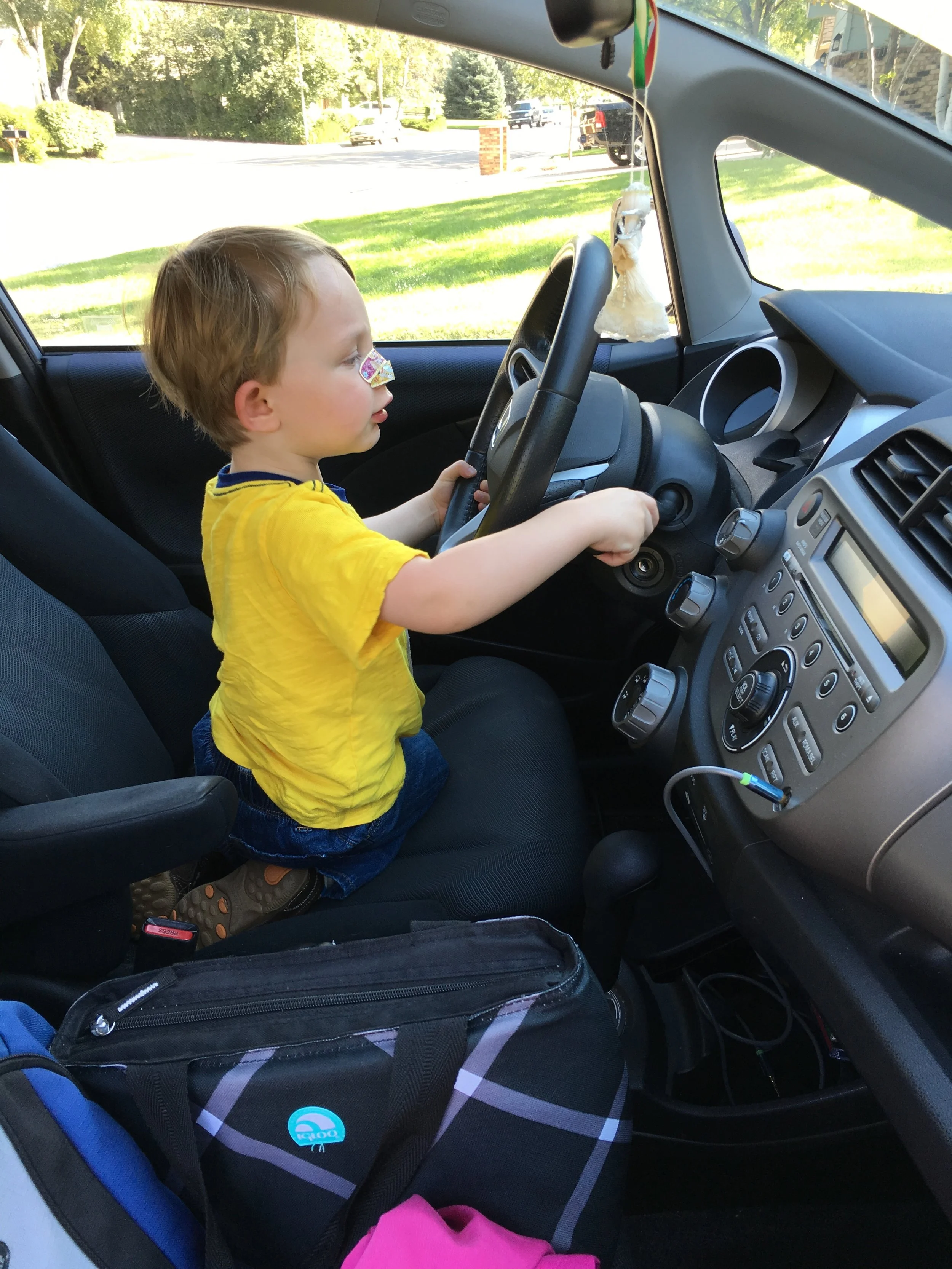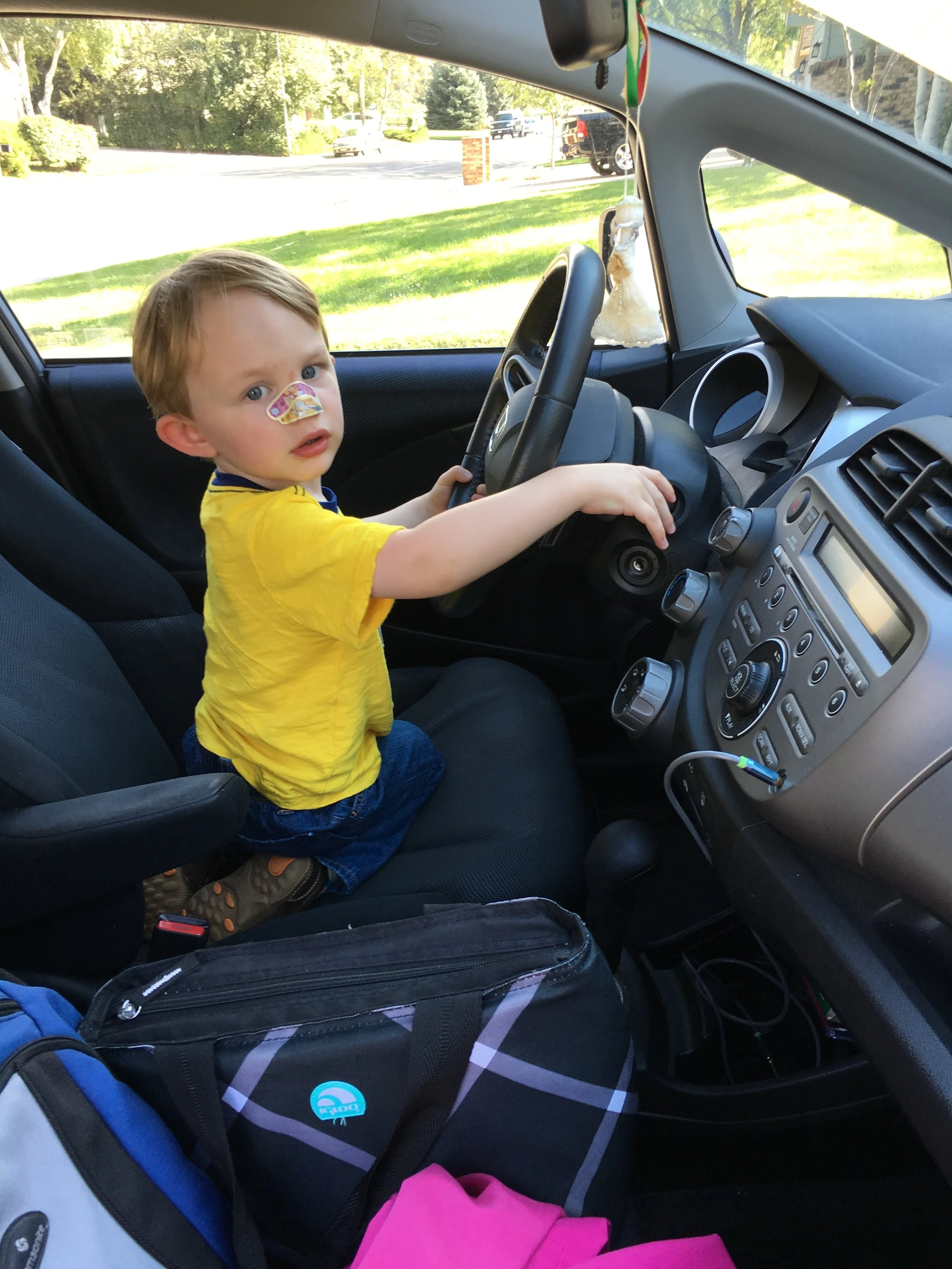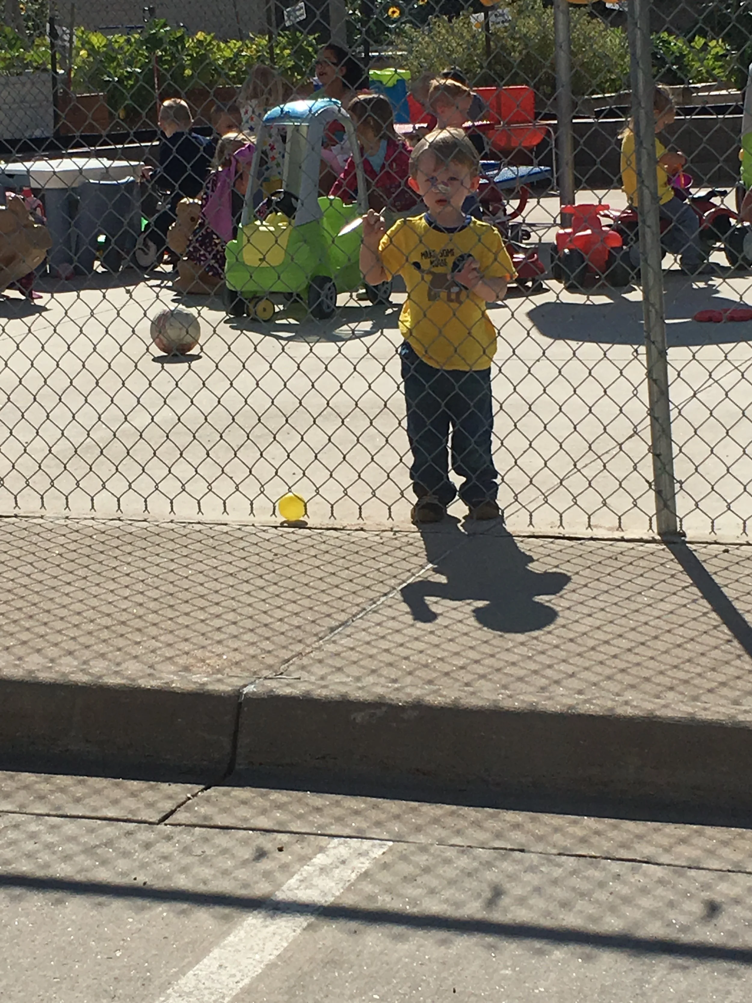 My regular view as I drive up to daycare (as soon as he sees my car). Granted, there is not normally a bandaid on his nose...