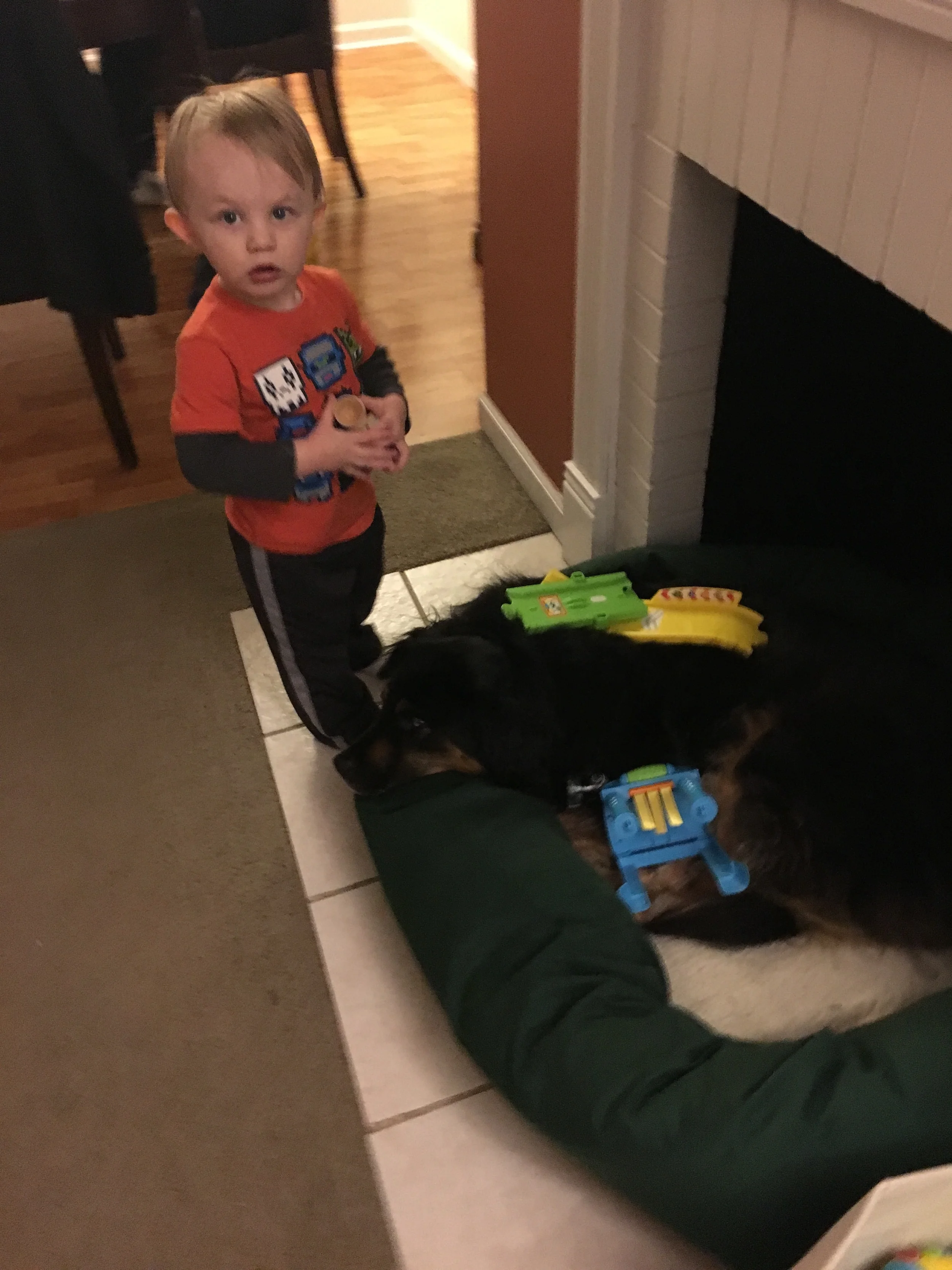 Gabriel has his own method of bonding with the puppy.