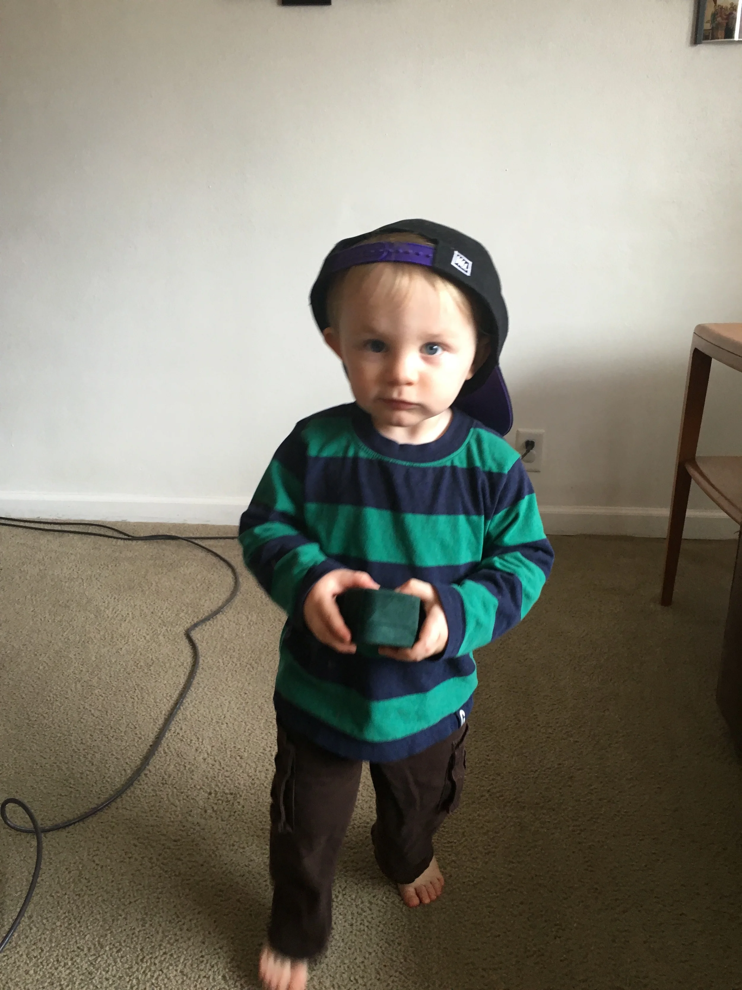 "What mama? I look awesome in dada's hat!"