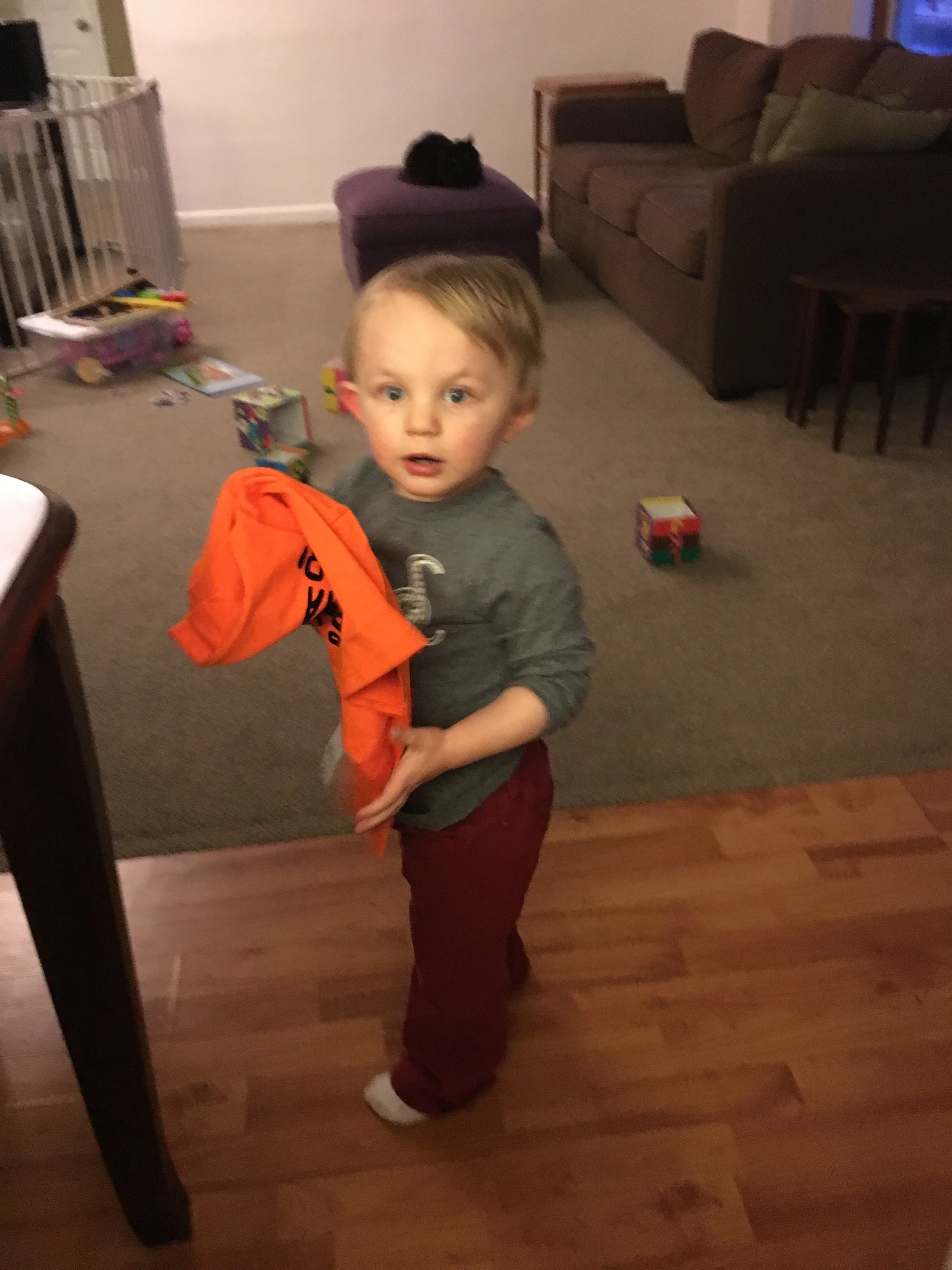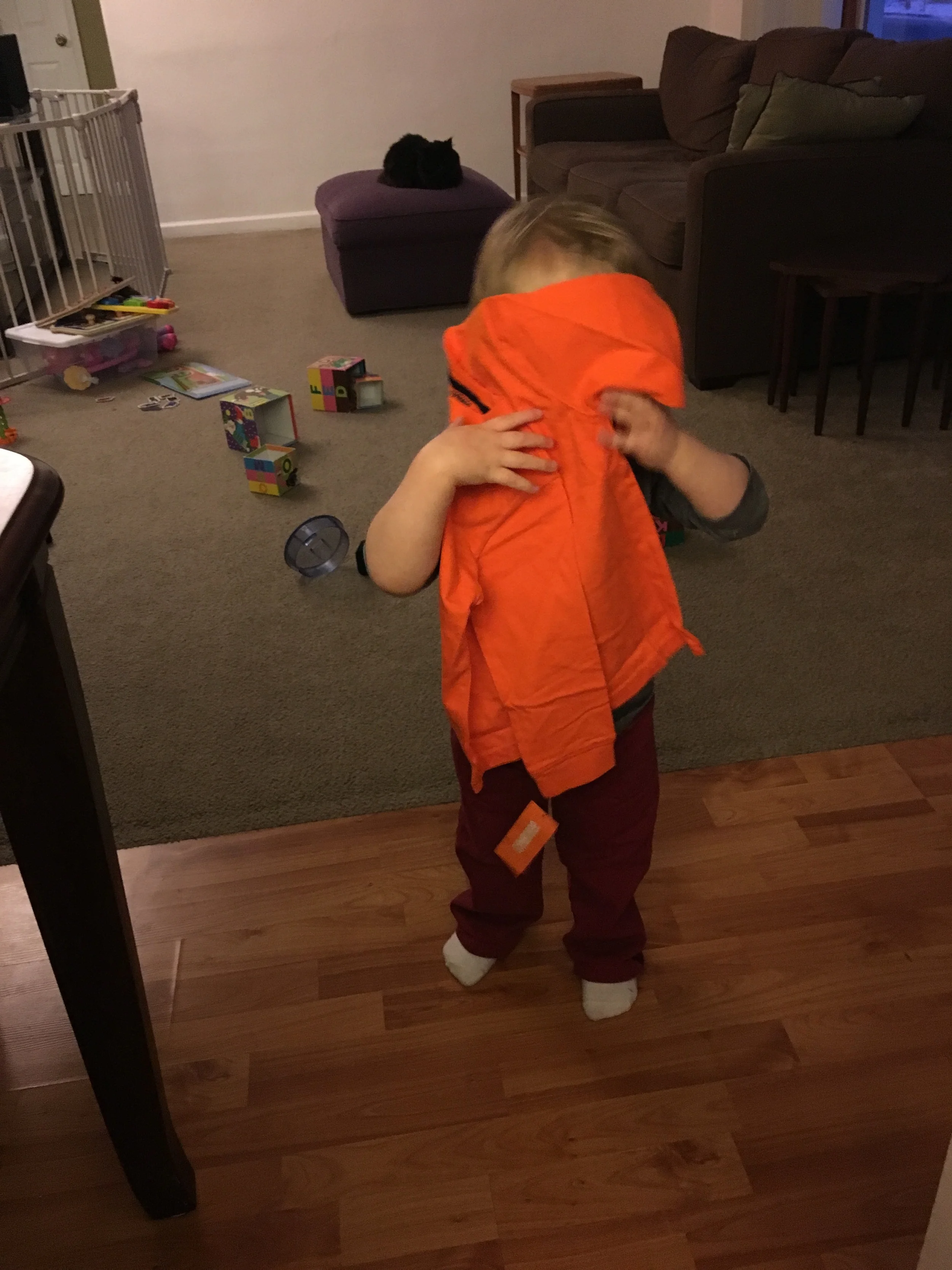 Gabriel got some new clothes in the mail from grandma and had great fun opening them.