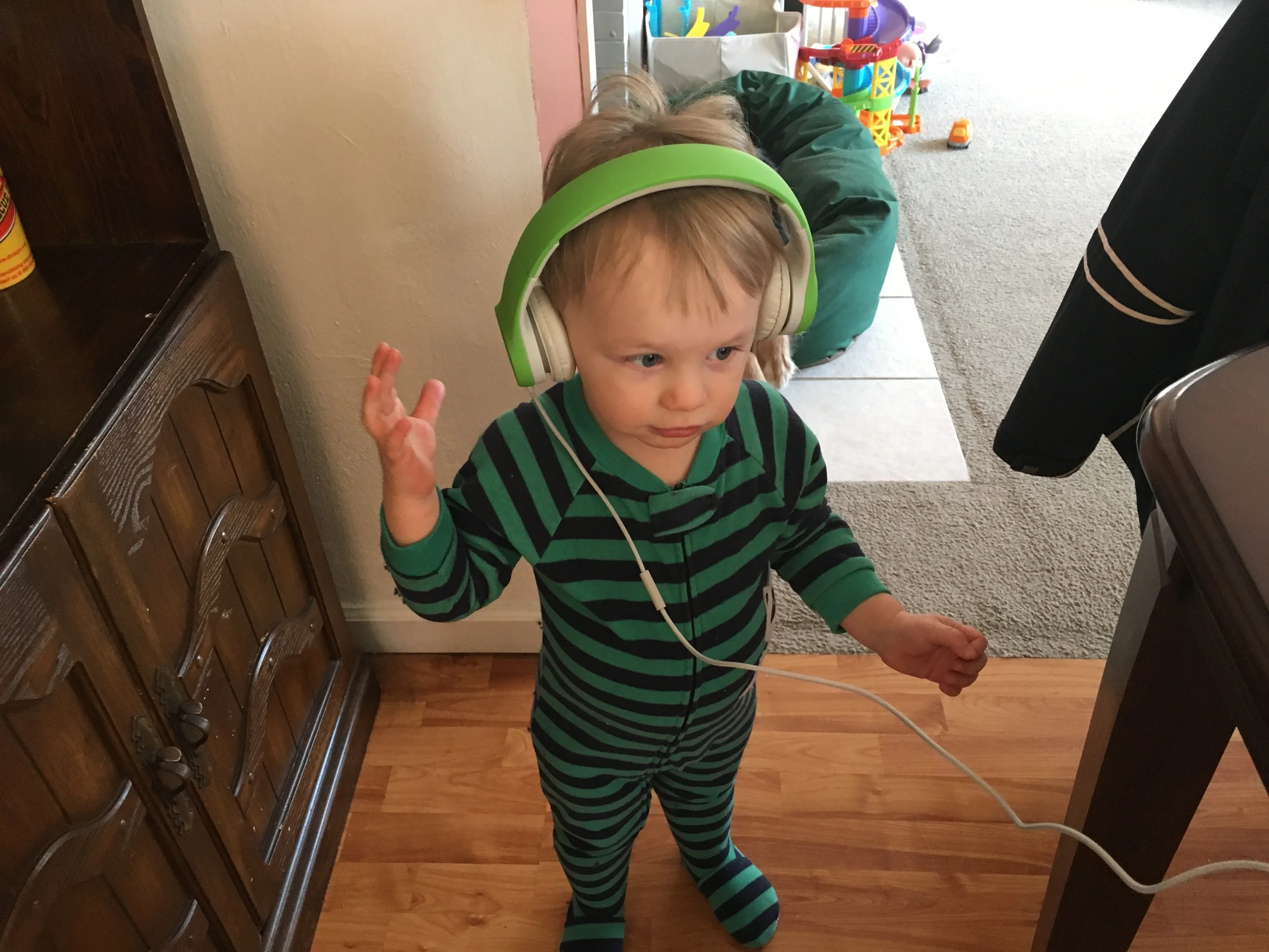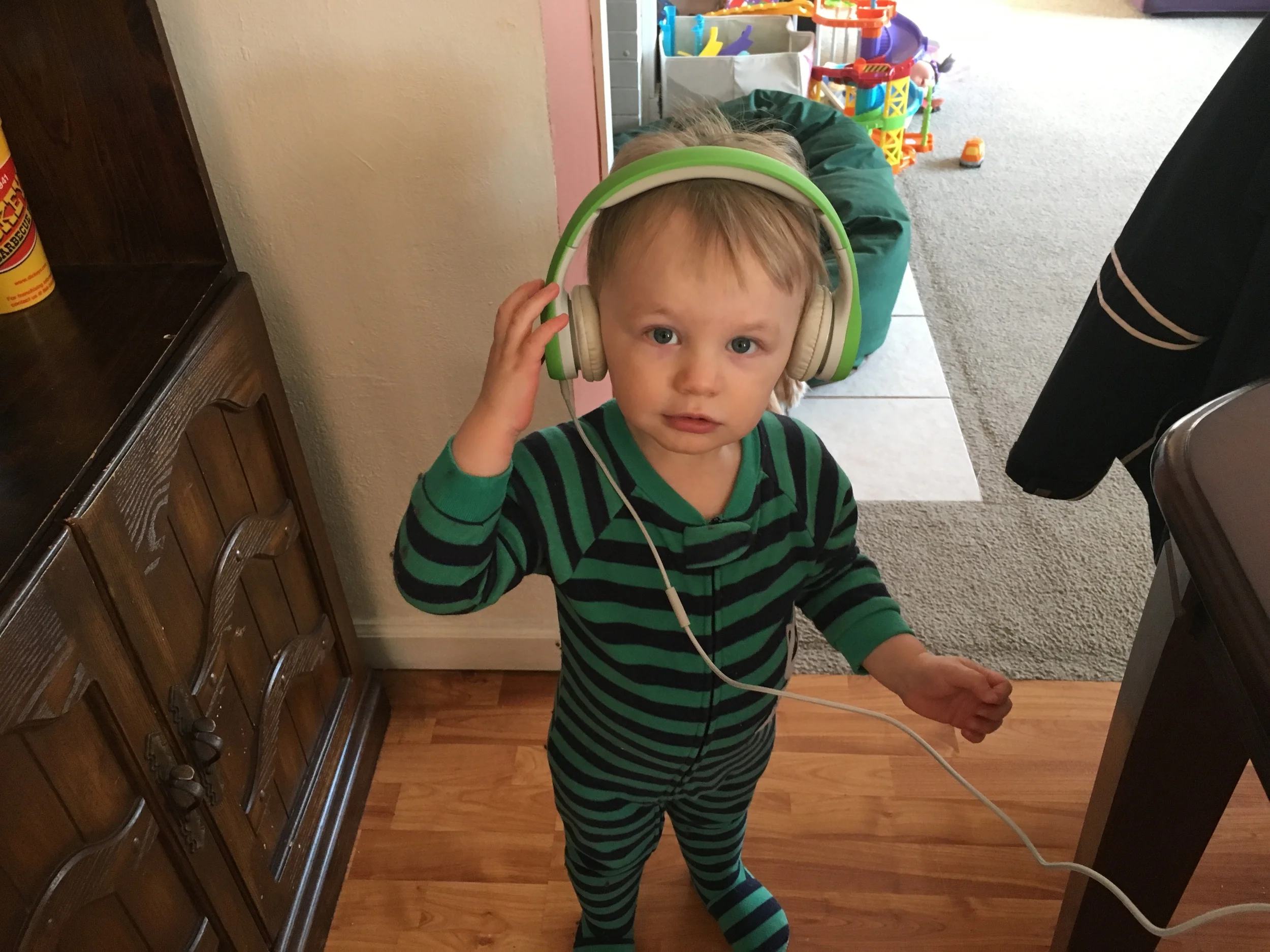 We're preparing for our house hunting trip to Colorado and Mr. G has his very own new pair of headphones. This was his first time trying them (yes, there's music playing) and he did really well! Not to mention he's adorable. ;-)