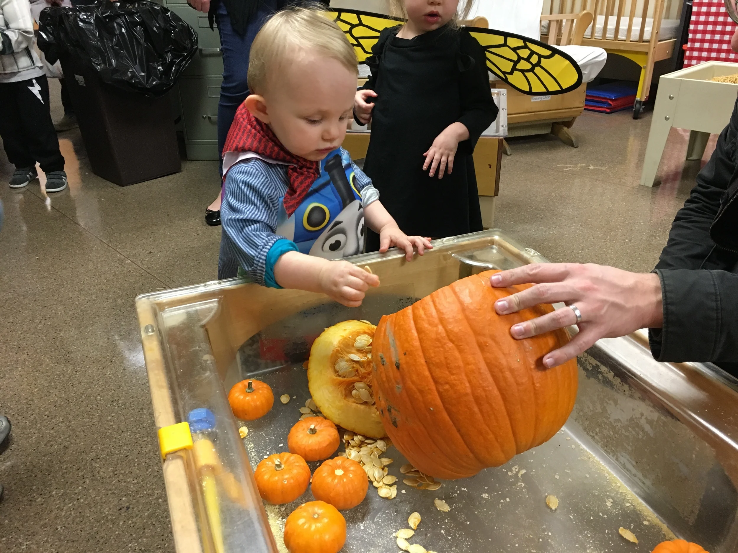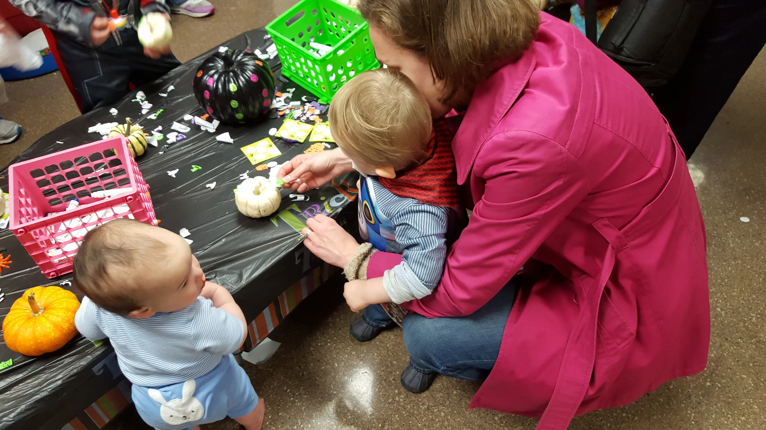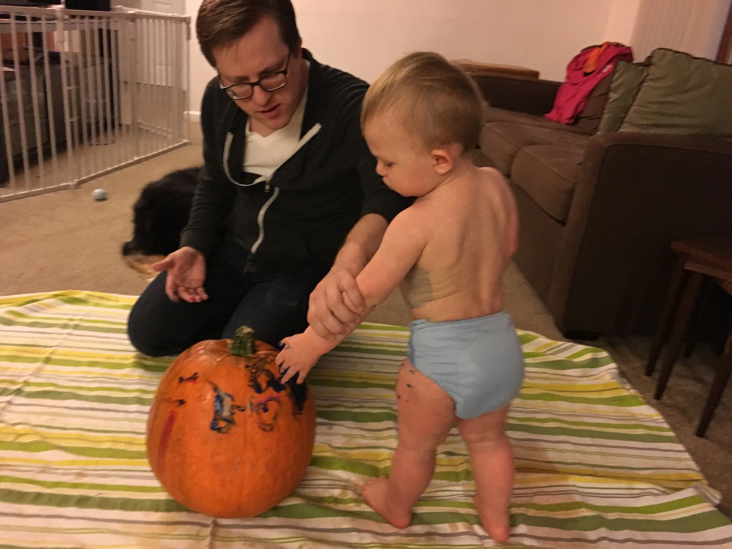 It's a good thing we had so many fun activities before Halloween. On Halloween Gabriel was still fighting off his amoxicillin rash and feeling really puny. Plus, it was a terribly blustery day so going outside was not the best option for our little man. So while kids came to the door we entertained them with pumpkin painting.