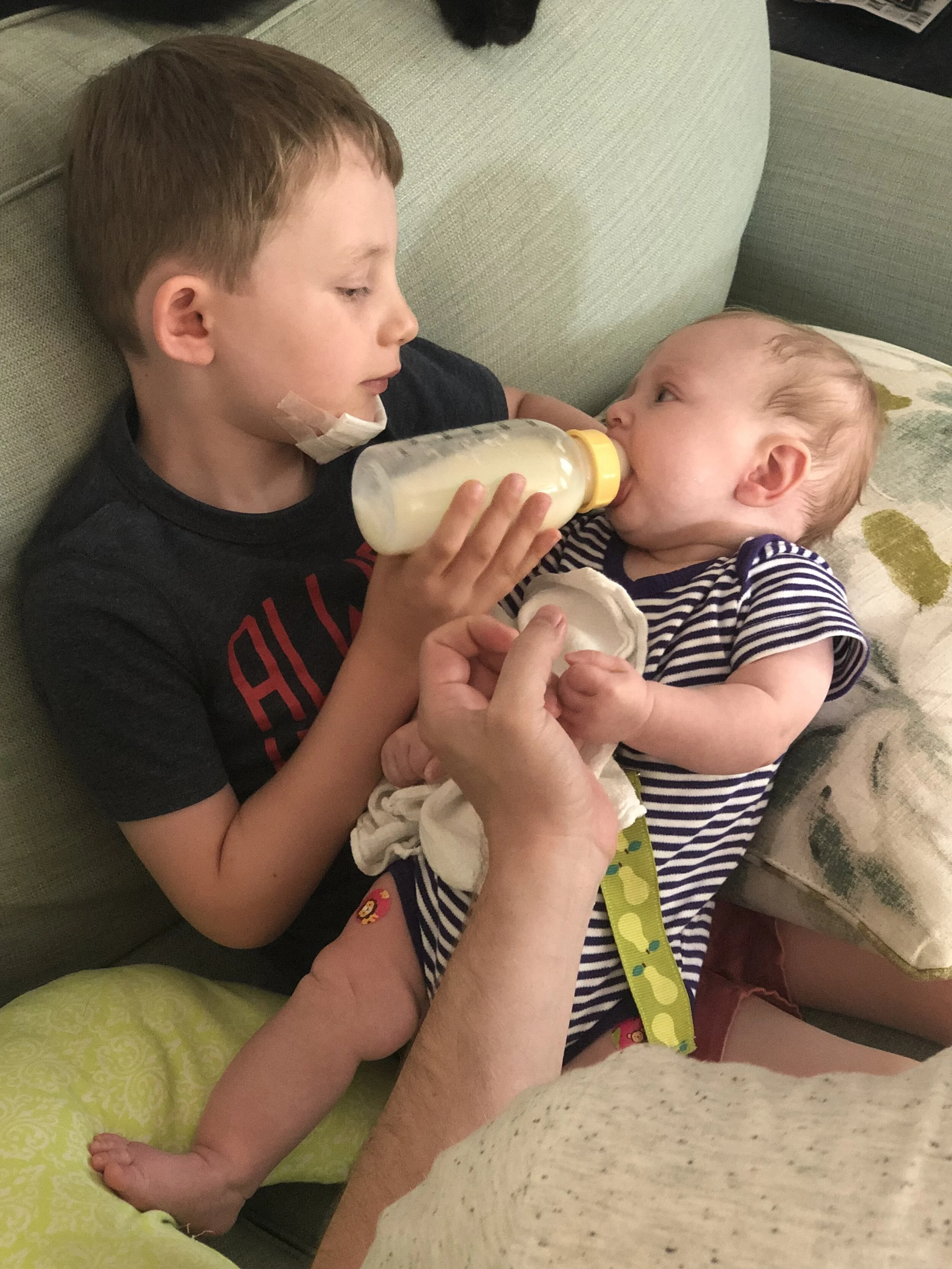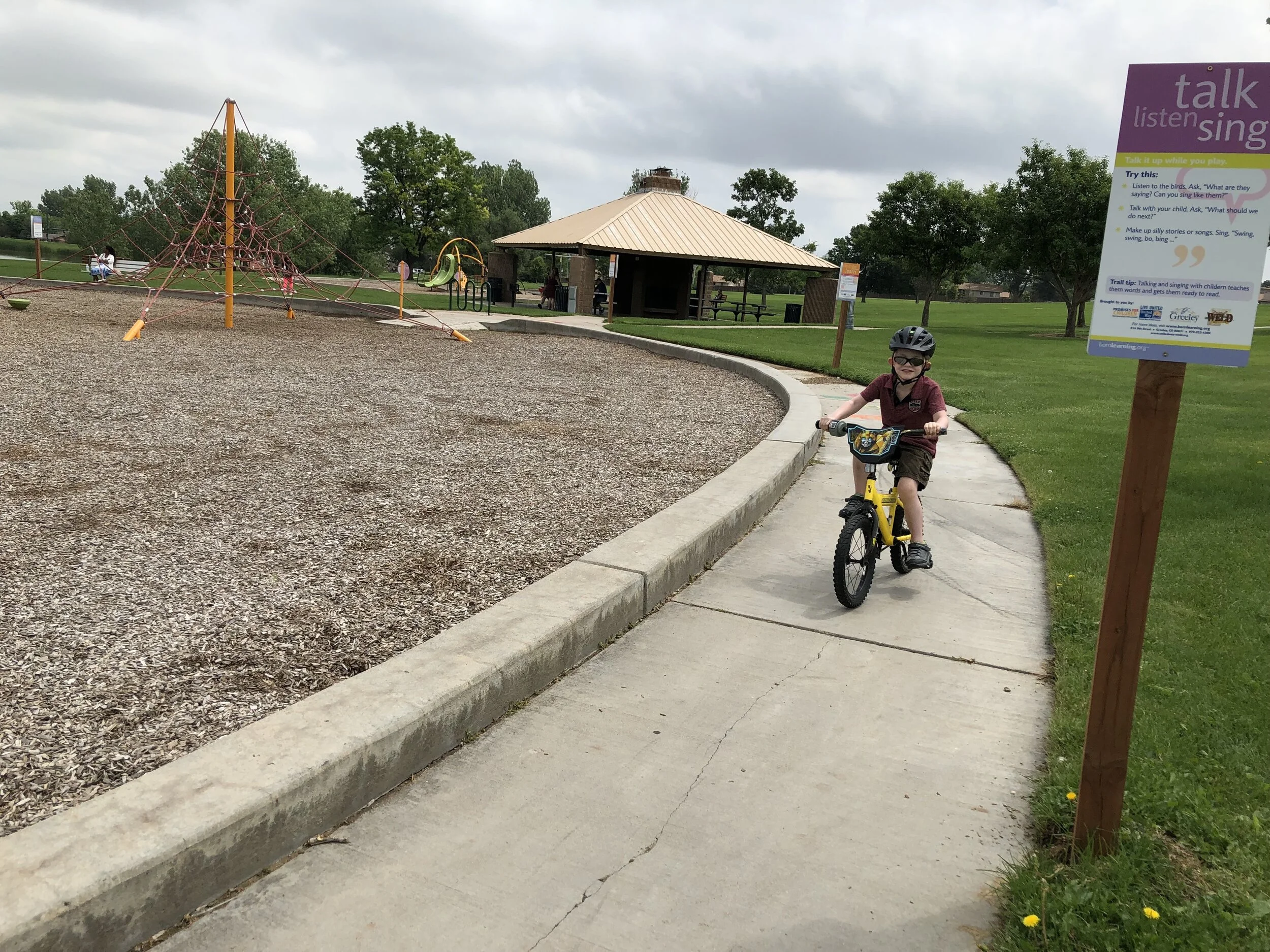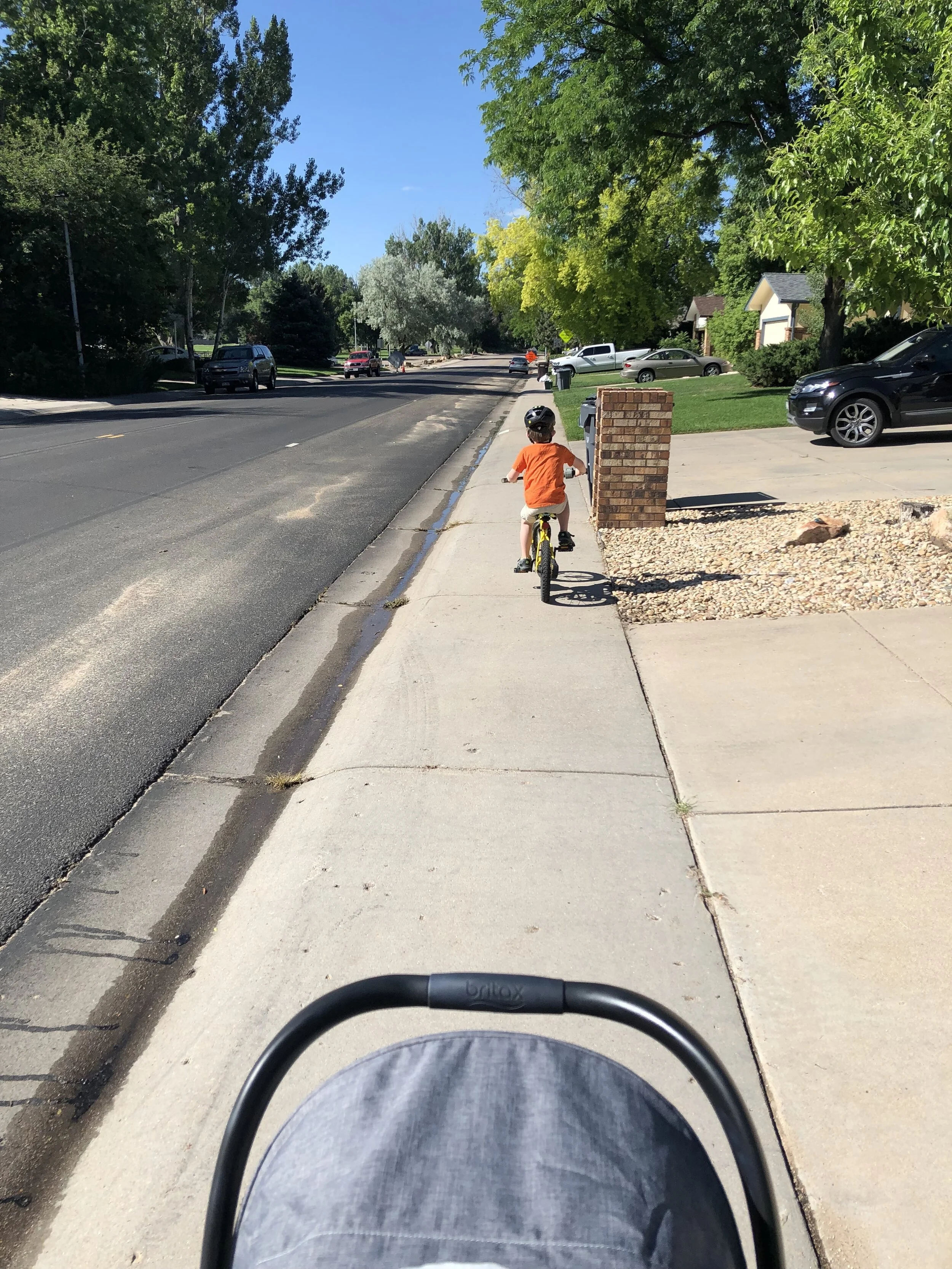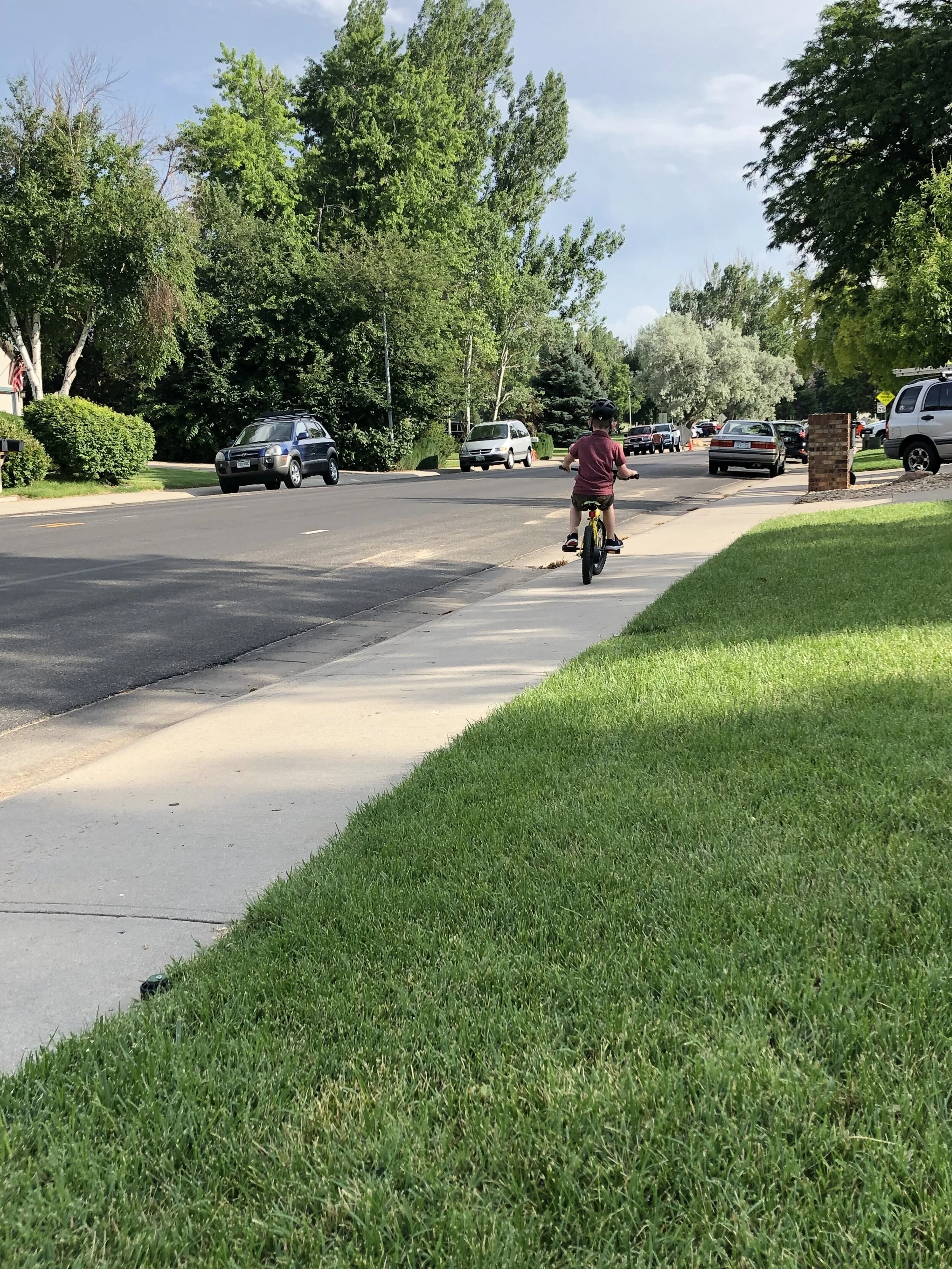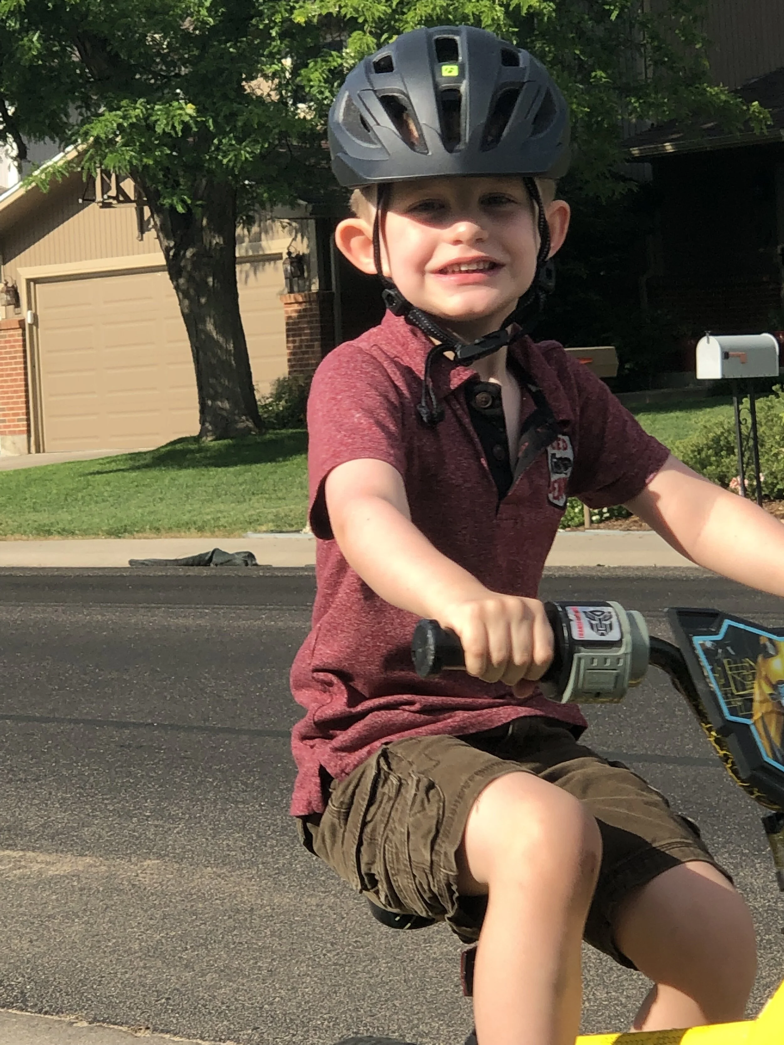 All that awesome bike riding took a little turn. Too fast down the hill in our park, not real confident using the pedal brakes yet, dragged his toes to slow himself down, & went right over the handlebars. Poor dad was on his own bike, 20 feet behind, watching it happen. Landed right on his chin, popped up immediately screaming & crying. First trip to the ER (pretty sure it won’t be the last). Total damage: 4 stitches in chin, chipped tooth, significant bites on both sides of tongue (this was actually the worst part because he couldn’t eat well for days), abrasion & bruise on knee/hip bone/elbow, and small bruise on forehead from helmet. The helmet definitely did it’s job - small scratches showing where it hit the ground and protected him. The very next day he wanted back on his bike (yay!!) but we had to say no because we needed to replace the helmet. Pretty good story and incredibly strong young man. We’re so proud of him. <3