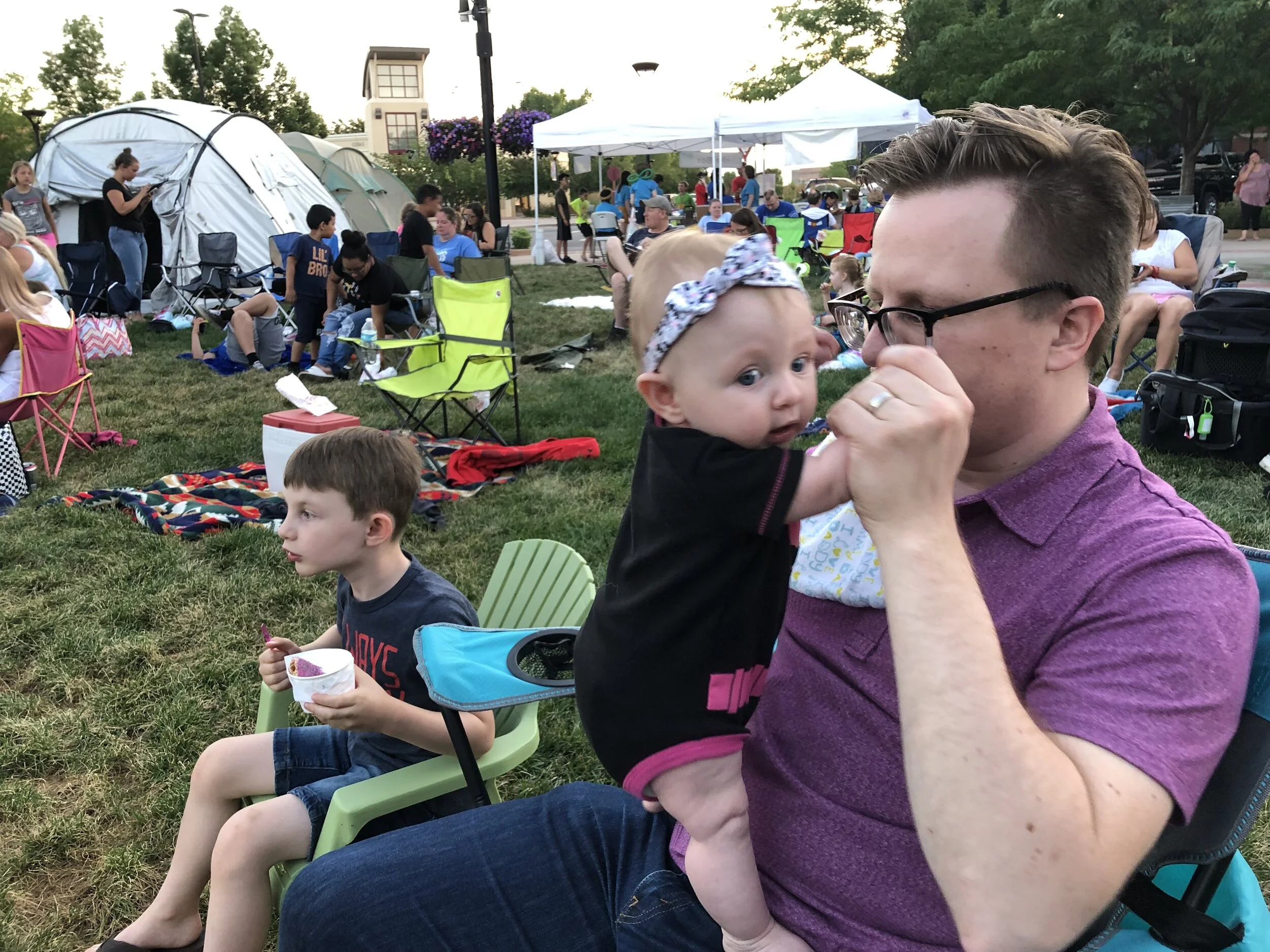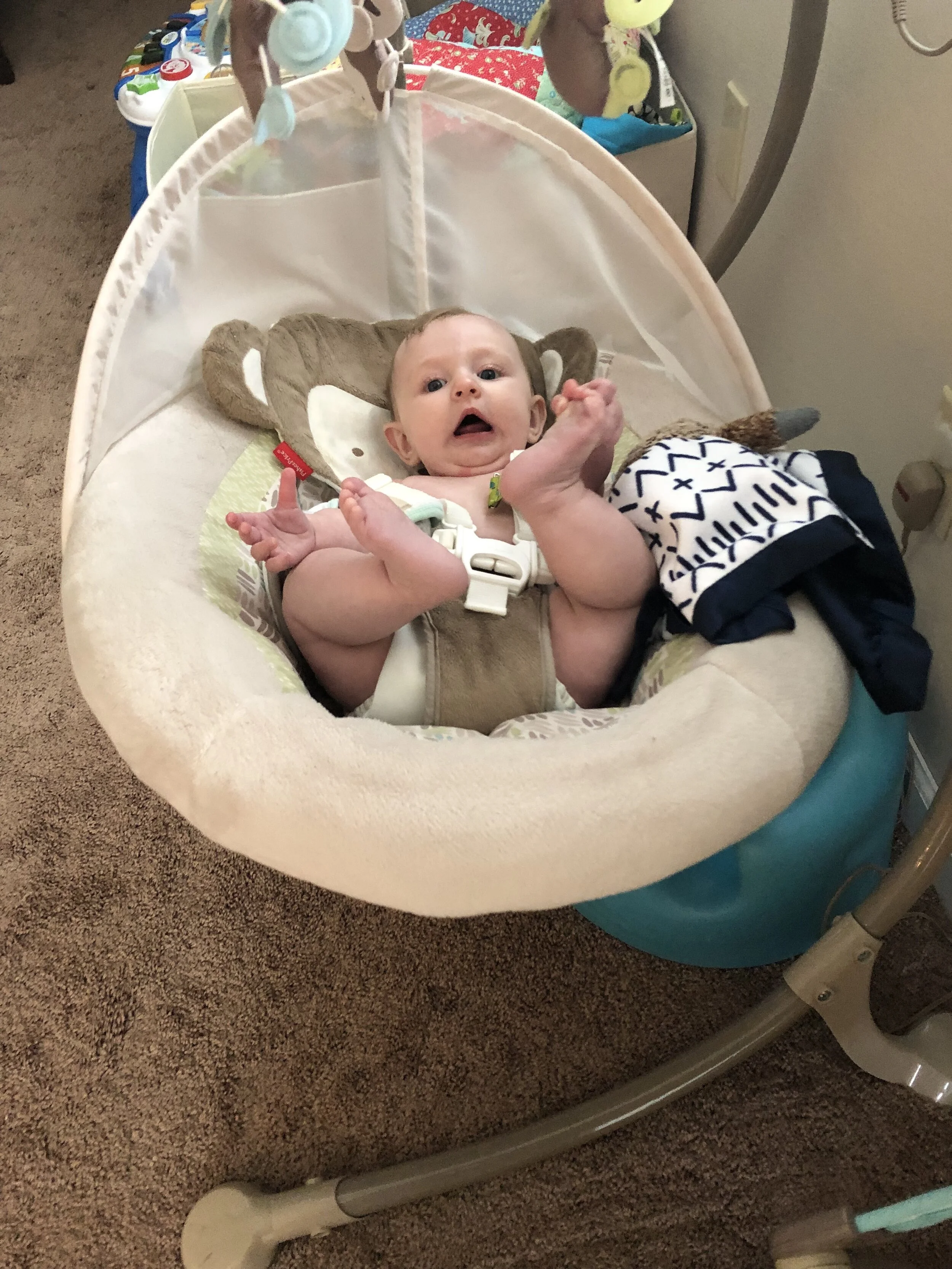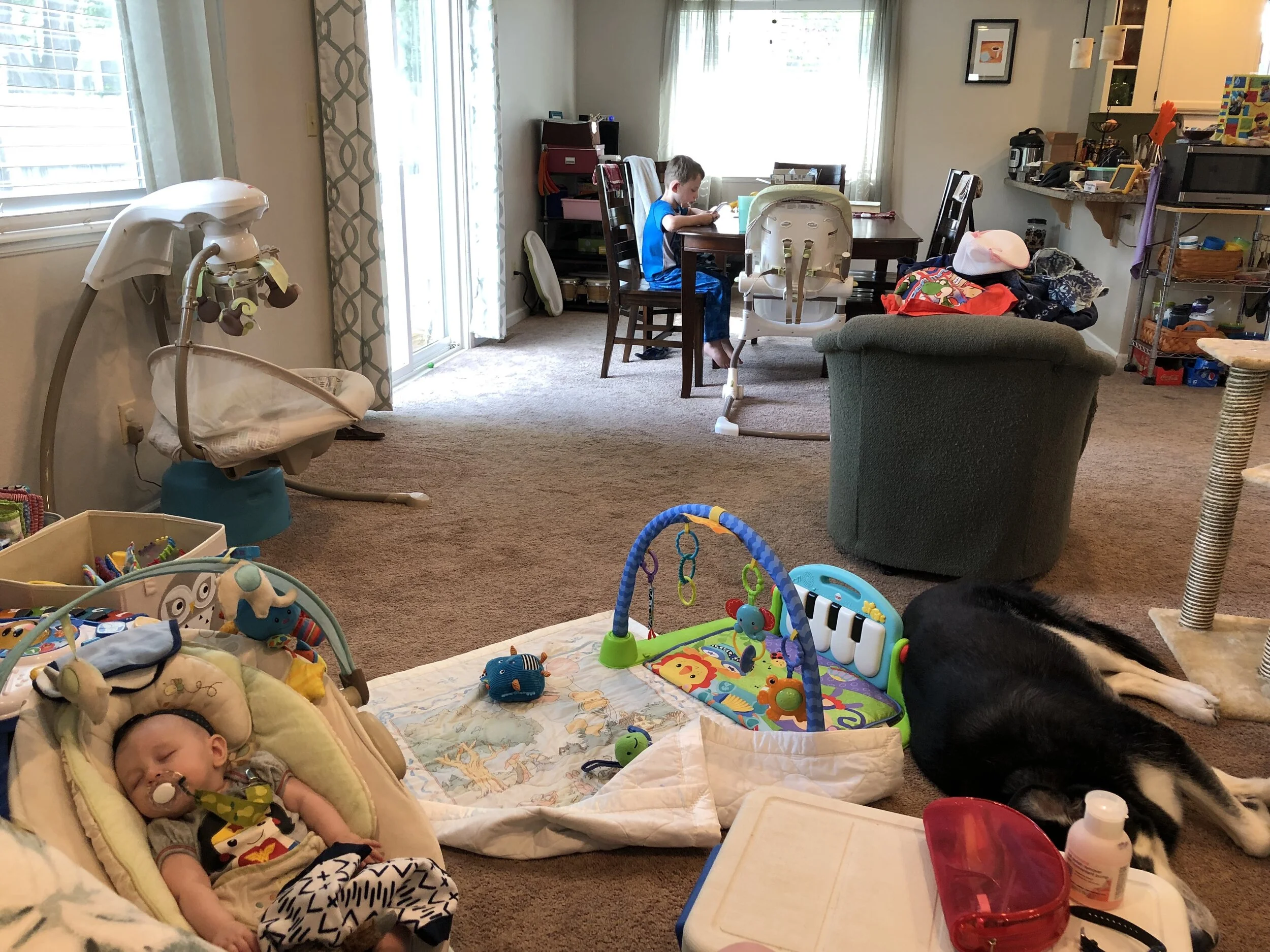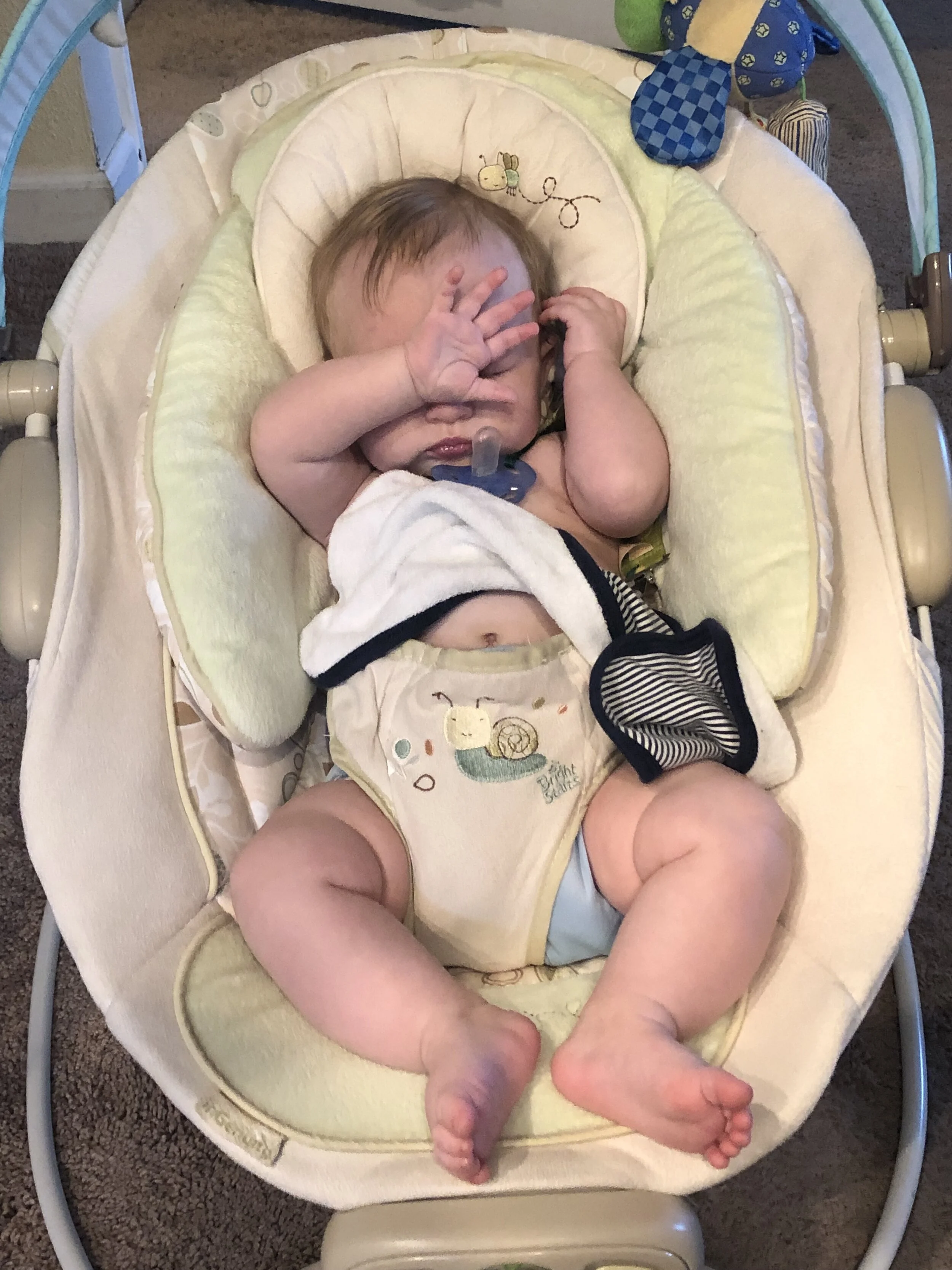All that awesome bike riding took a little turn. Too fast down the hill in our park, not real confident using the pedal brakes yet, dragged his toes to slow himself down, & went right over the handlebars. Poor dad was on his own bike, 20 feet behind, watching it happen. Landed right on his chin, popped up immediately screaming & crying. First trip to the ER (pretty sure it won’t be the last). Total damage: 4 stitches in chin, chipped tooth, significant bites on both sides of tongue (this was actually the worst part because he couldn’t eat well for days), abrasion & bruise on knee/hip bone/elbow, and small bruise on forehead from helmet. The helmet definitely did it’s job - small scratches showing where it hit the ground and protected him. The very next day he wanted back on his bike (yay!!) but we had to say no because we needed to replace the helmet. Pretty good story and incredibly strong young man. We’re so proud of him. <3