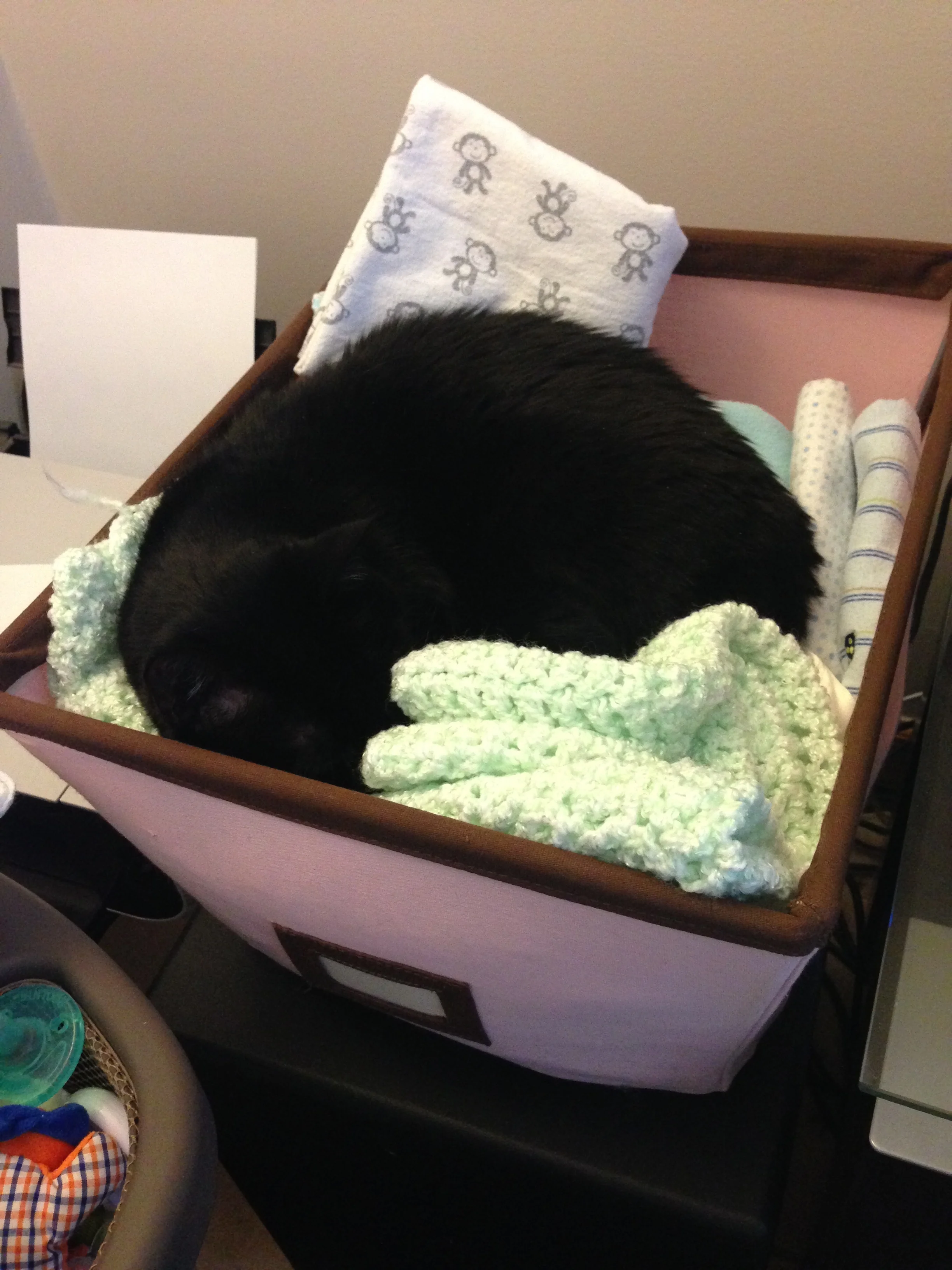 You probably know Pounce & Poco have been with us since just after we got married. They were our first "babies." We were uncertain how they would react to Gabriel joining the family but they've been very good, or at least ambivalent. But they are cats - so EVERY new item that came in the house needed their inspection. And the new soft places to lay are definitely enticing. Here are a few pictures of their inspections and shenanigans.
