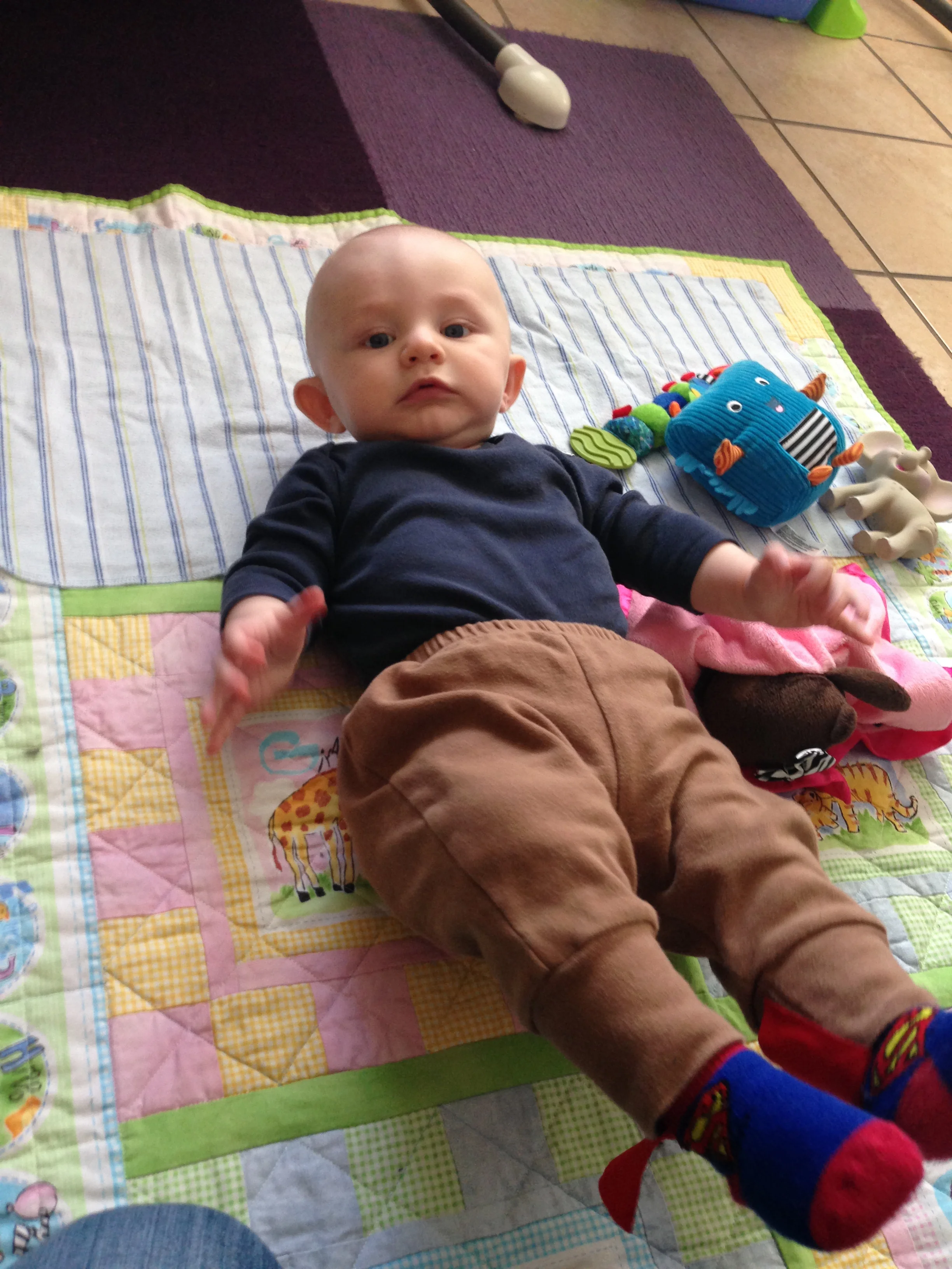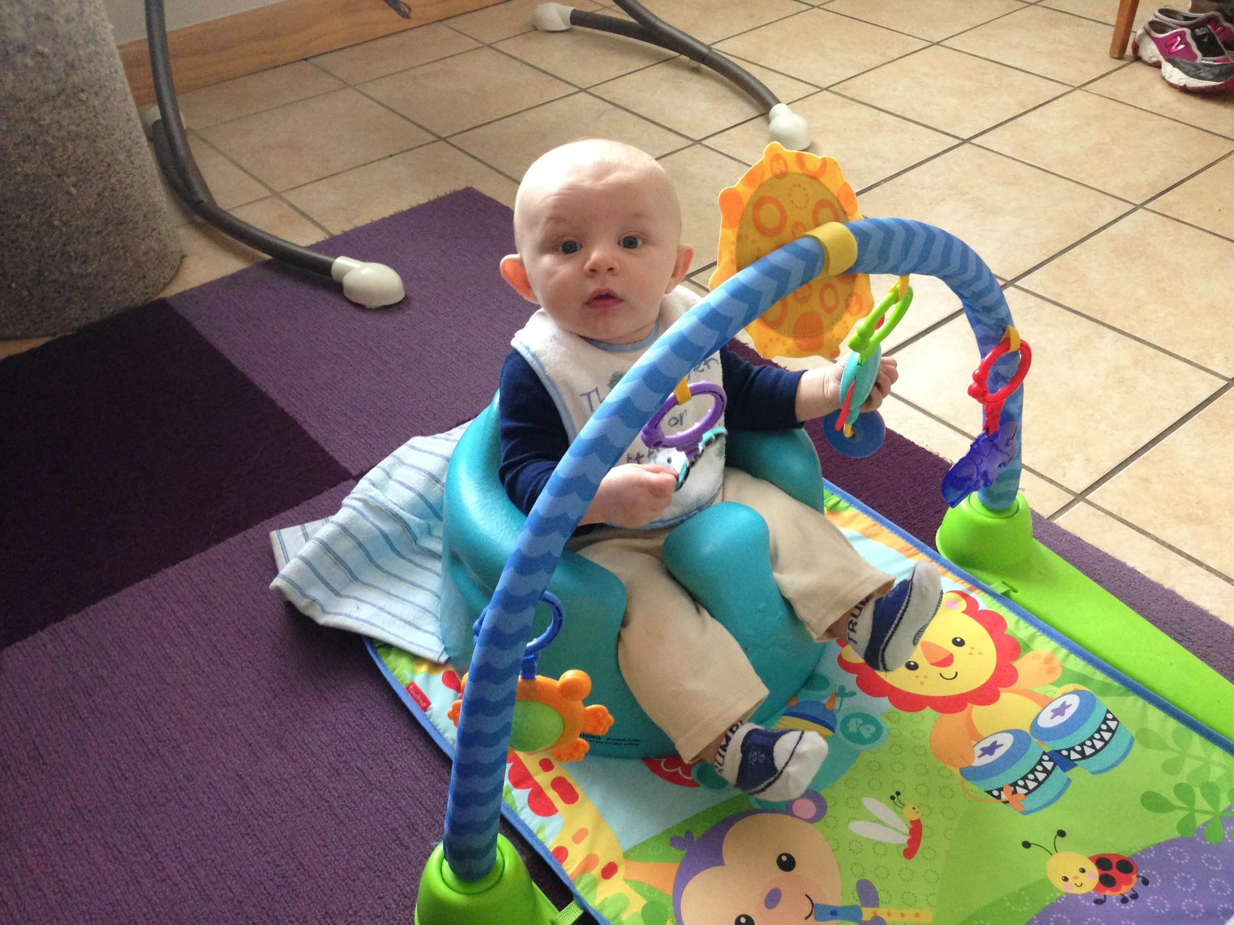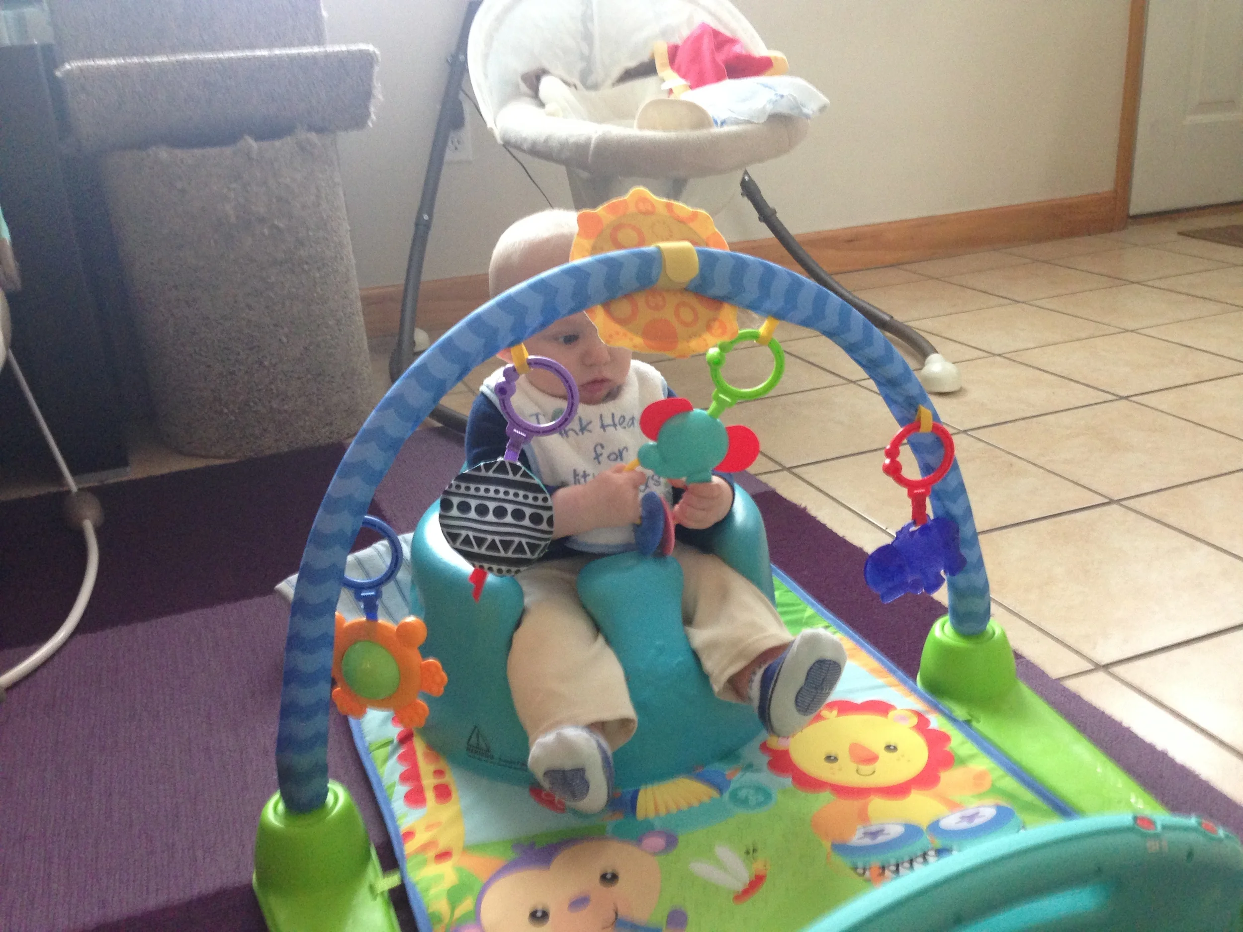A new formation of old toys. The Bumbo chair is perfect for helping him sit up and play with these toys from a new perspective.