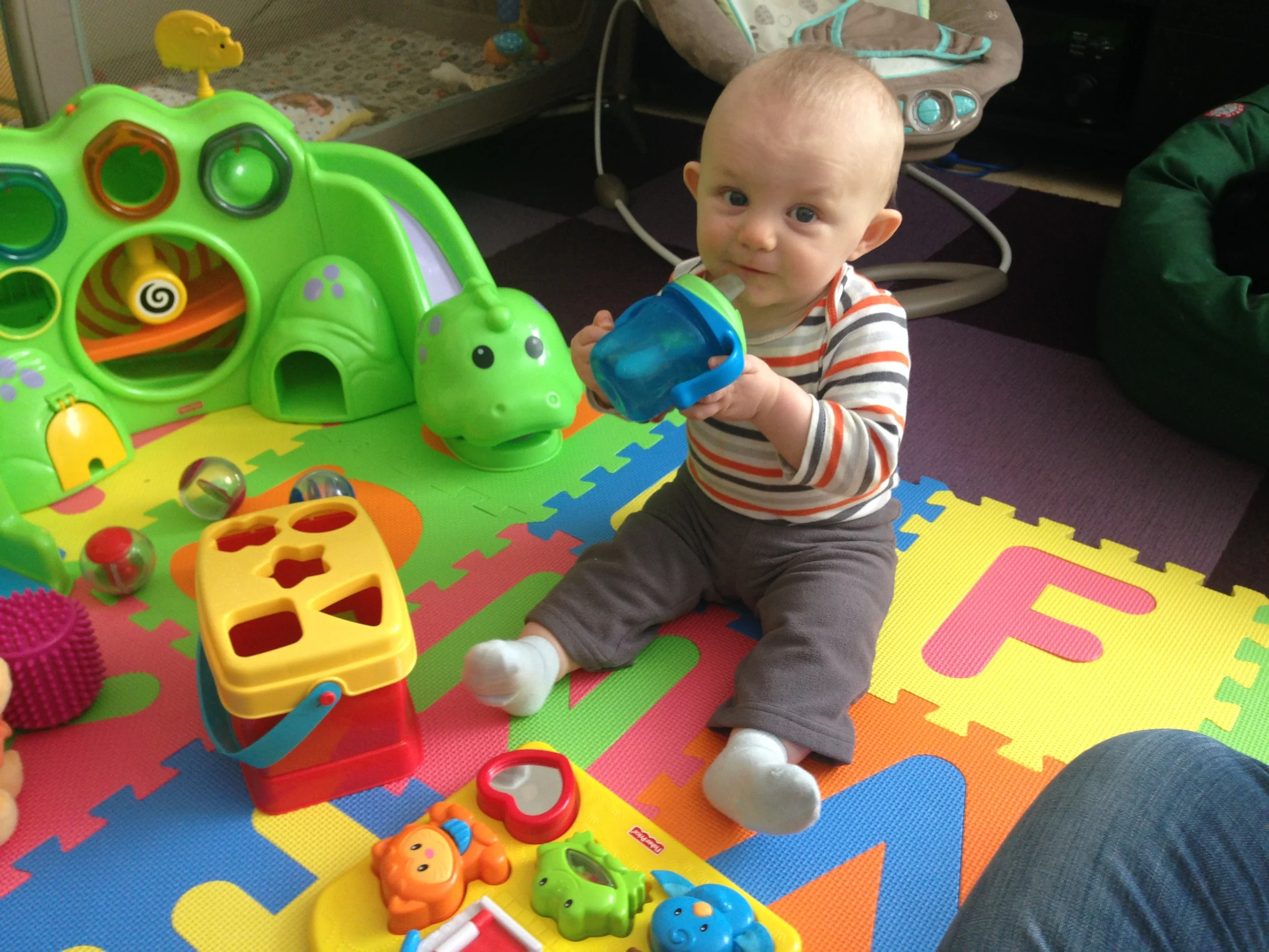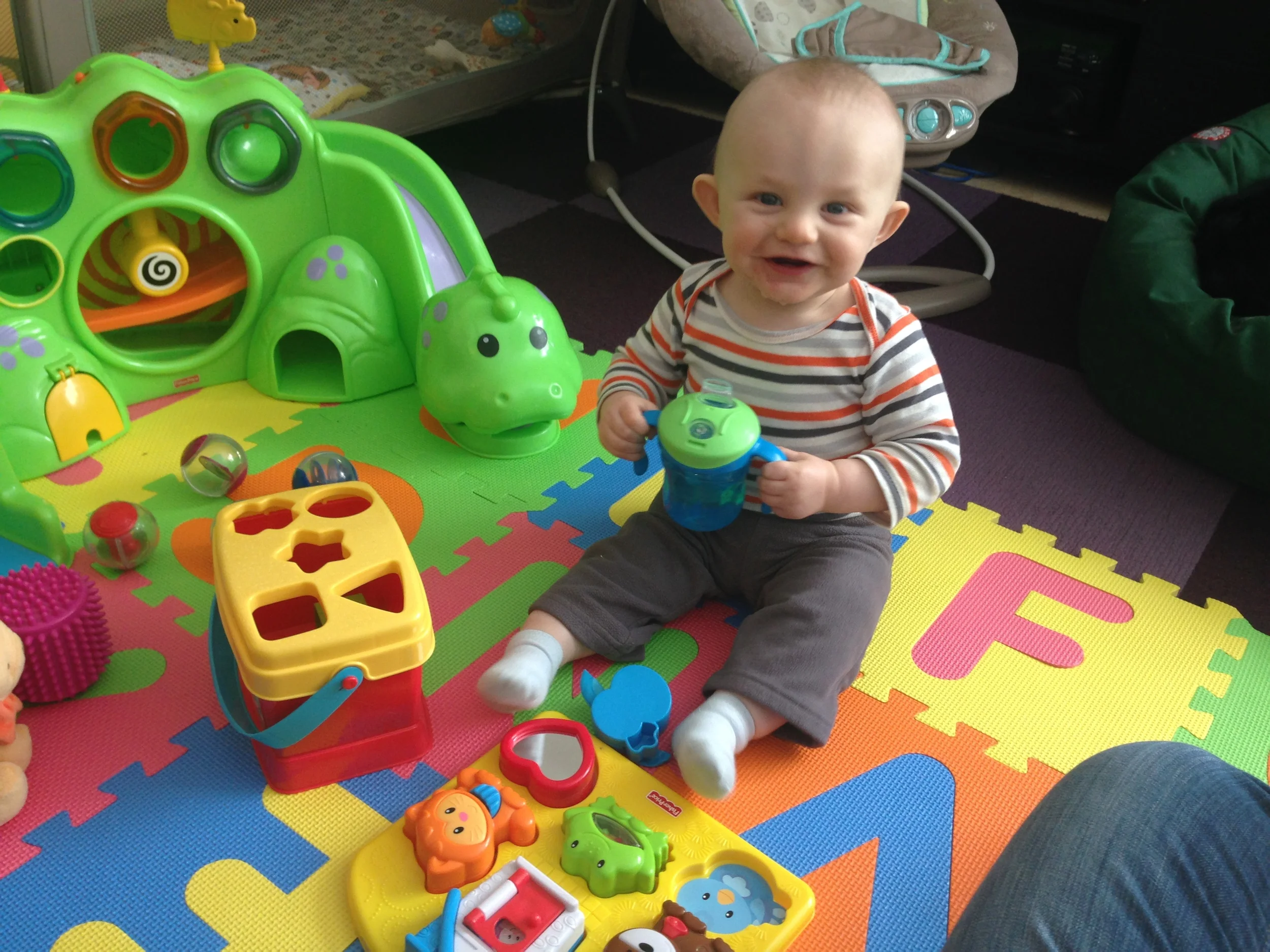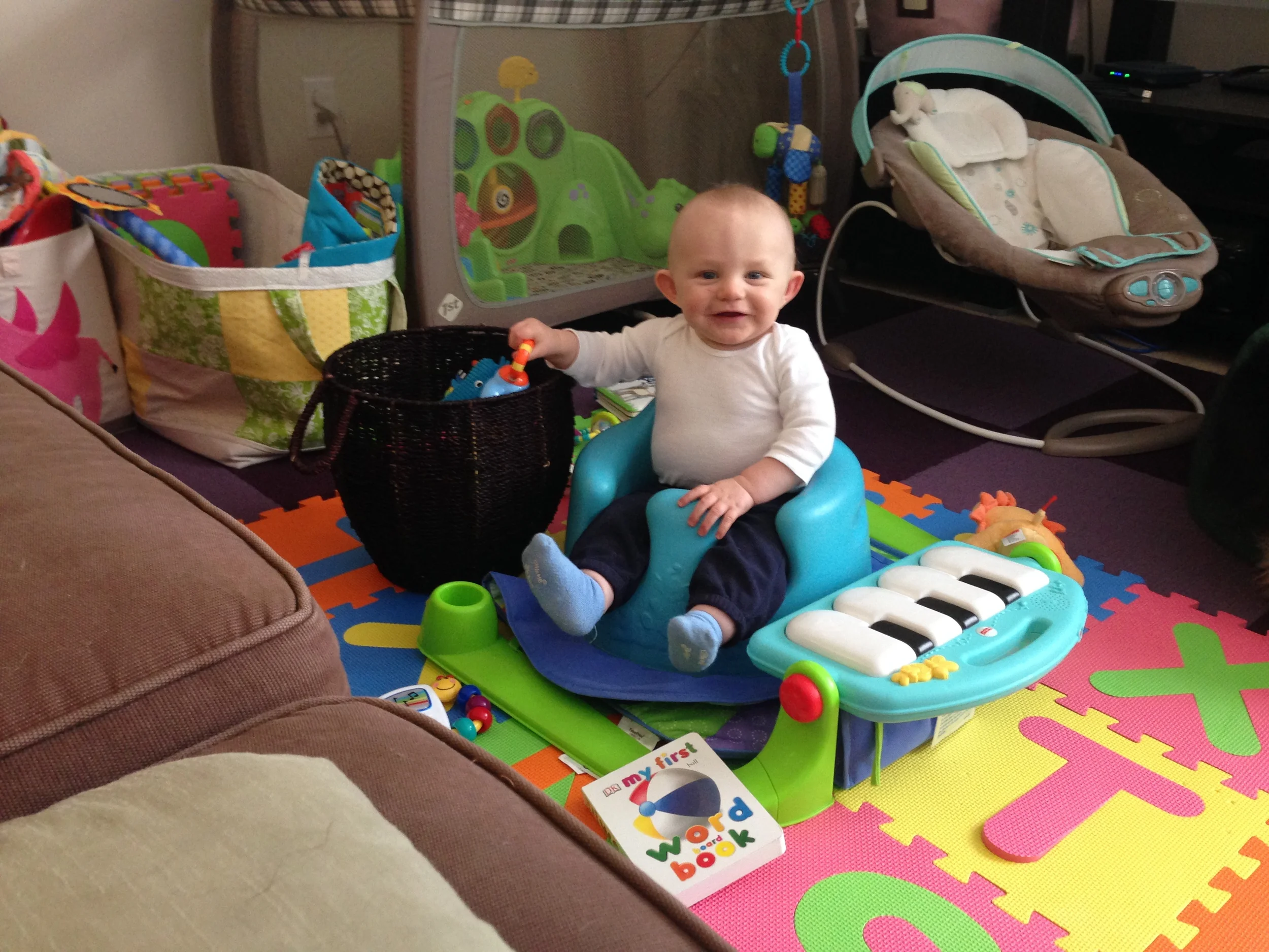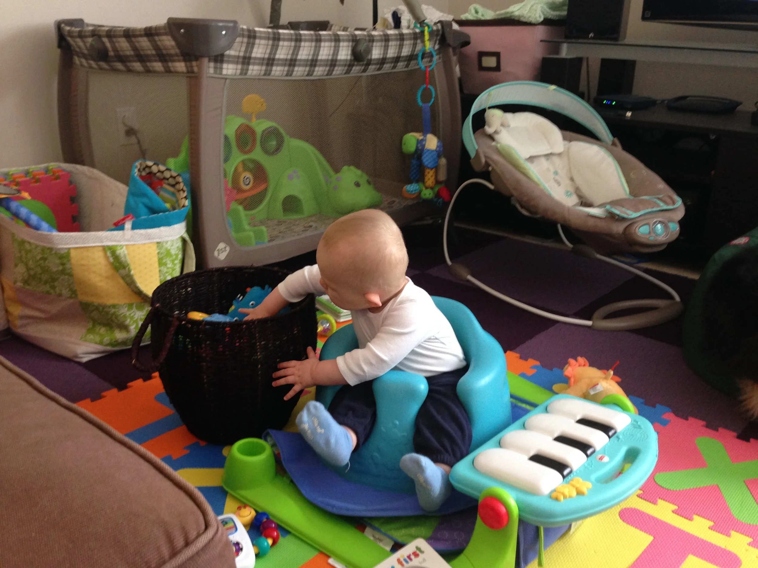 Reaching into the basket is a new favorite thing. I sit the basket next to him while he's in the Boppy chair or his bouncy chair or even just sitting on the floor. Bouncy chair + basket of toys is great fun while I'm teaching lessons.