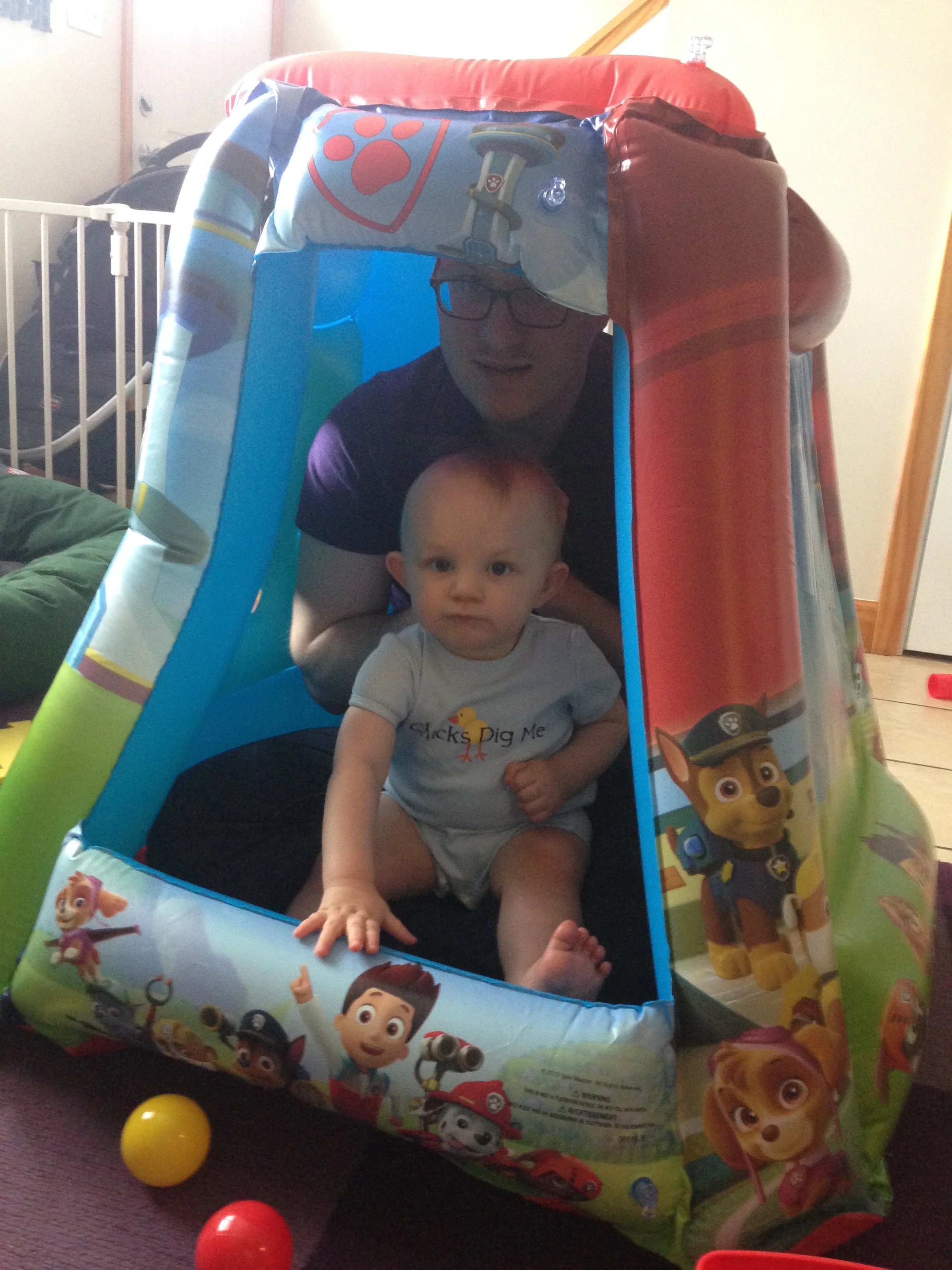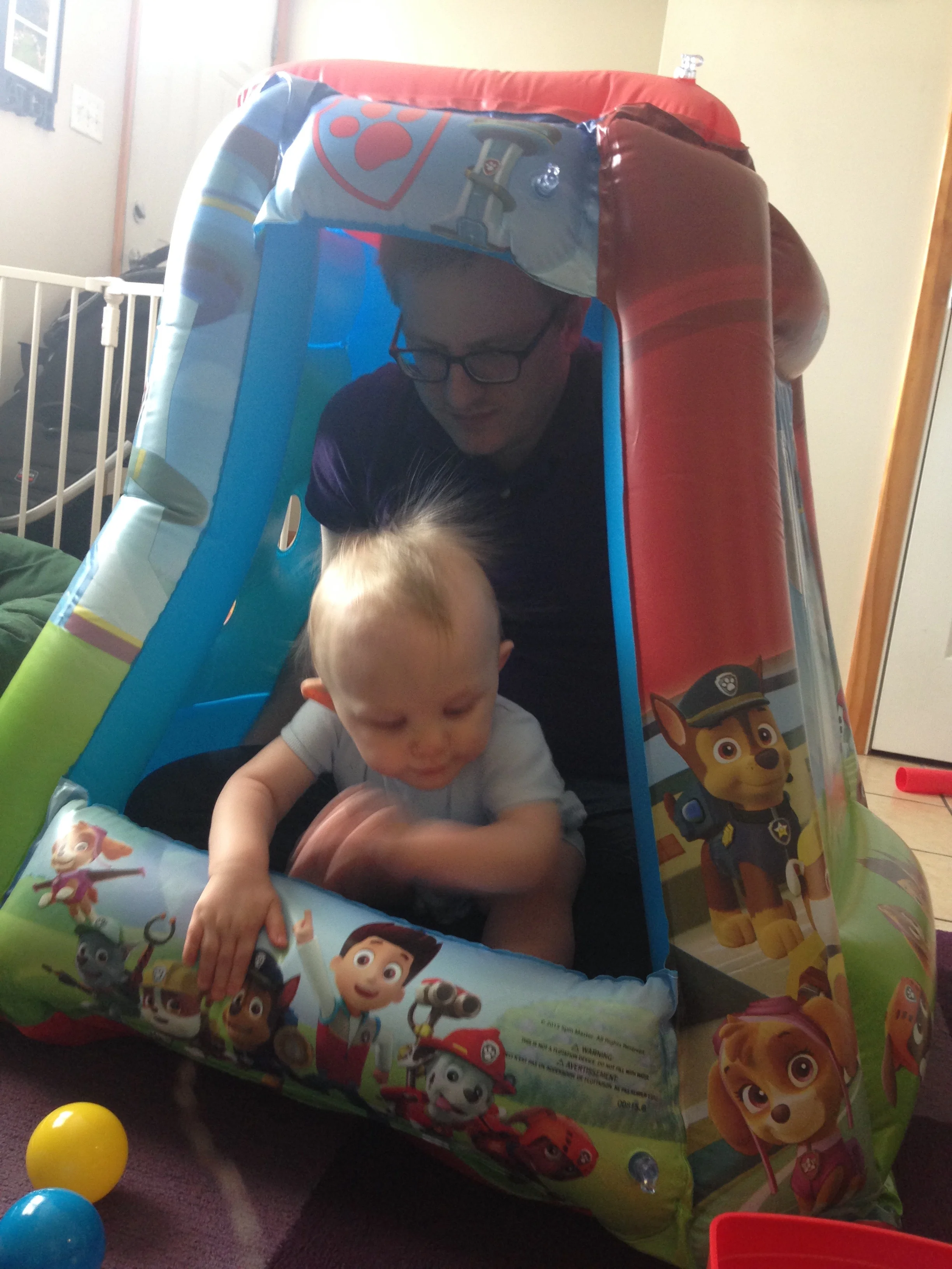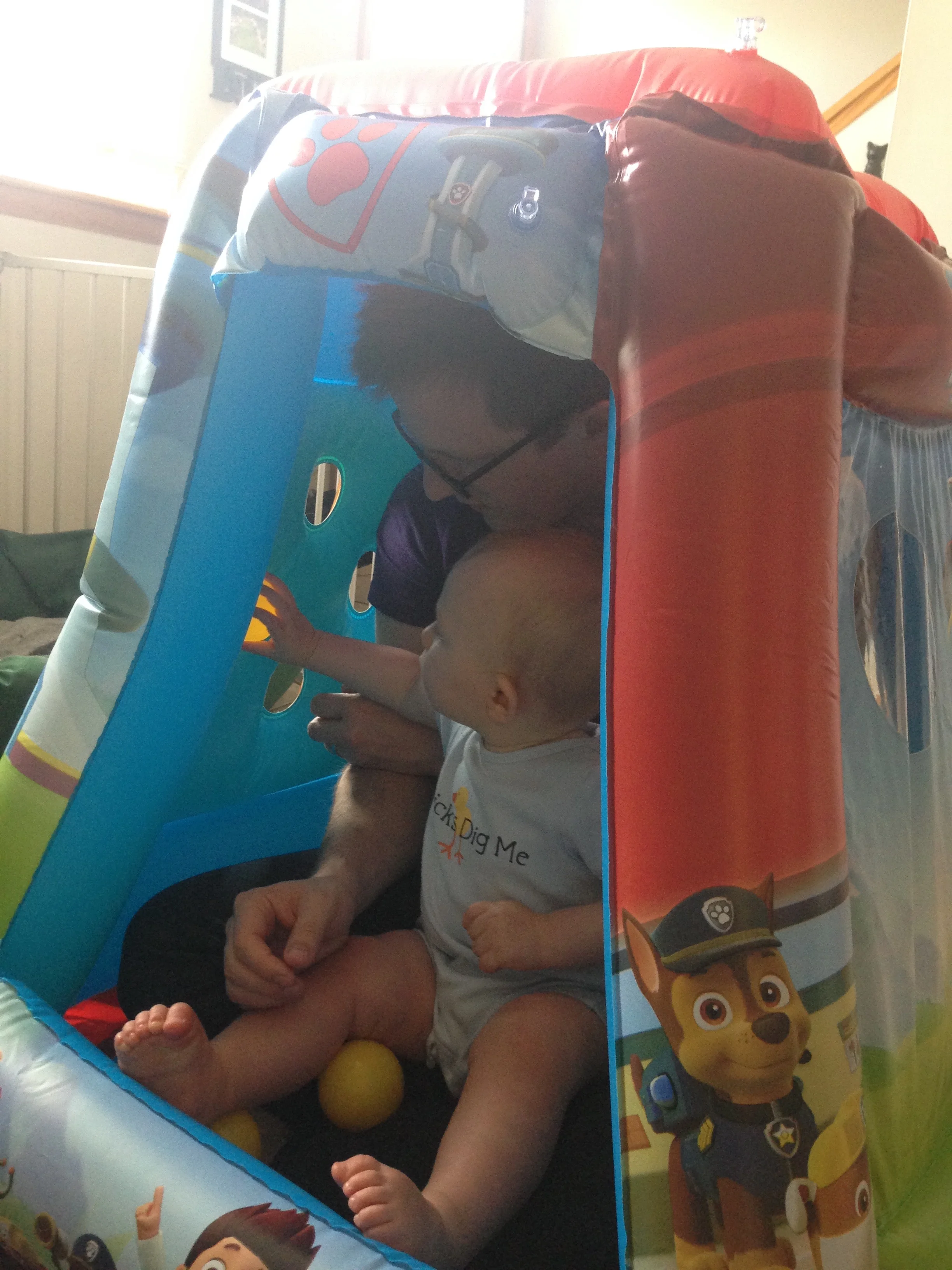 Lovin' the ball pit that was an early birthday present from grandma & gramps. He figured out right away how to put balls through the holes! Static hair is an adorable bonus.