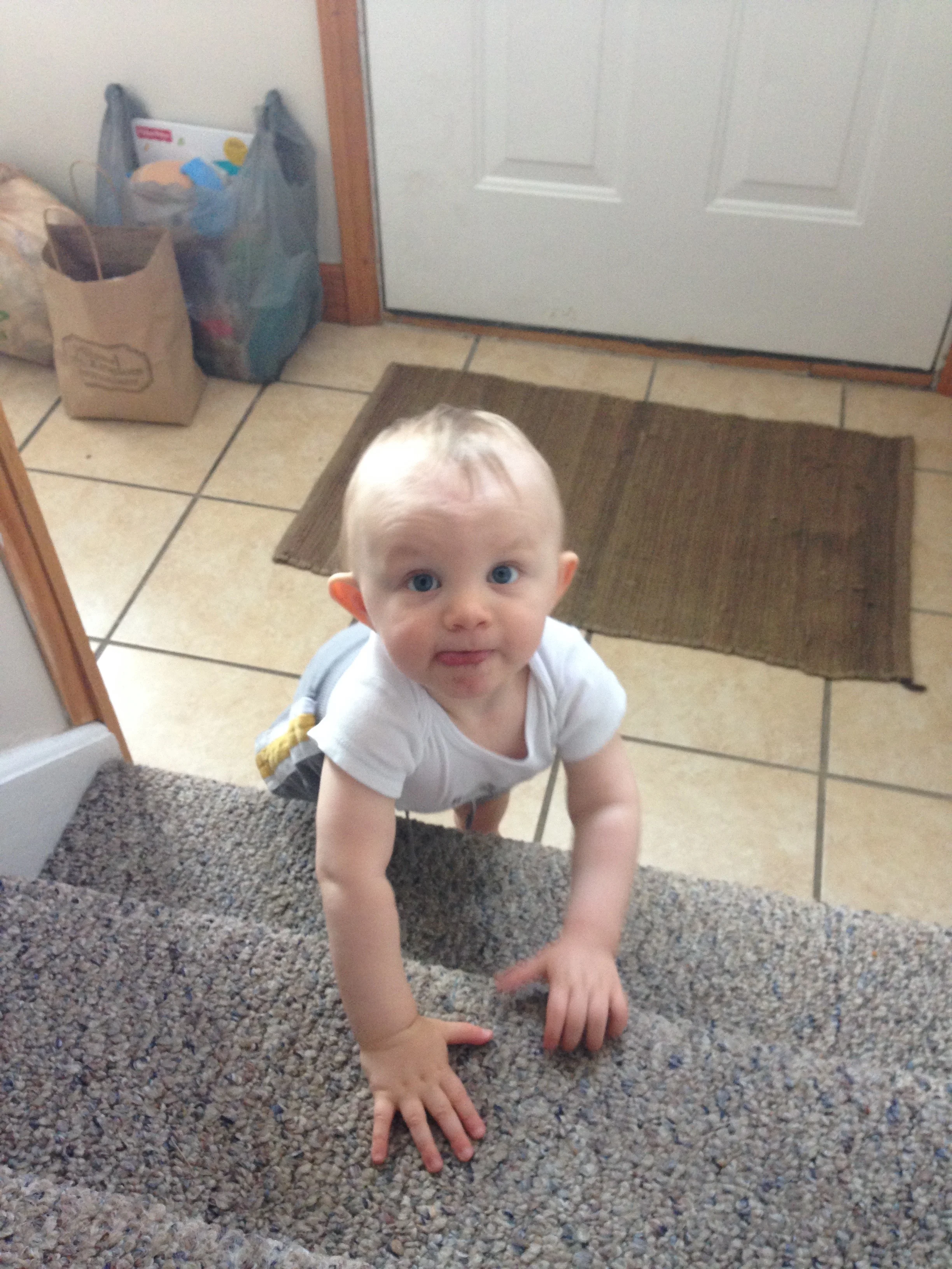 Uh-oh... we've discovered the stairs... He only went up one stair this first day and then was ready to come back down.