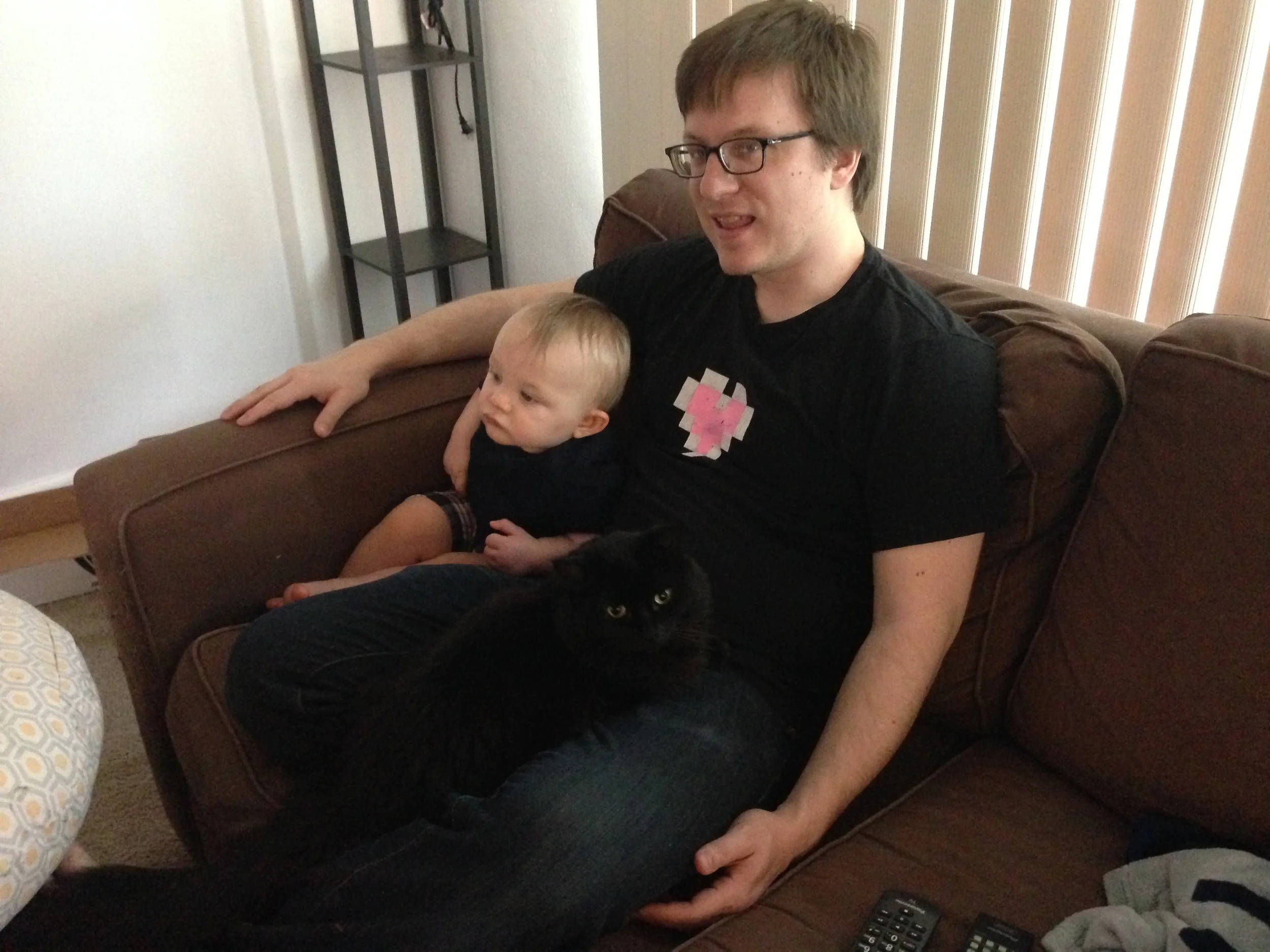 He can knock a tower down, build it up, mimic daddy laughing, and just generally be adorable.
