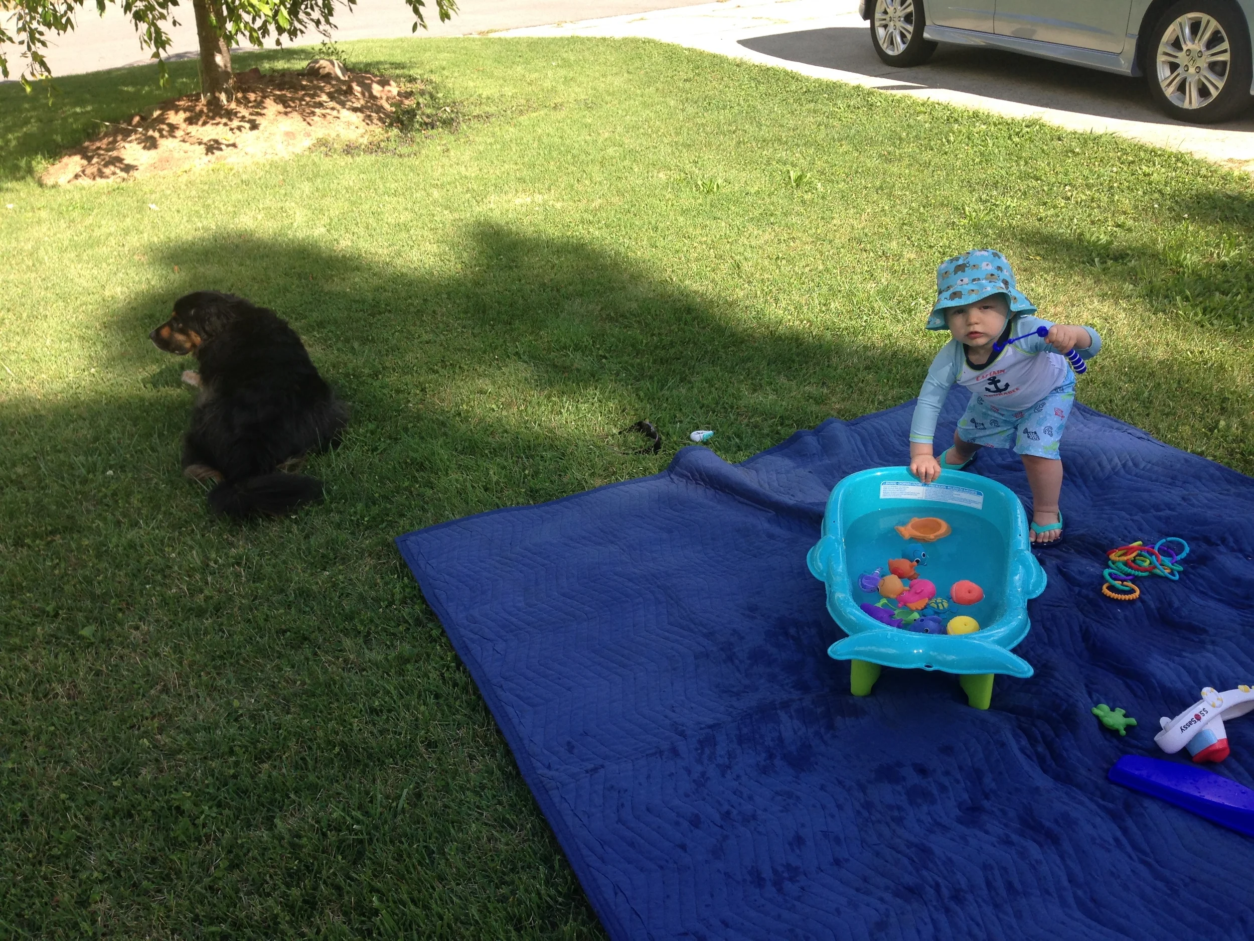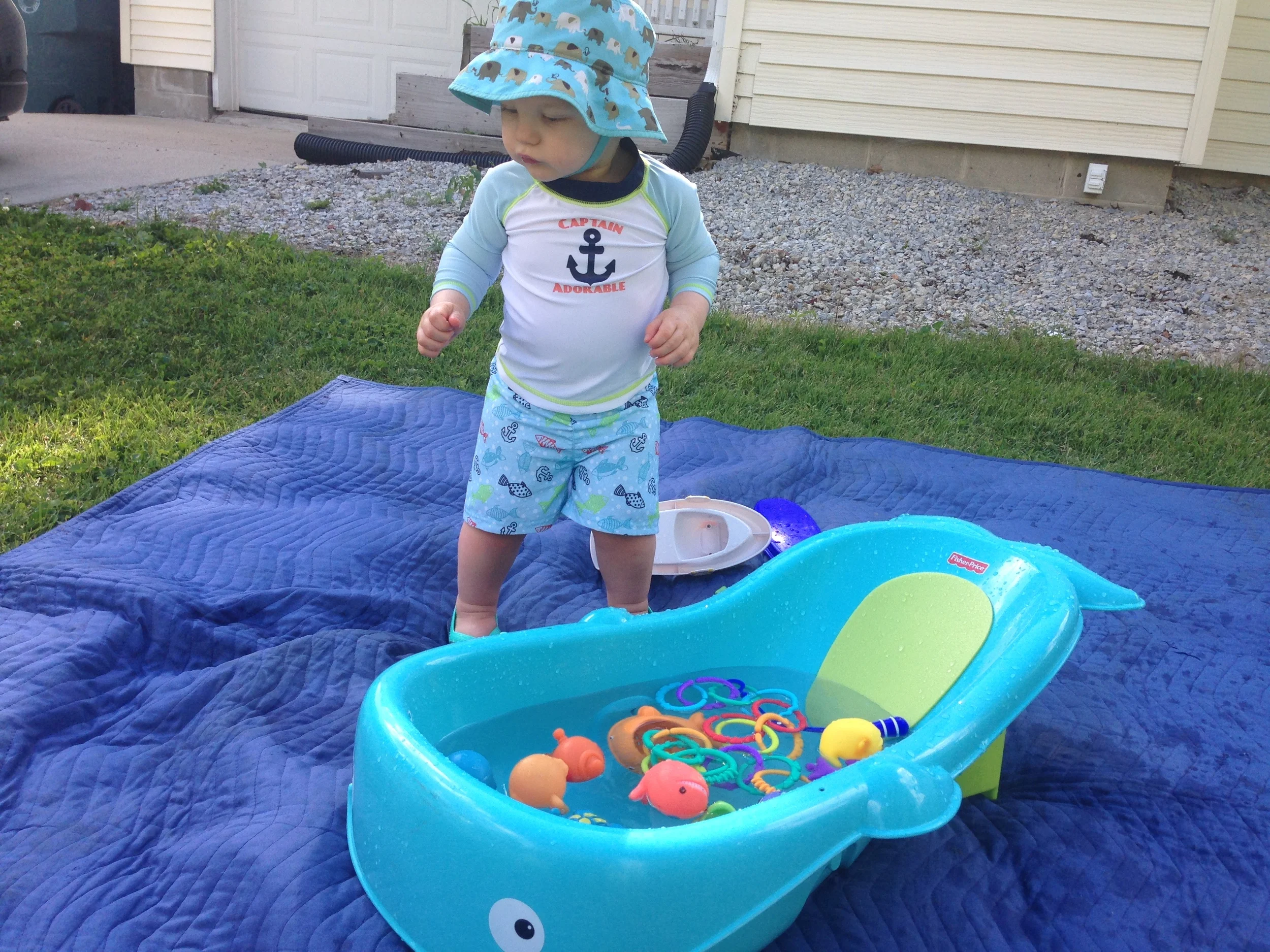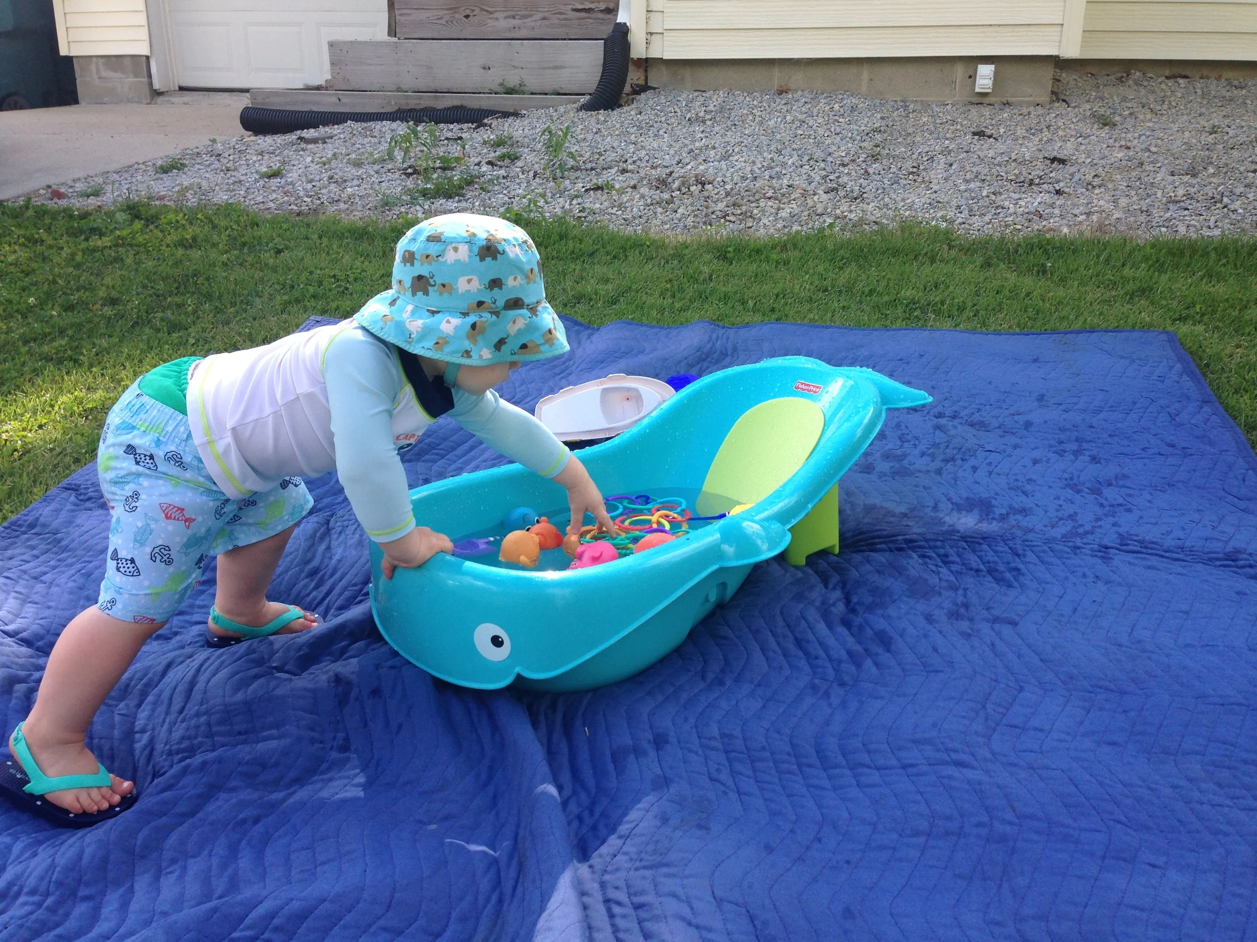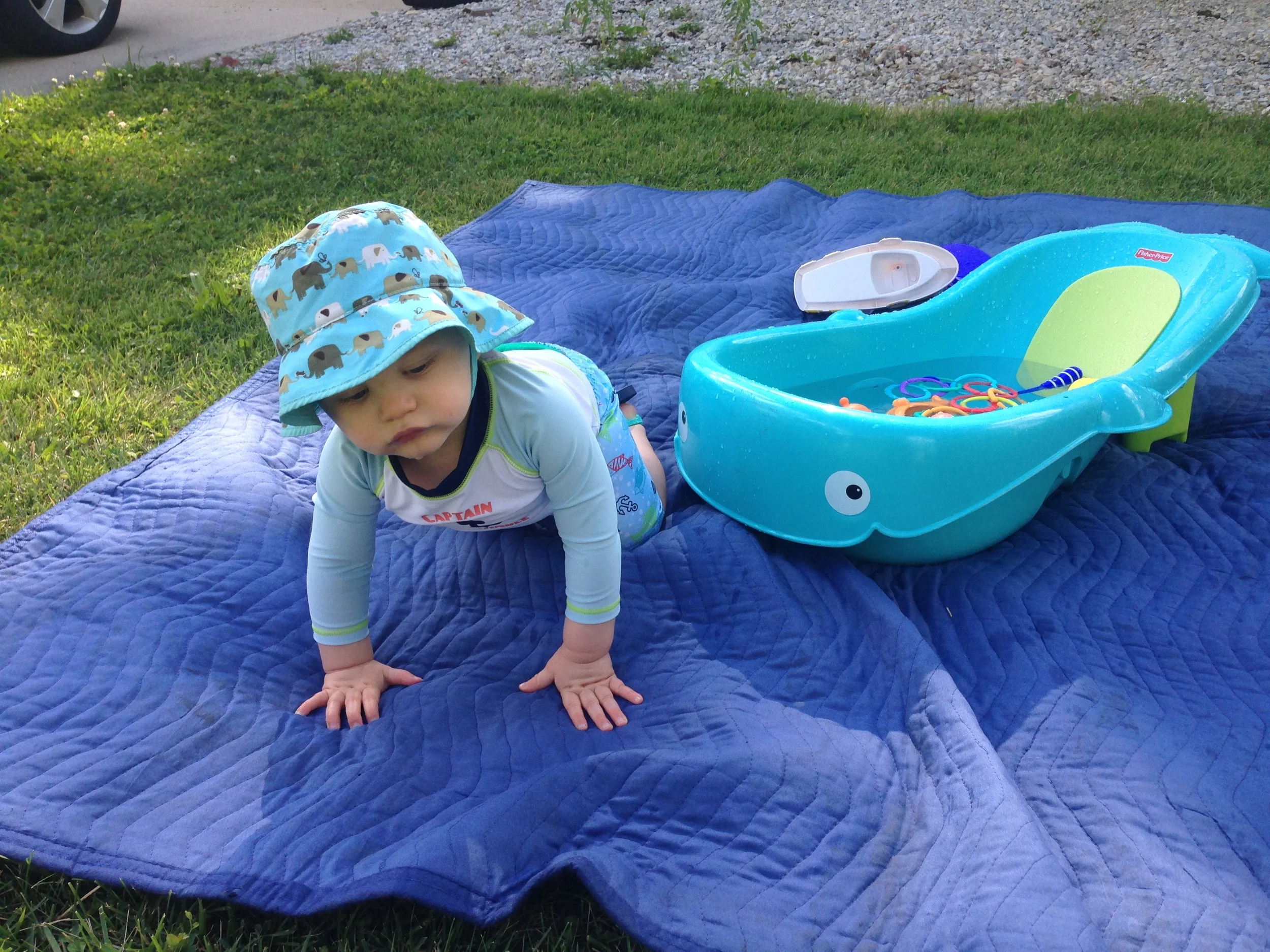 A beautiful, warm afternoon was the perfect time to break out some water toys (and the tub he used as a baby...), put on a bathing suit and cute hat, and splash away.