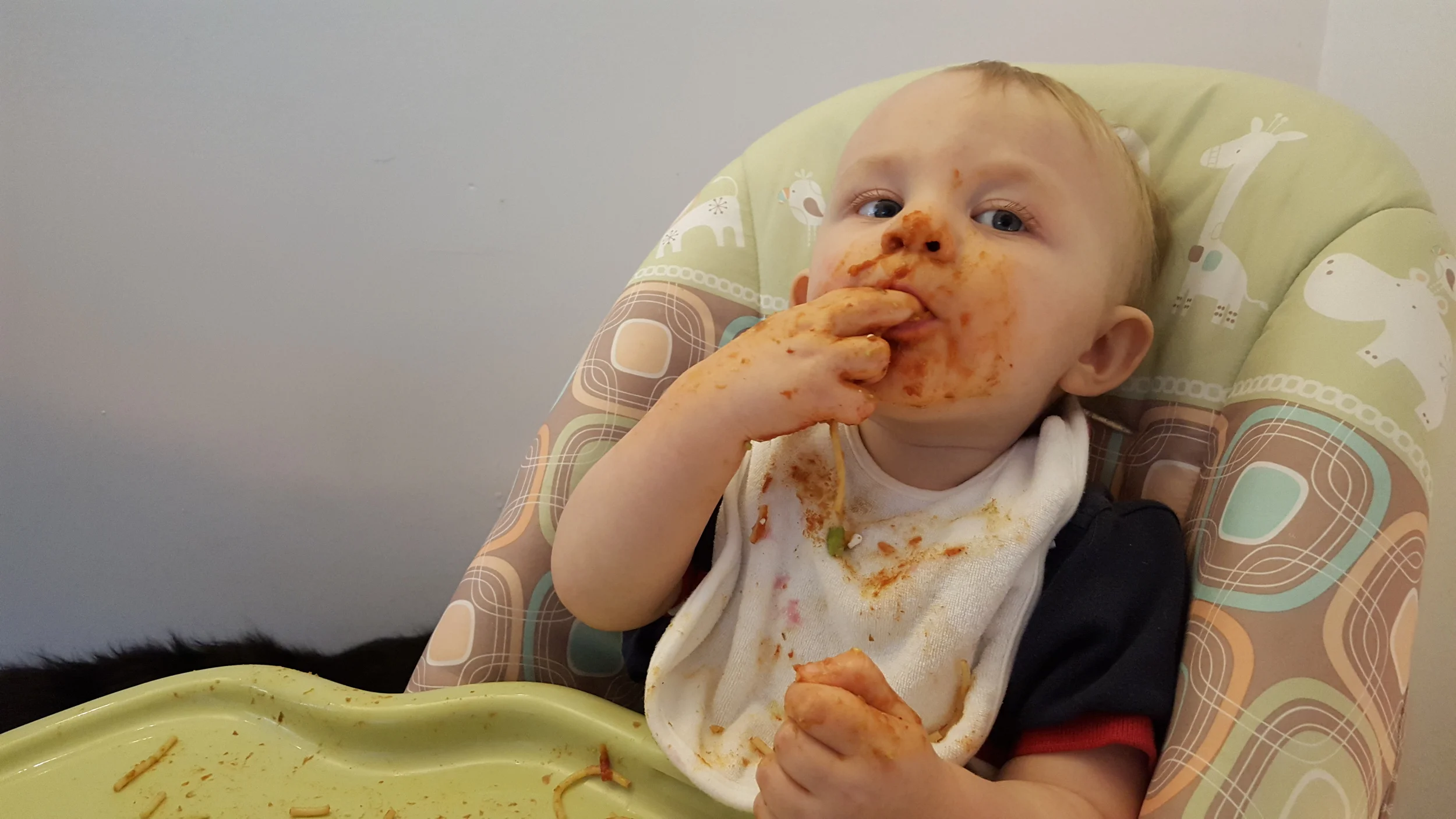 Obligatory "child covered in spaghetti" photo. :-) But dada sure does make the best spaghetti!