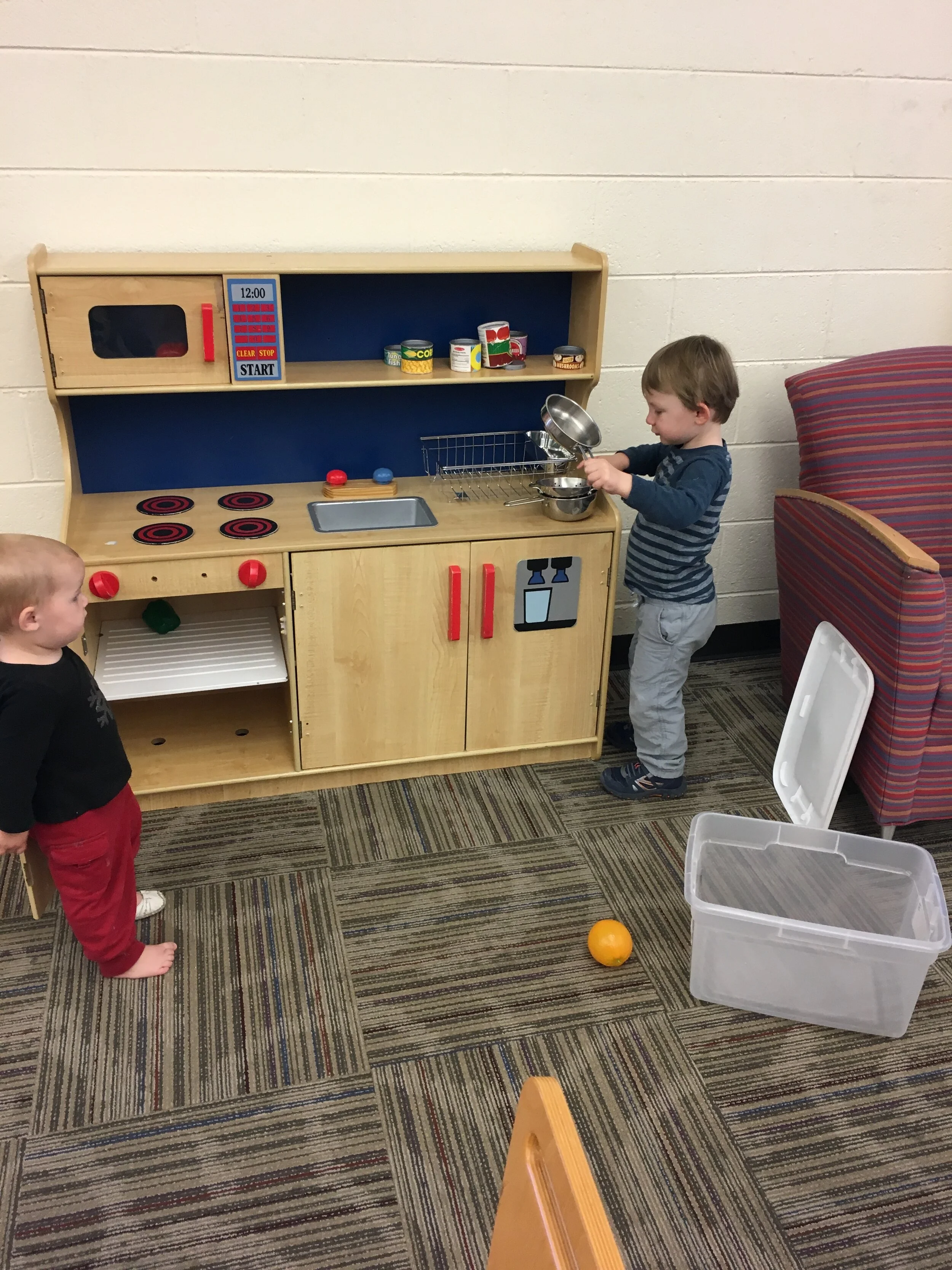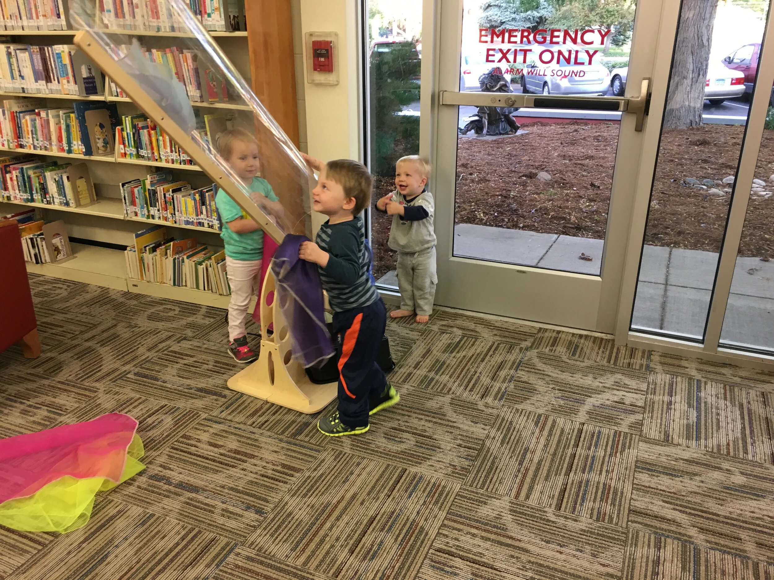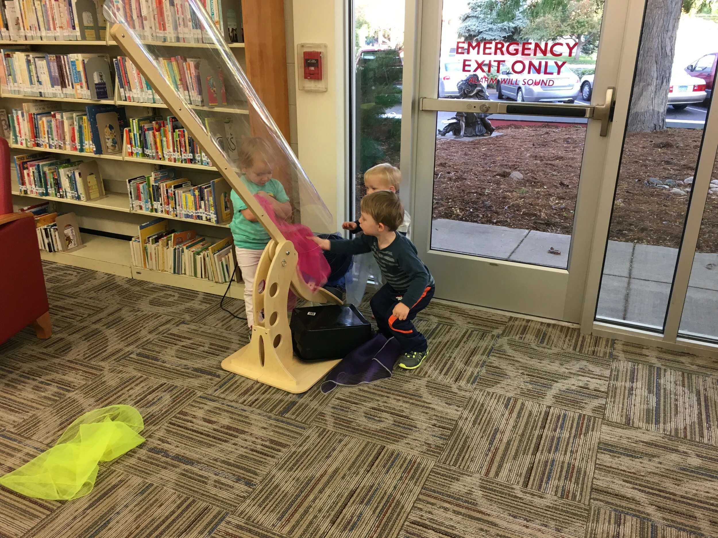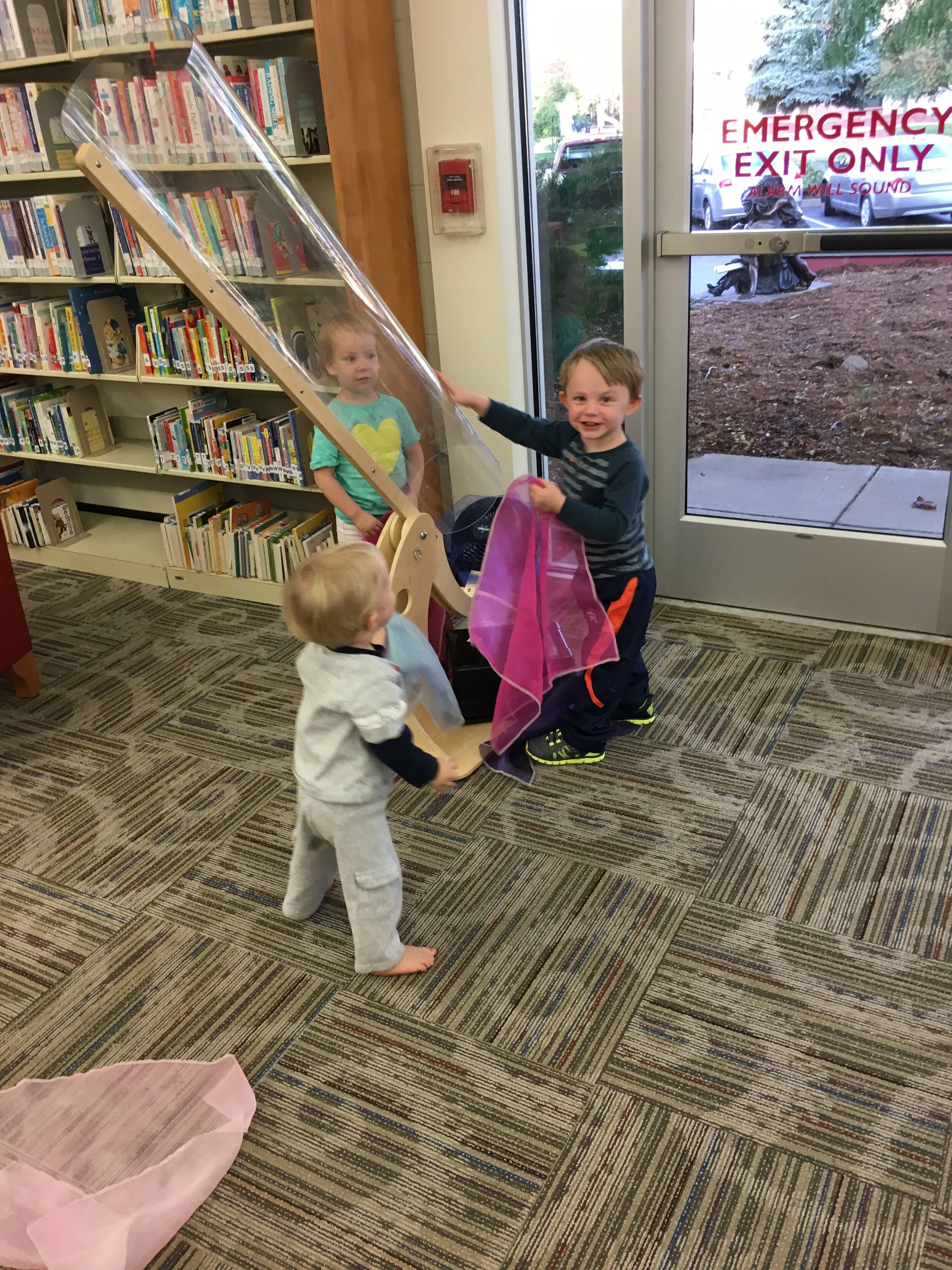 Playing with the air blower & scarves at the library and randomly saw our friend Peter (my colleague, Mark’s, son).