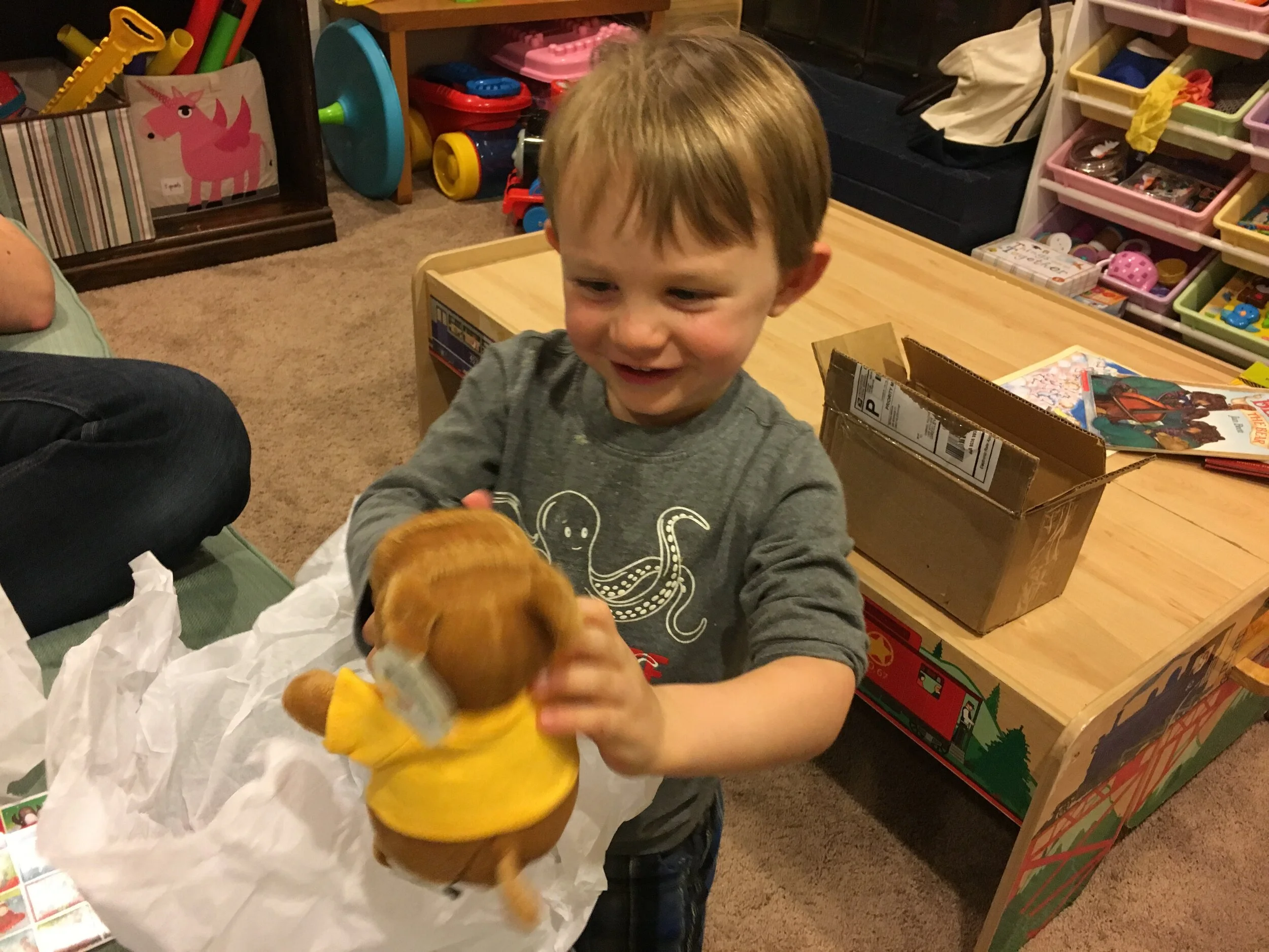 Pop & Grammie send the best gift boxes. Halloween book, stickers, & stuffed puppy from Adrian College.