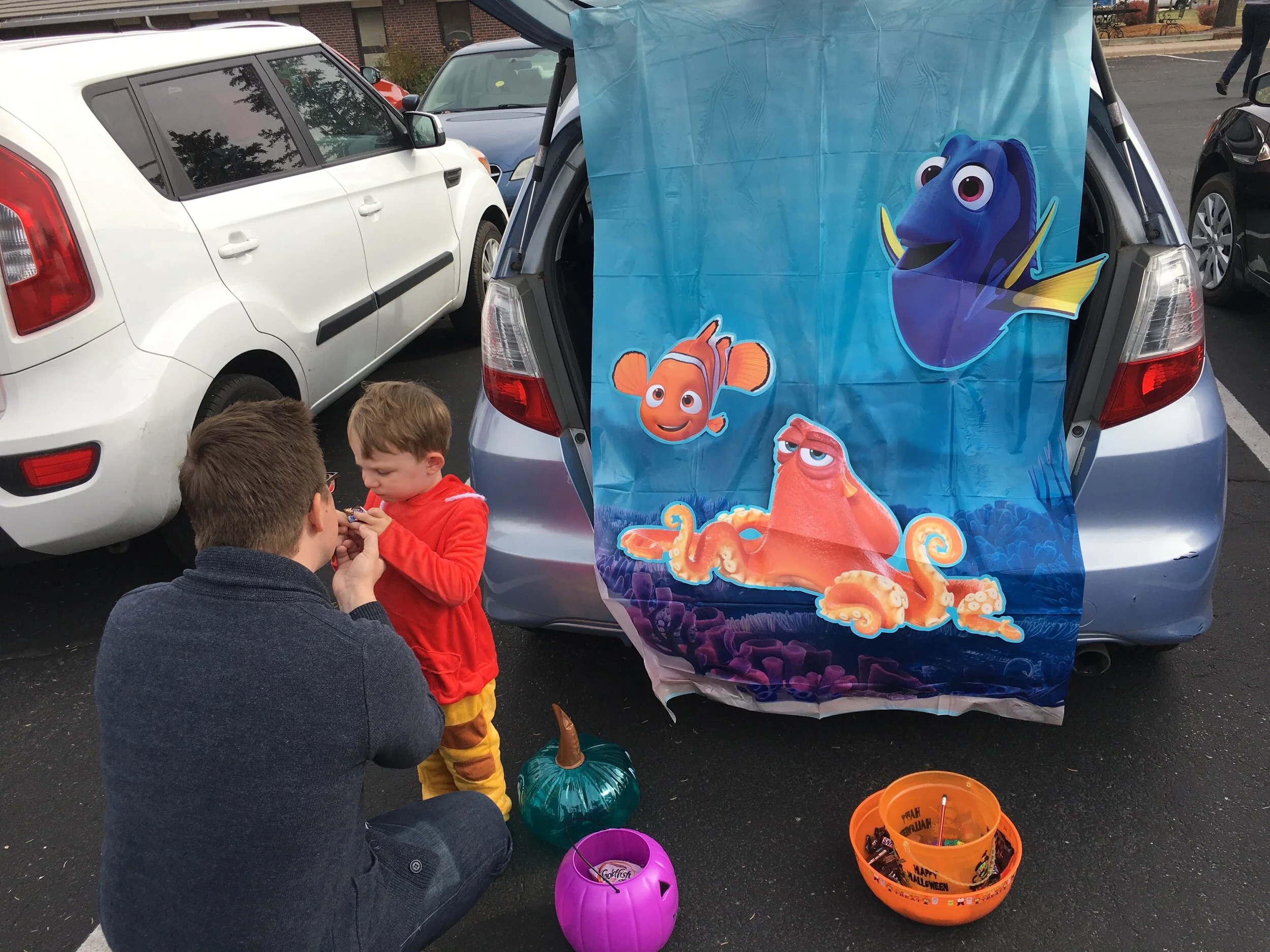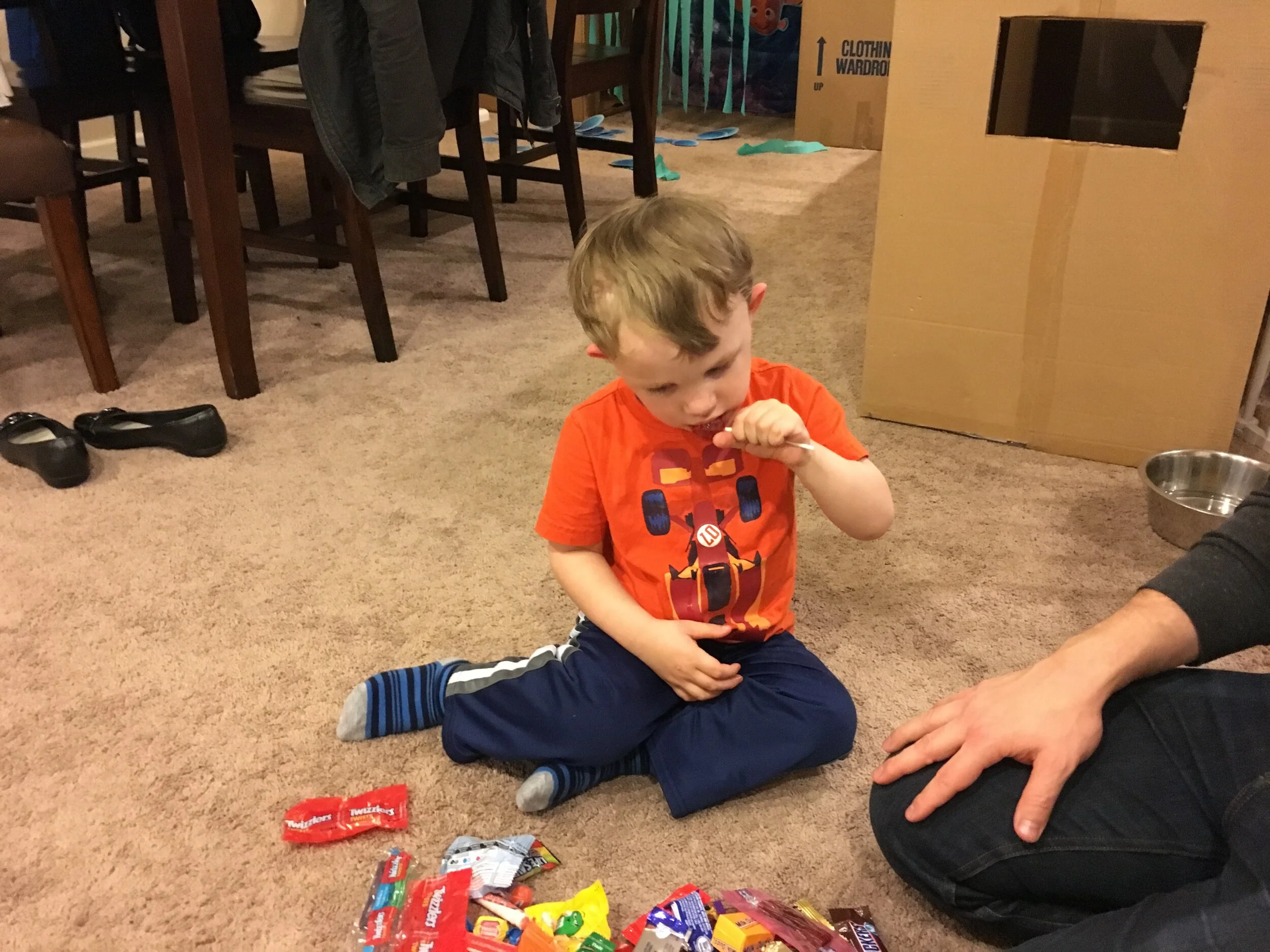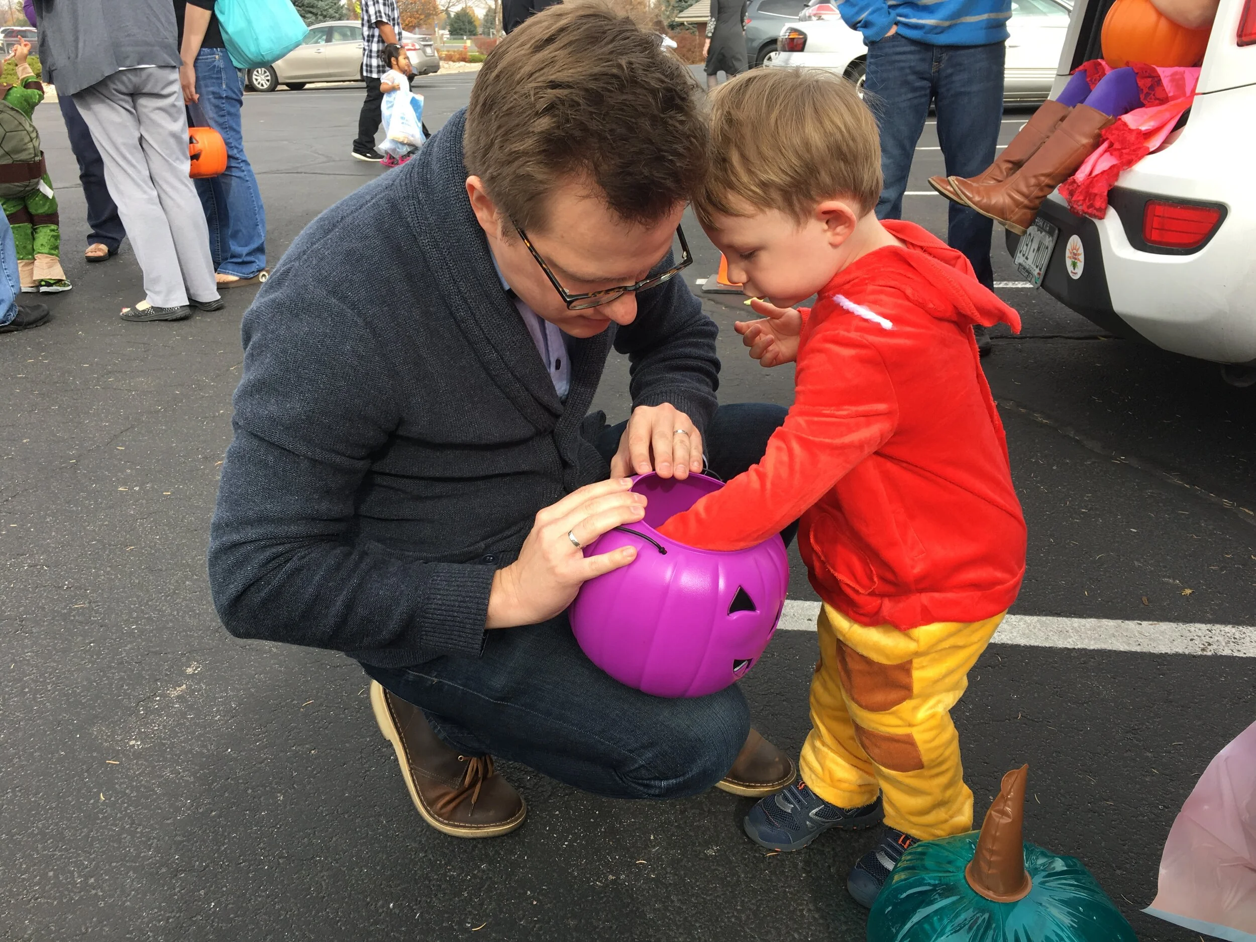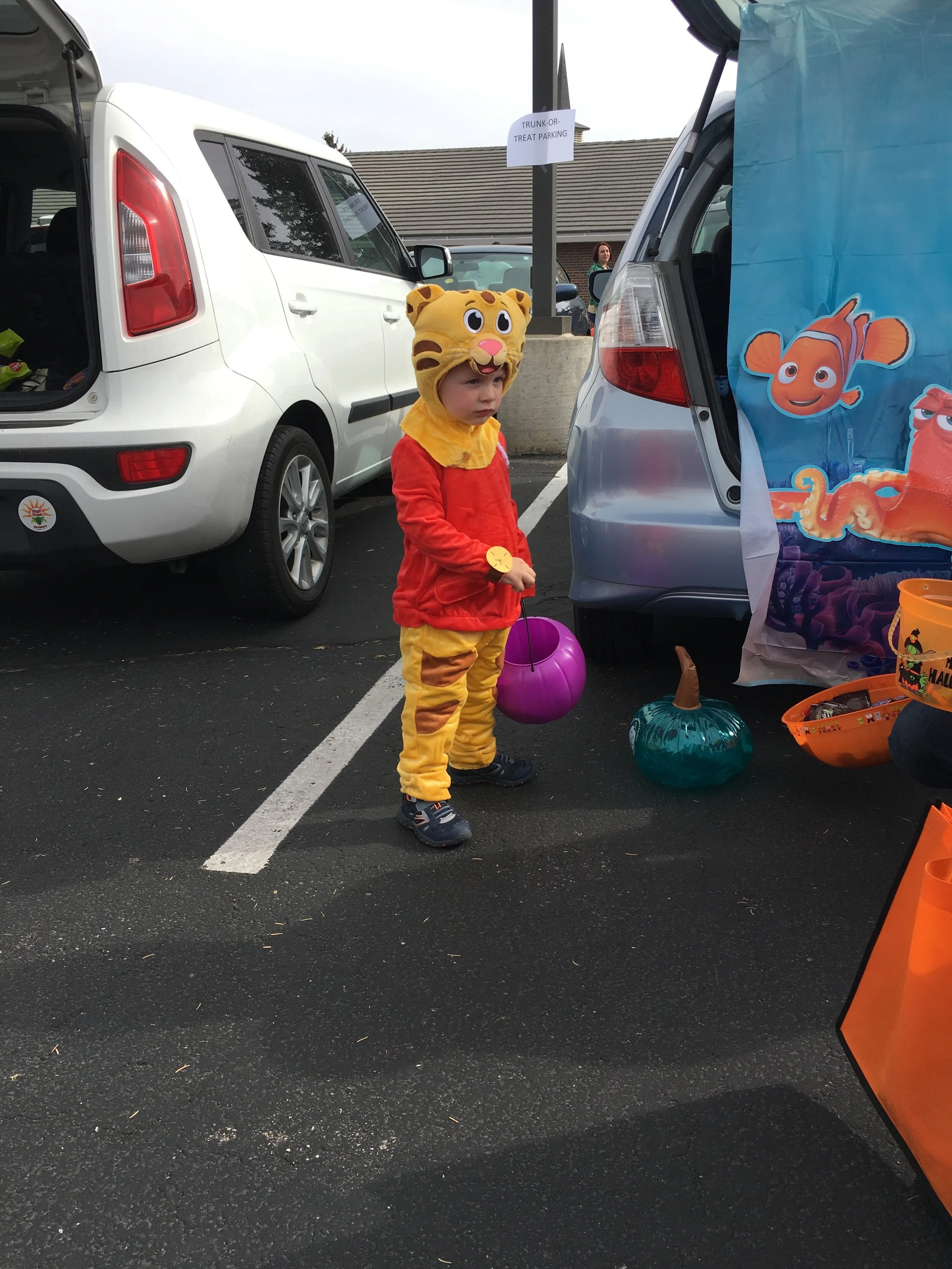 Trunk or treat at church. He’s getting the hang of trick or treating!