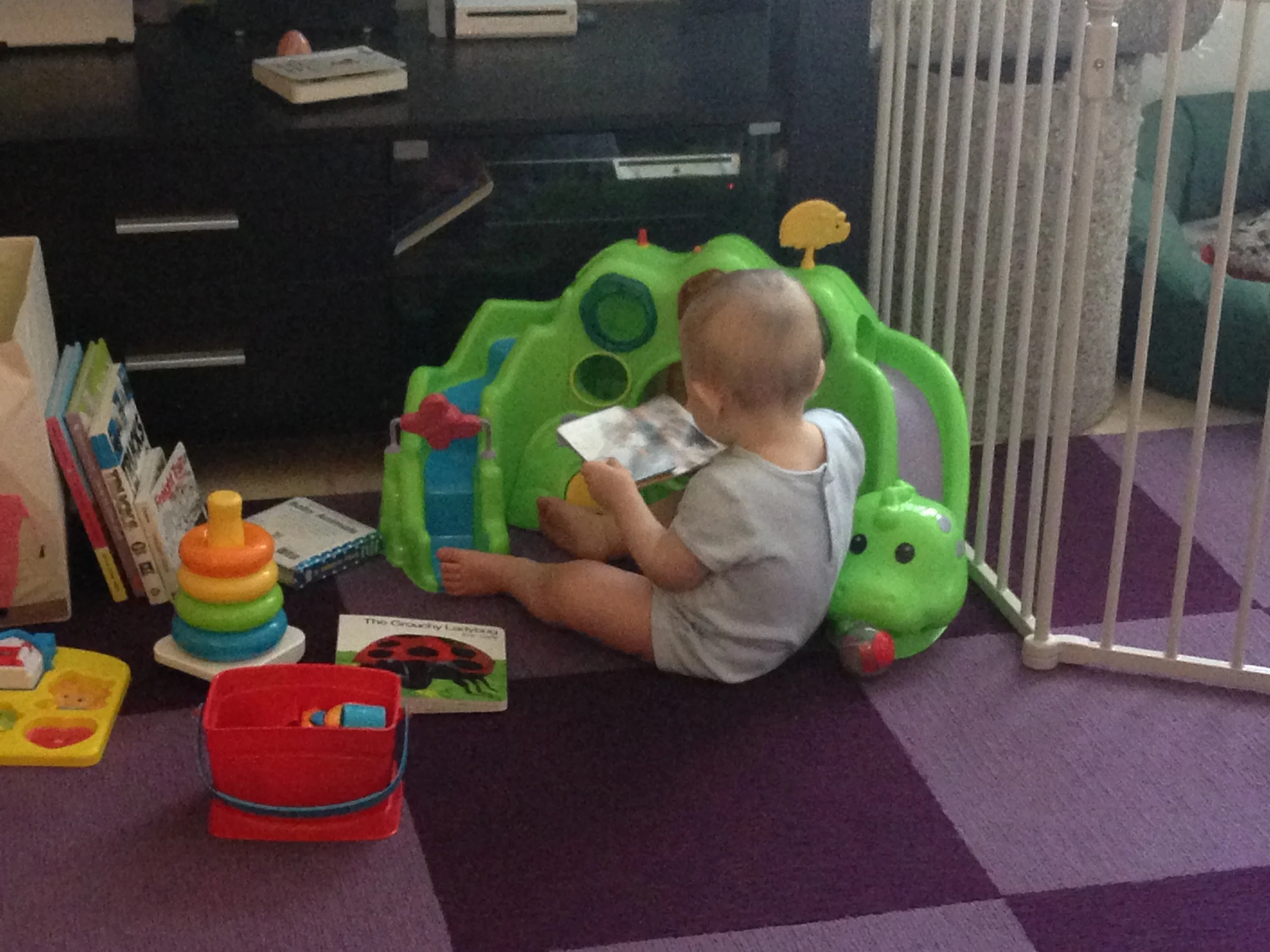 It gets really quiet in the other room and I think "what's he doing?!?" and then I find him reading silently to himself. This less-than-1 year old is amazing. :-)