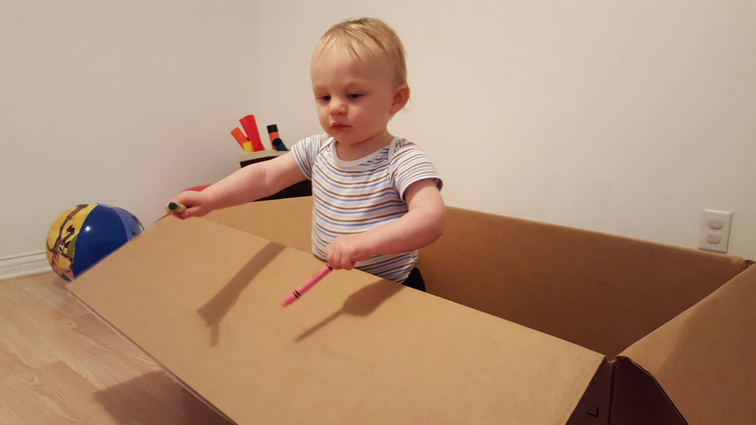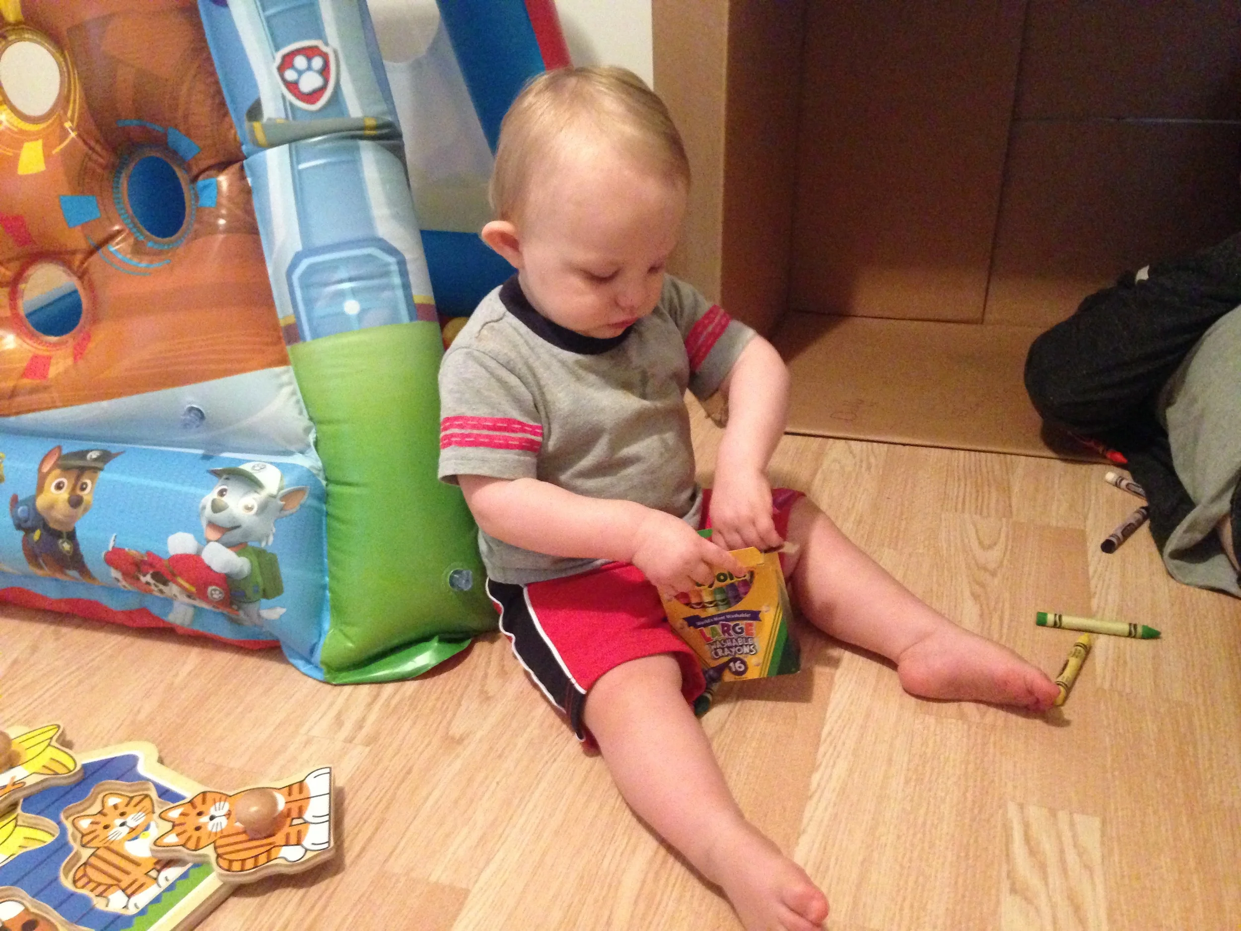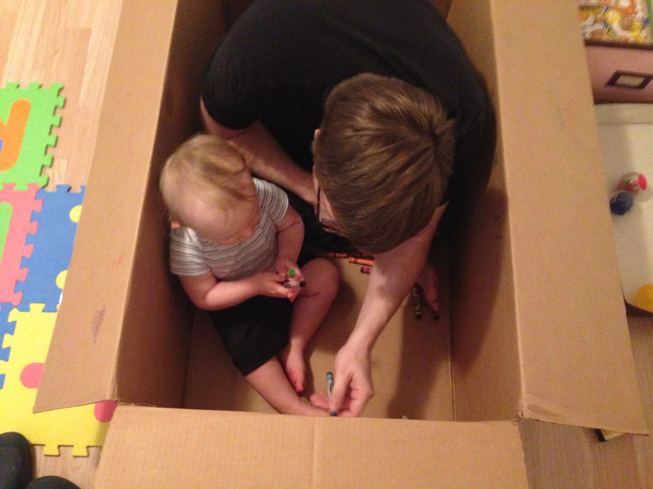 An idea stolen from Pinterest - Gabriel can color all over this box and the crayons stay contained (fingers crossed the house walls are safe!).