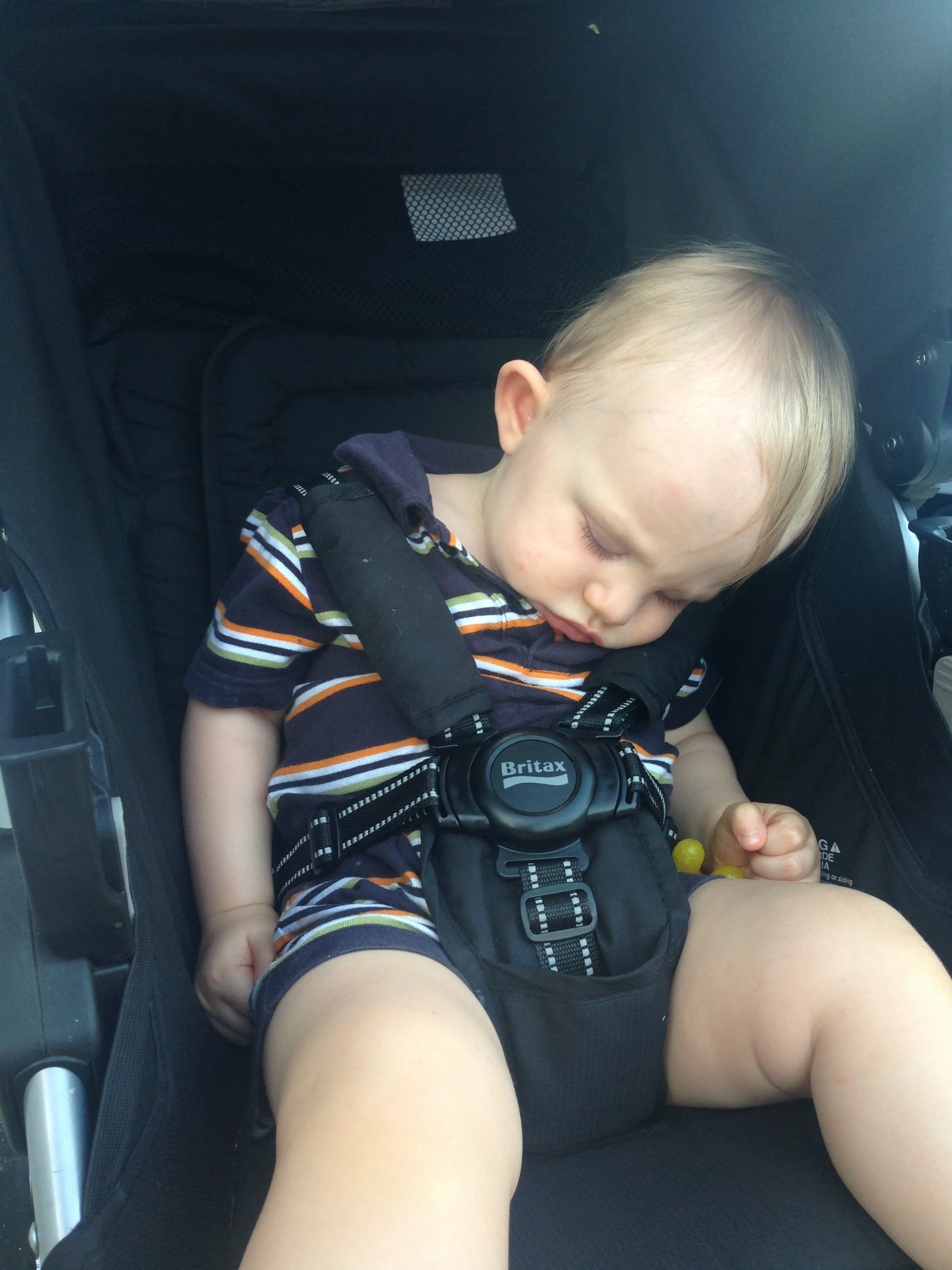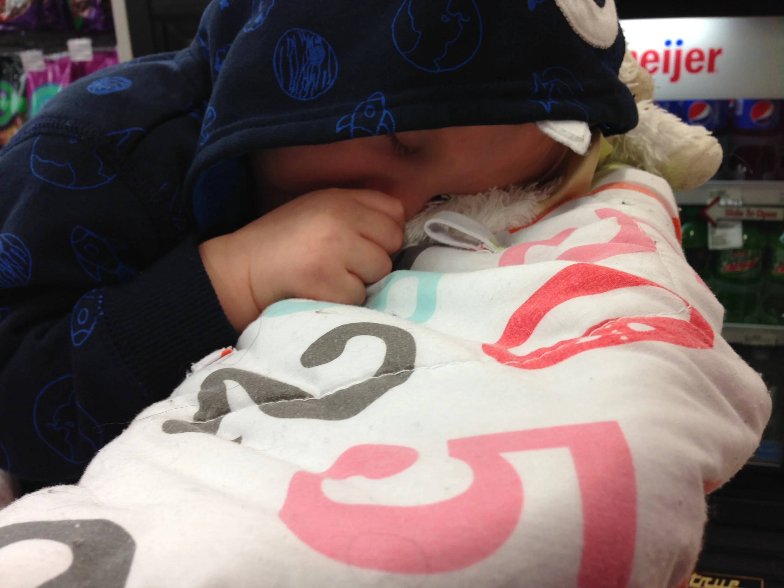 This was a first. Another sign that the vaccines just totally wiped him out. Asleep face-first on the shopping cart.