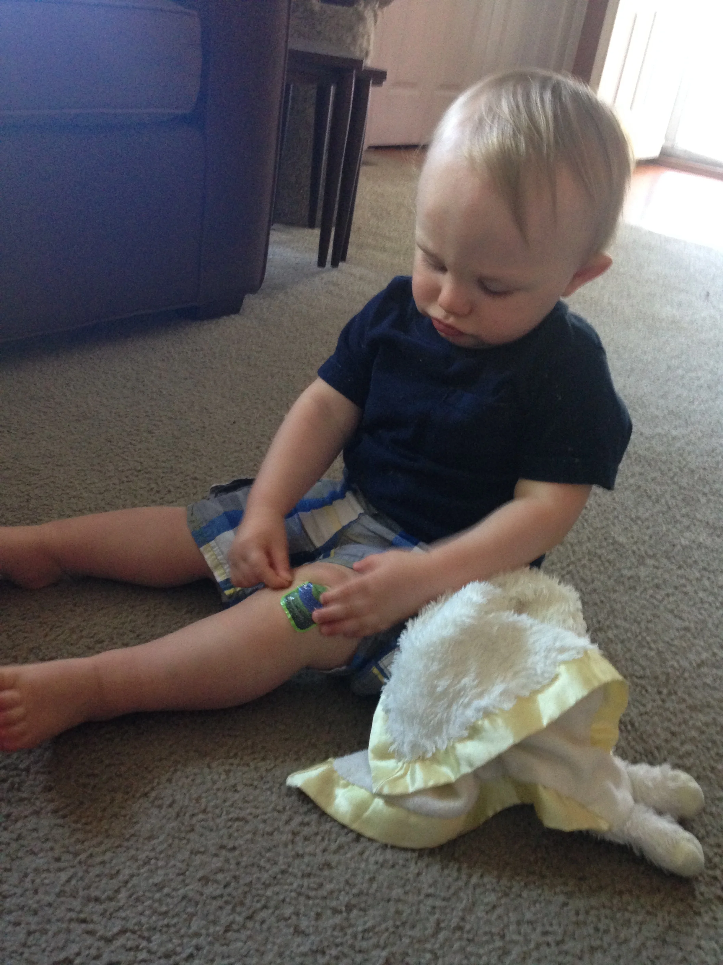 His first band-aid! Poor guy fell on his way up the front steps and got a little scrape. He's not sure what to make of this "sticker" on his knee.