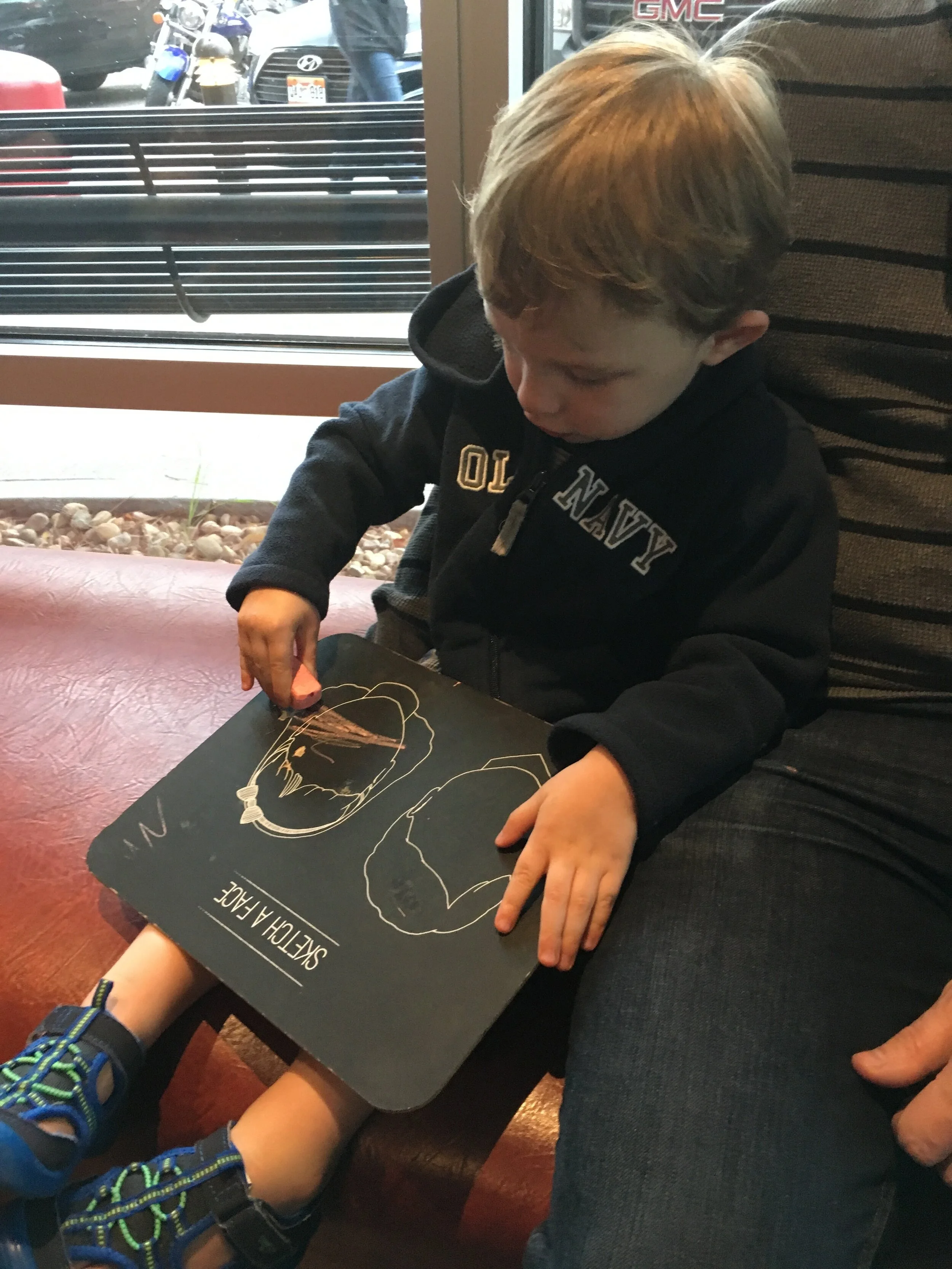 How big is this little man that he has fun coloring with chalk while waiting at Red Robin?