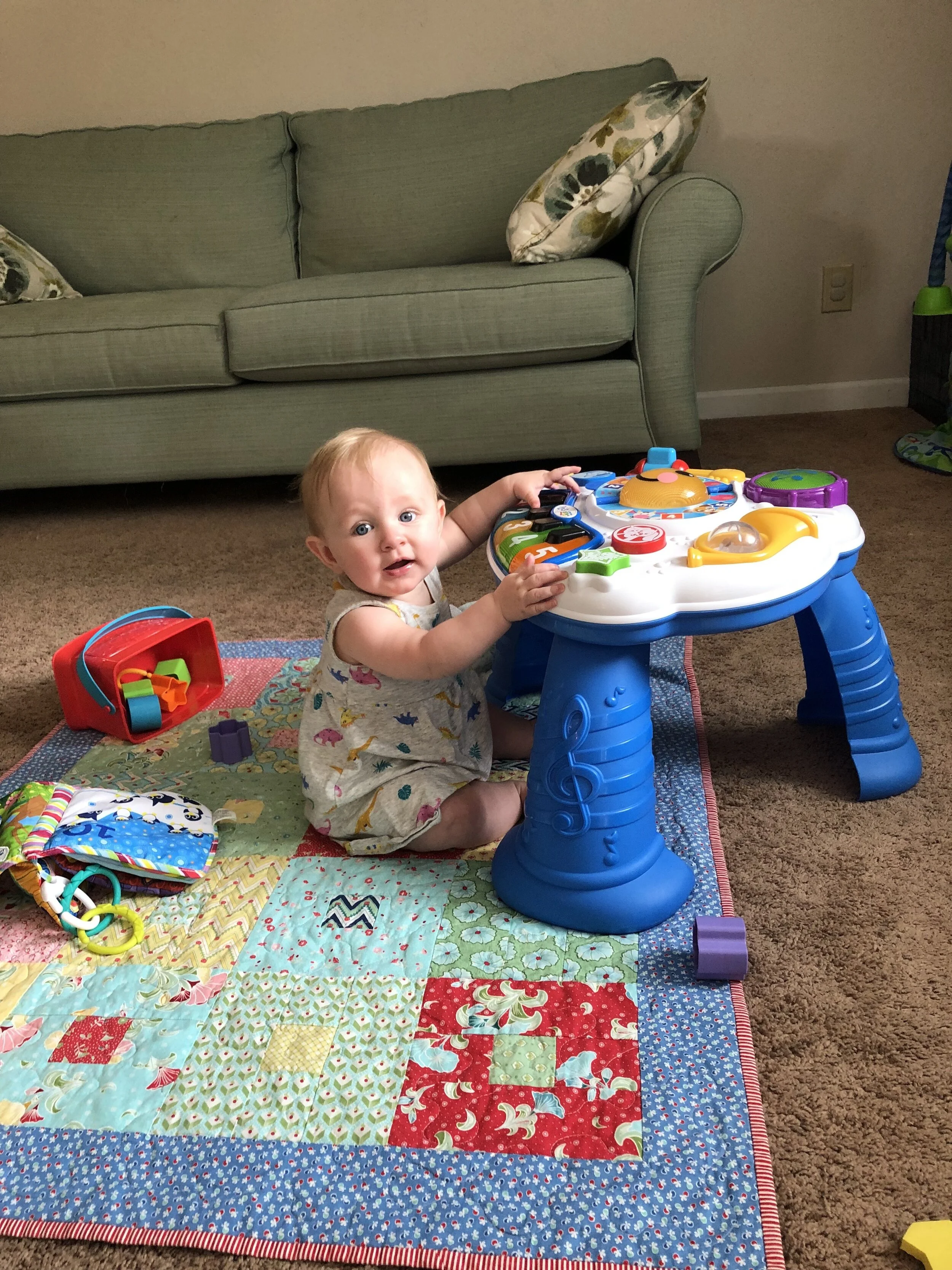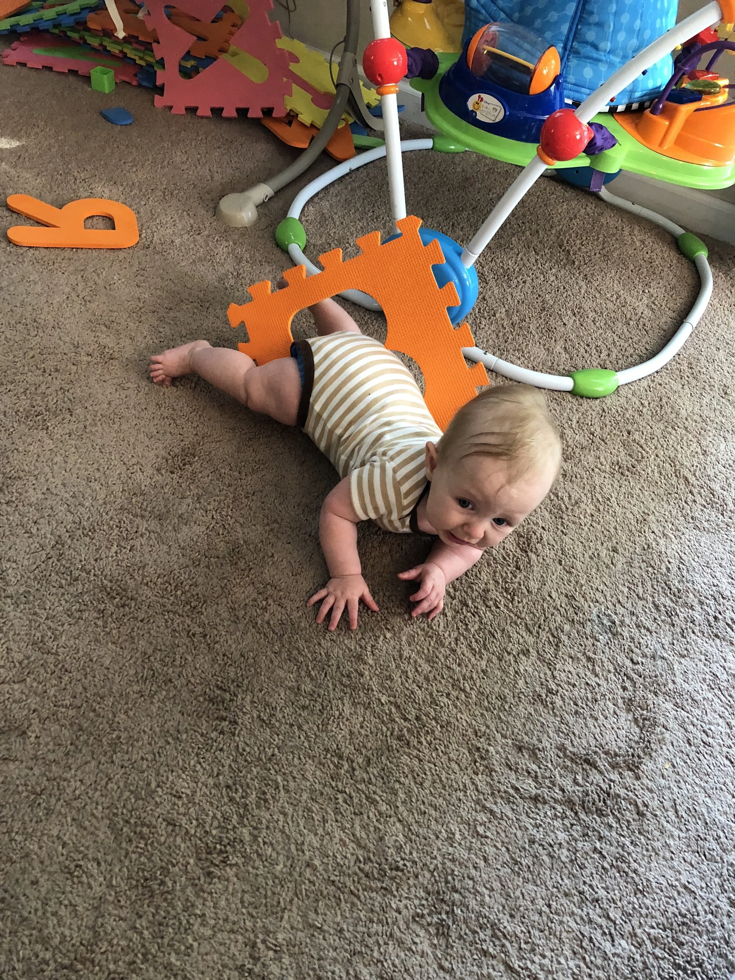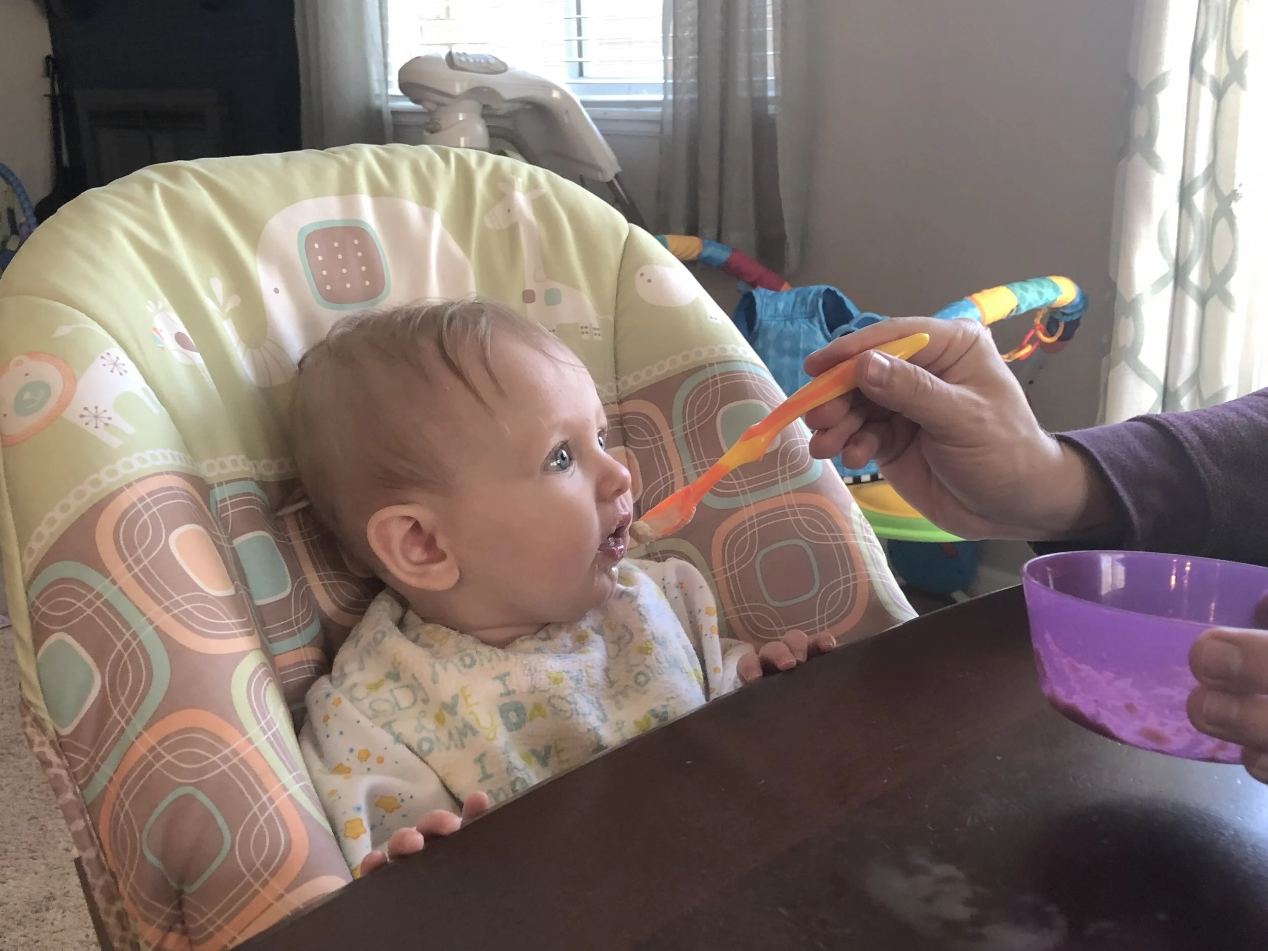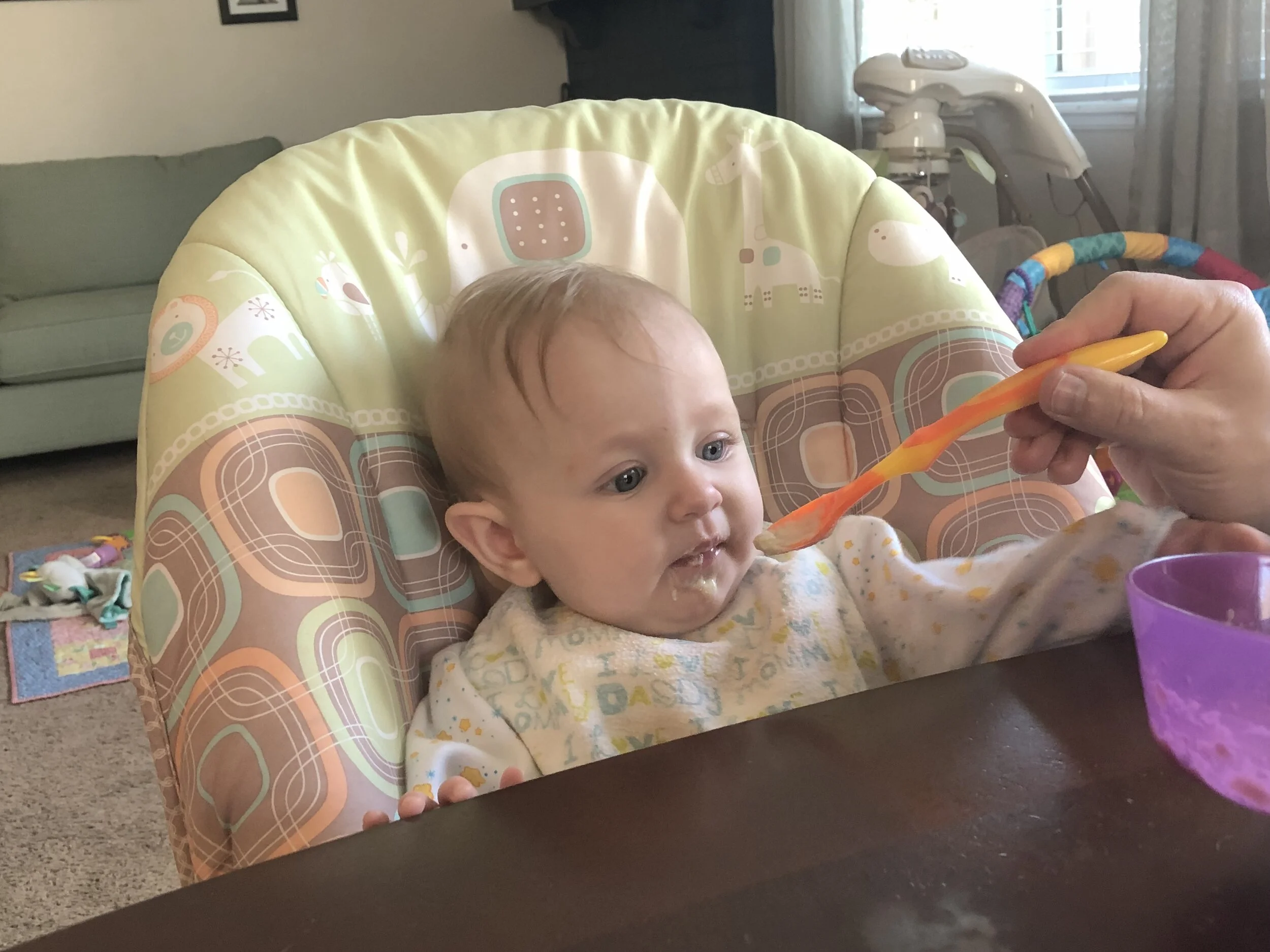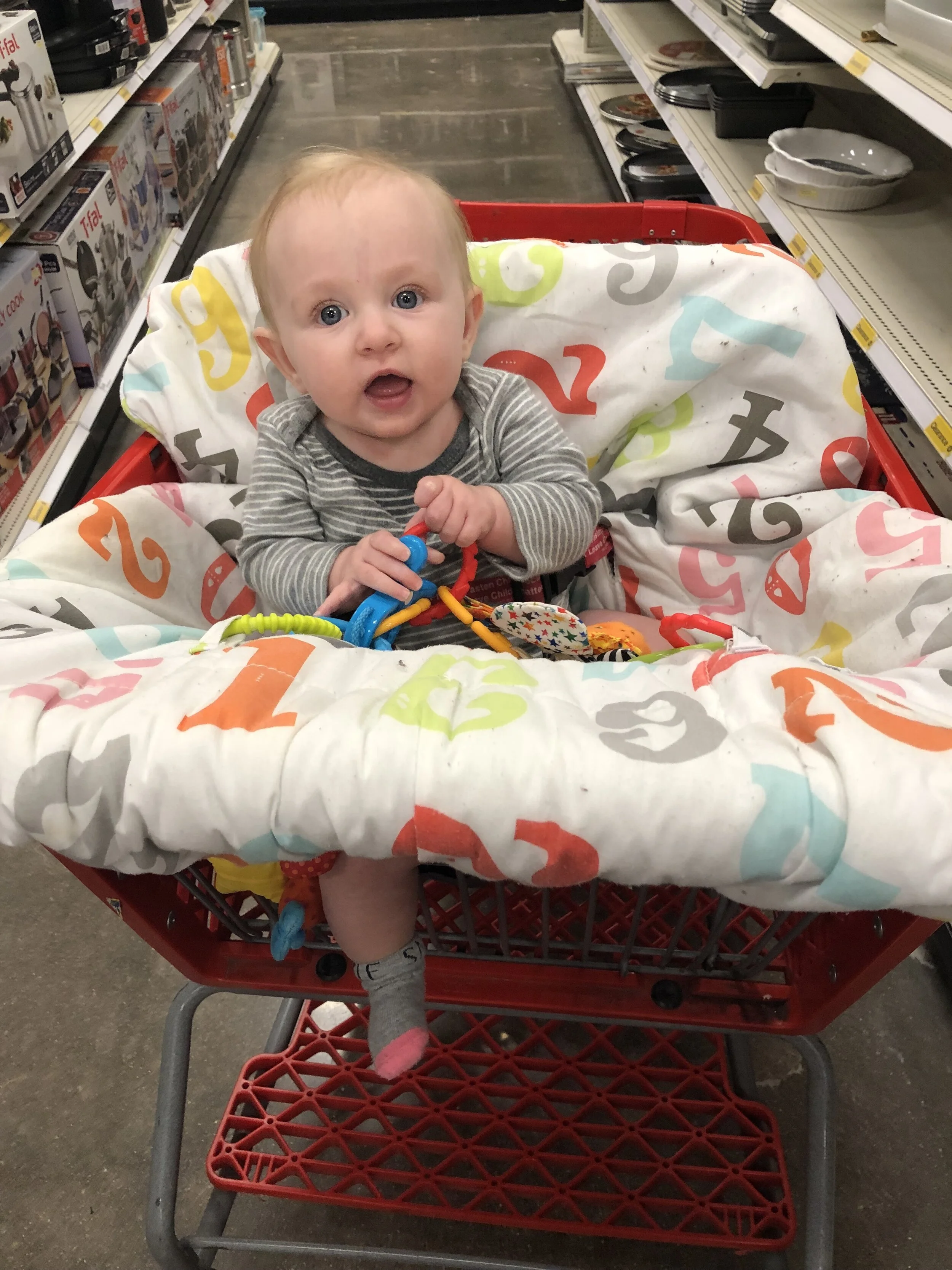 The same day as starting solid foods we decided to try out putting her in a cart instead of carrying the heavy carseat around. She was a fan! (As long as she could have one leg/foot propped up inside the cart, that is.) And yes, it was at Target because of course it was.