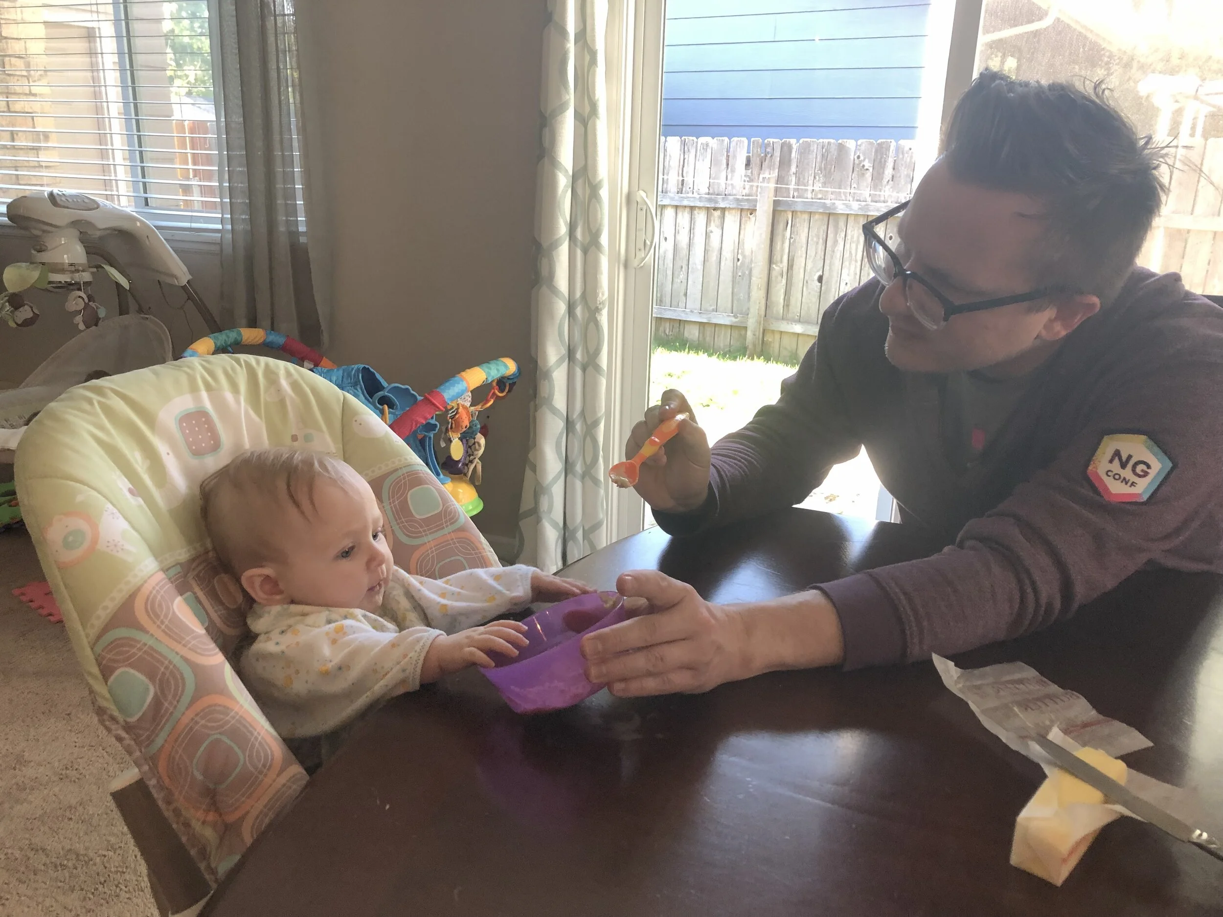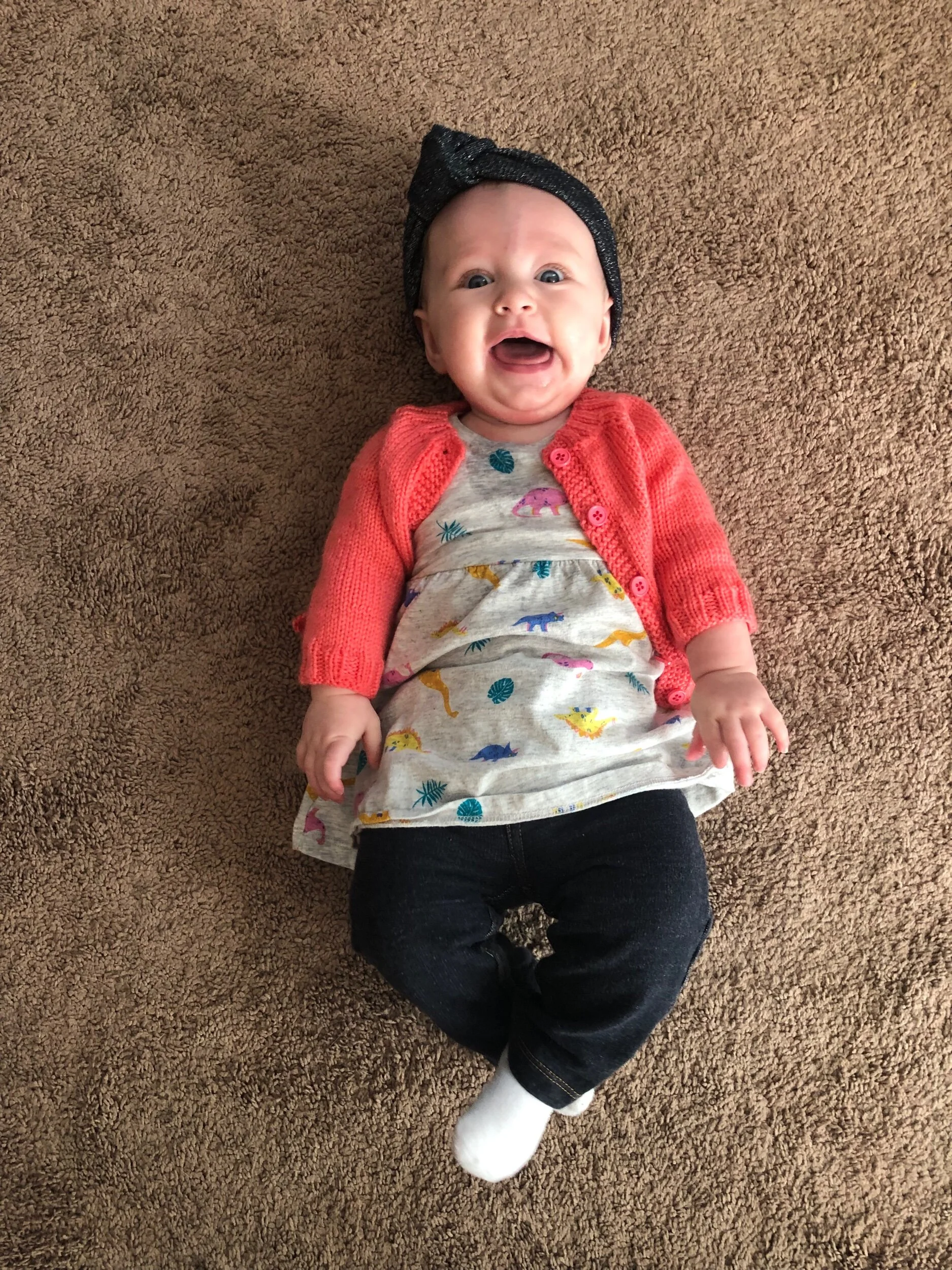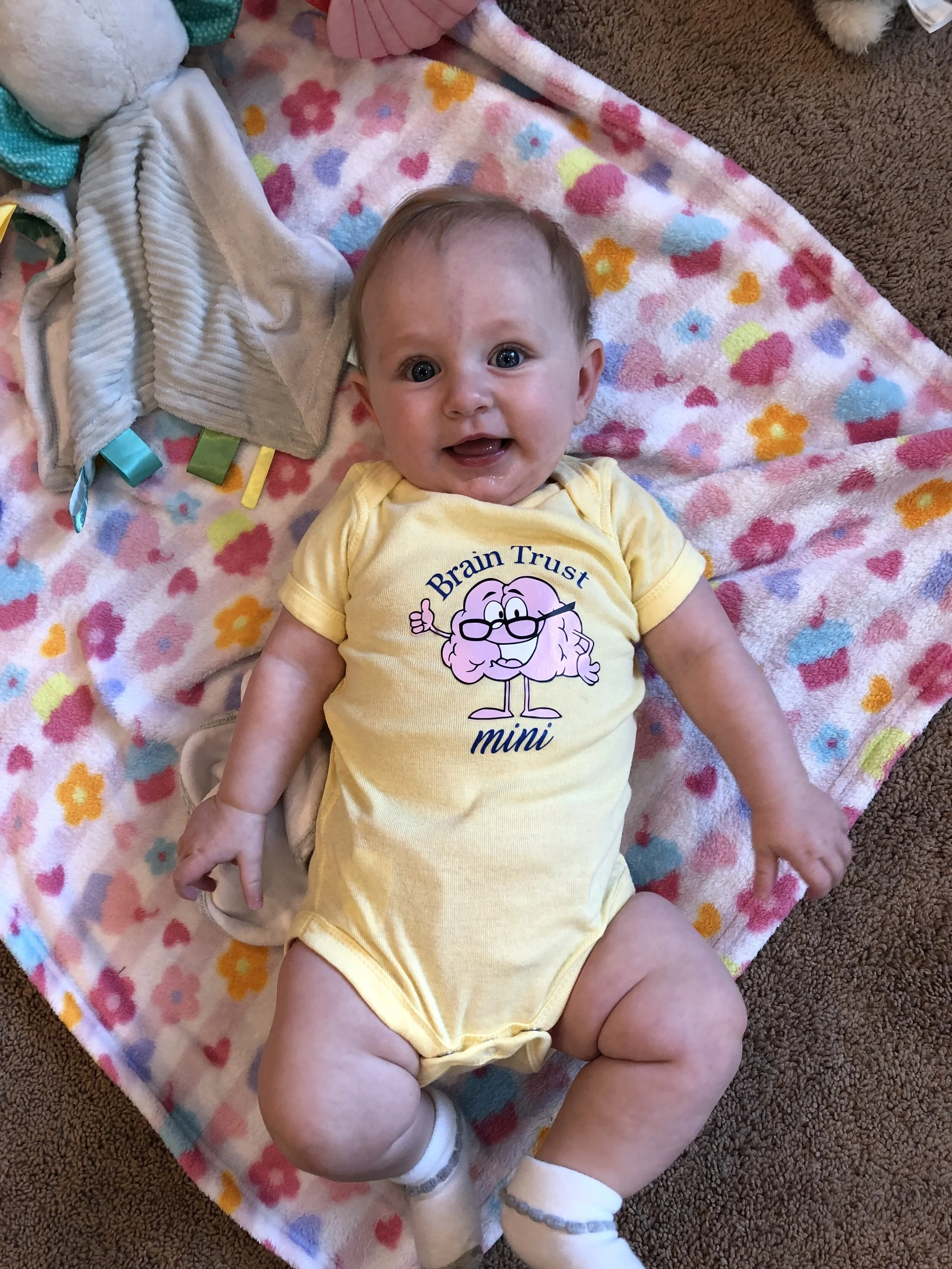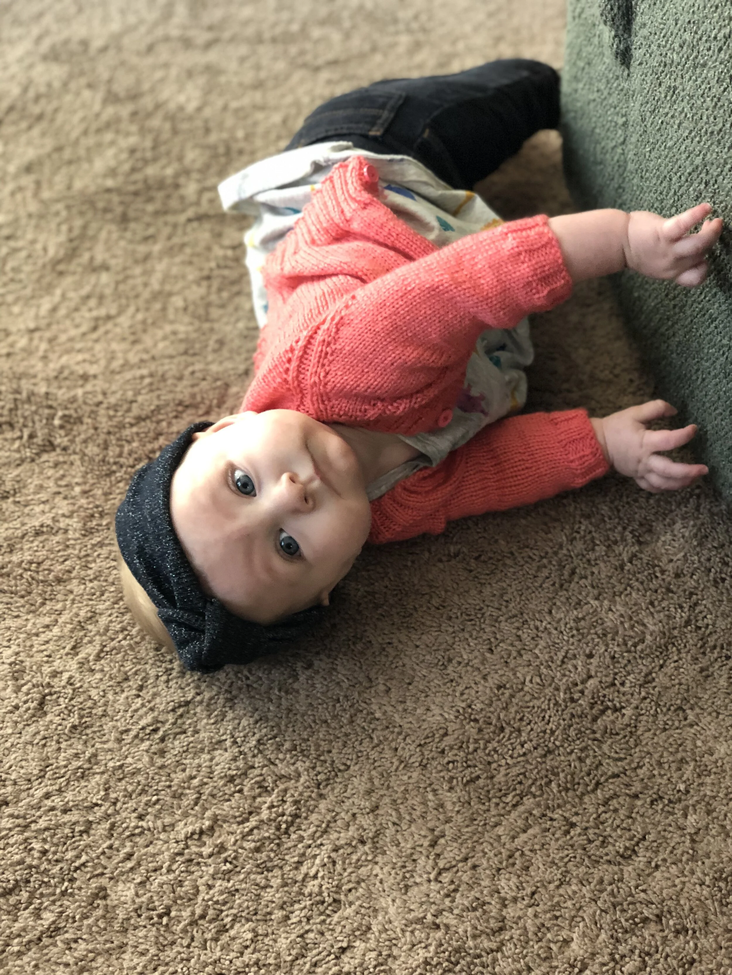 The same day as starting solid foods we decided to try out putting her in a cart instead of carrying the heavy carseat around. She was a fan! (As long as she could have one leg/foot propped up inside the cart, that is.) And yes, it was at Target because of course it was.