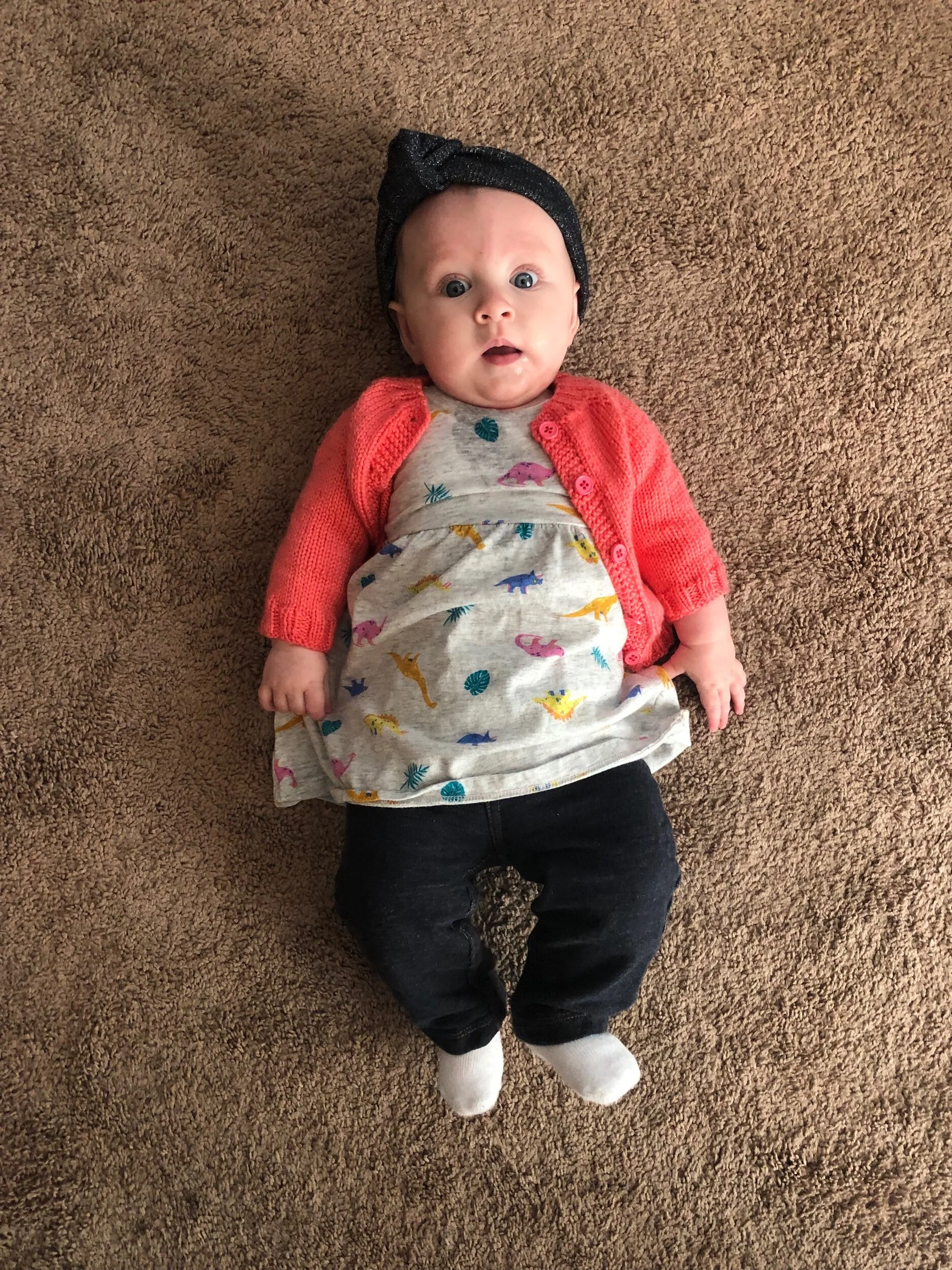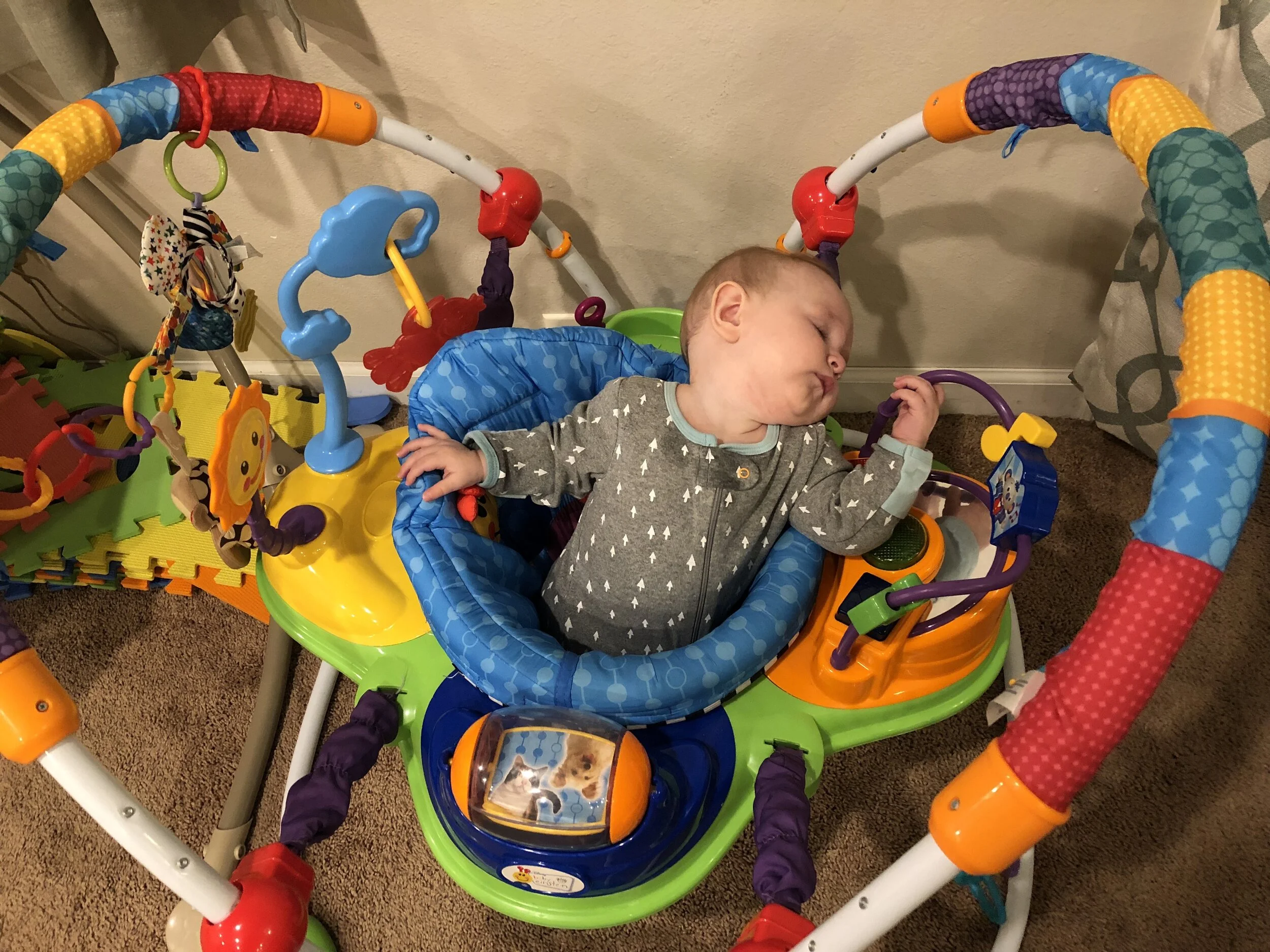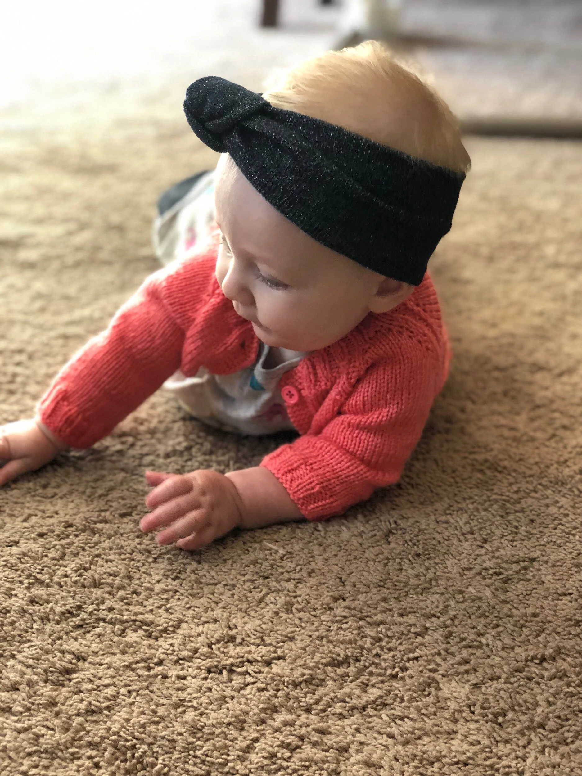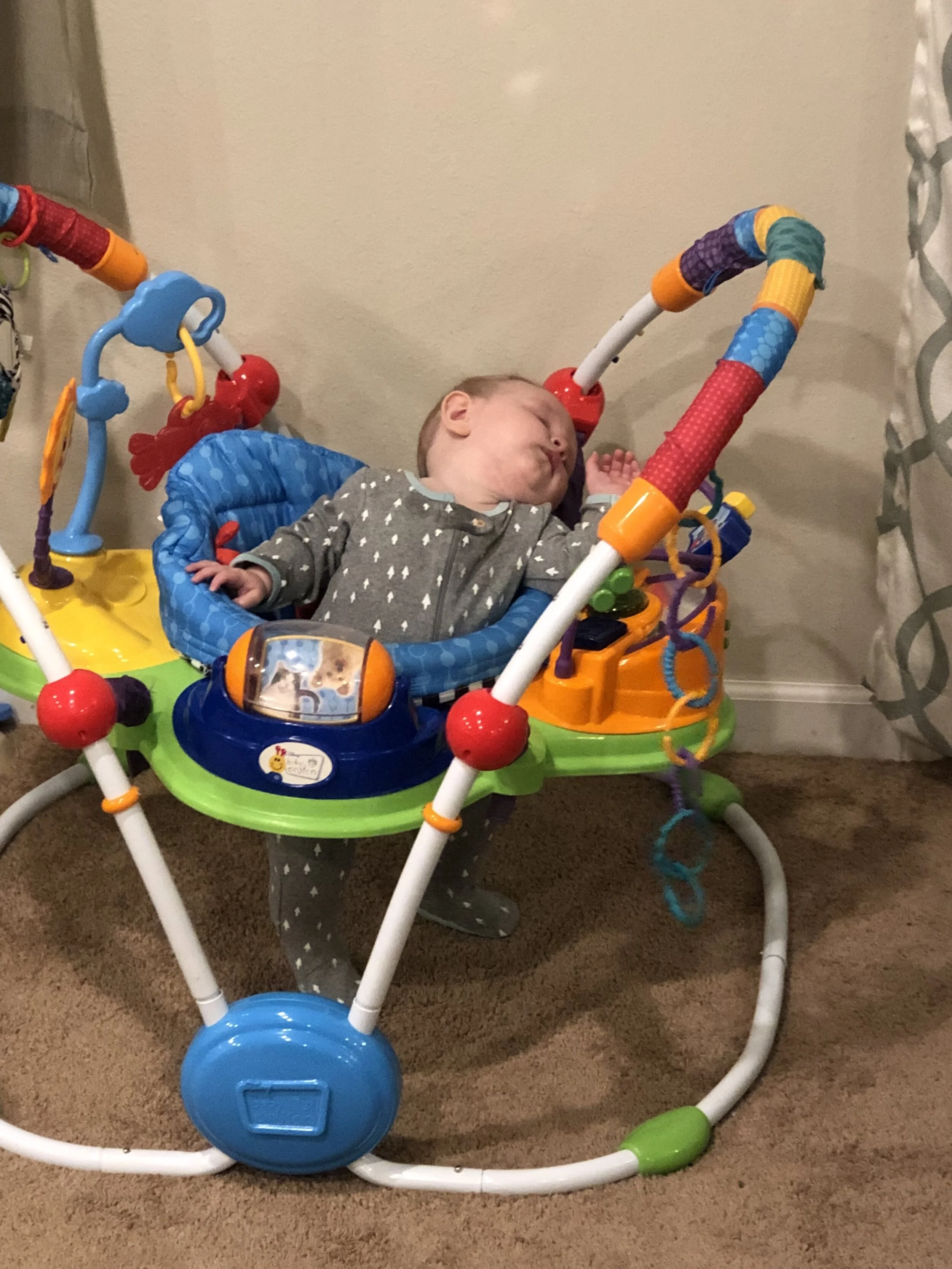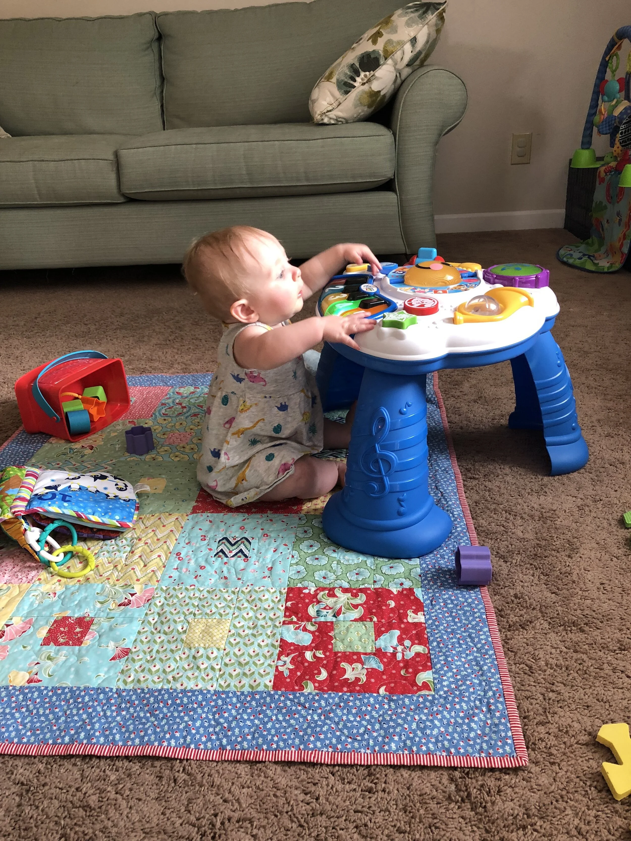 The same day as starting solid foods we decided to try out putting her in a cart instead of carrying the heavy carseat around. She was a fan! (As long as she could have one leg/foot propped up inside the cart, that is.) And yes, it was at Target because of course it was.