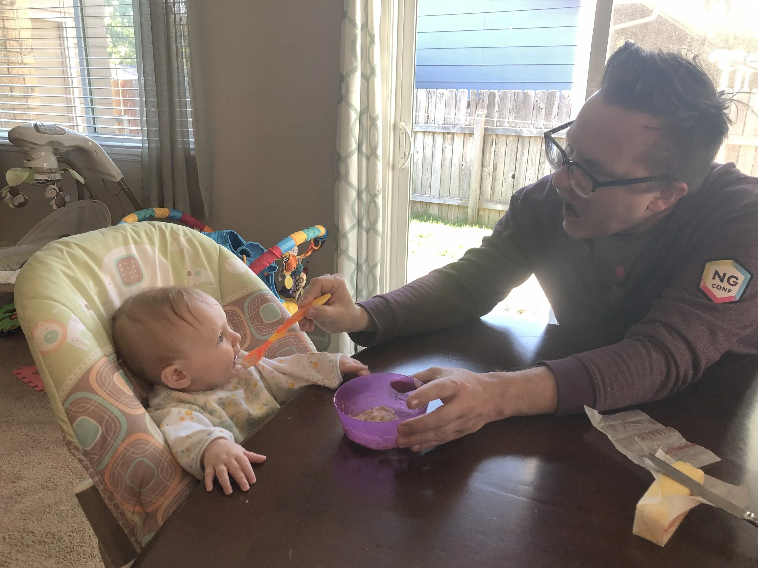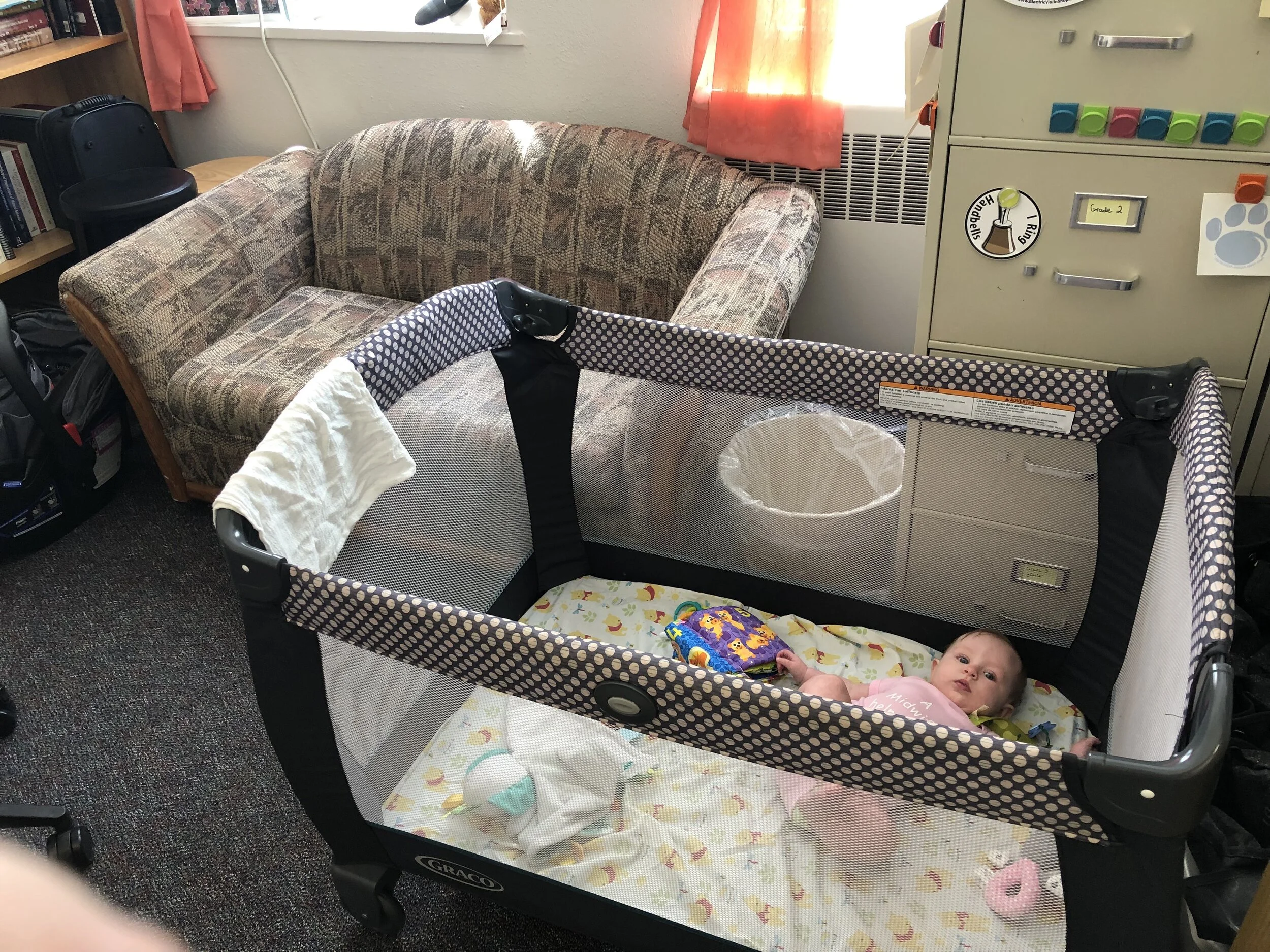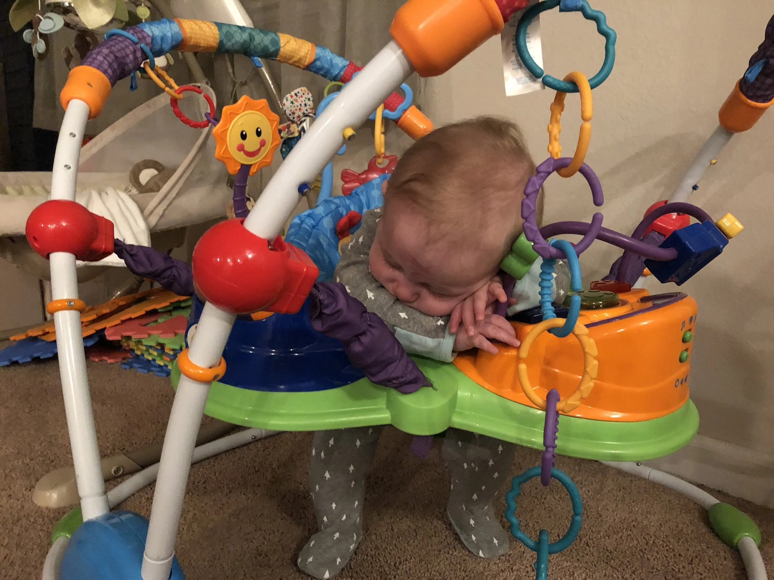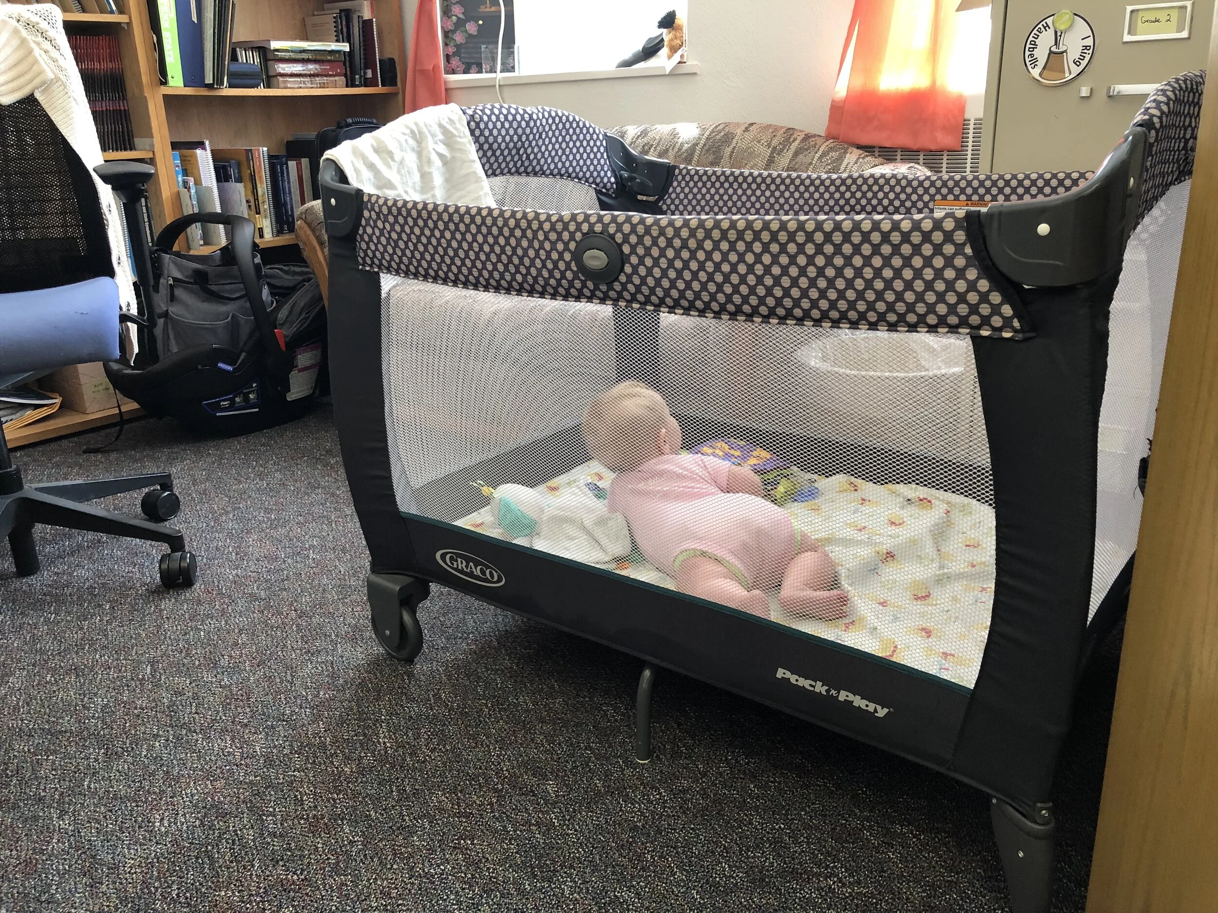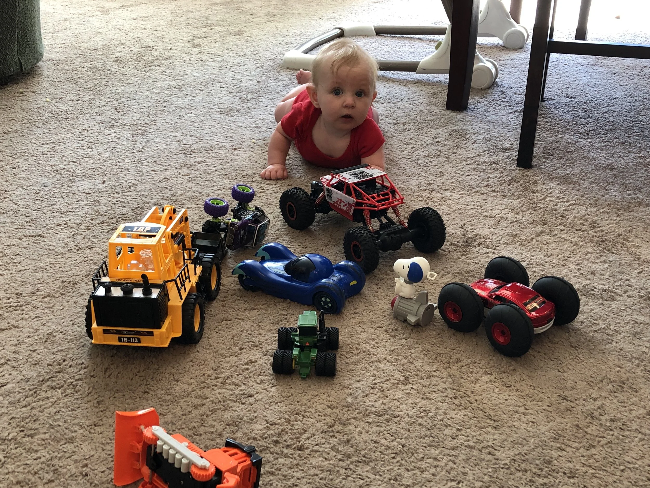 The same day as starting solid foods we decided to try out putting her in a cart instead of carrying the heavy carseat around. She was a fan! (As long as she could have one leg/foot propped up inside the cart, that is.) And yes, it was at Target because of course it was.