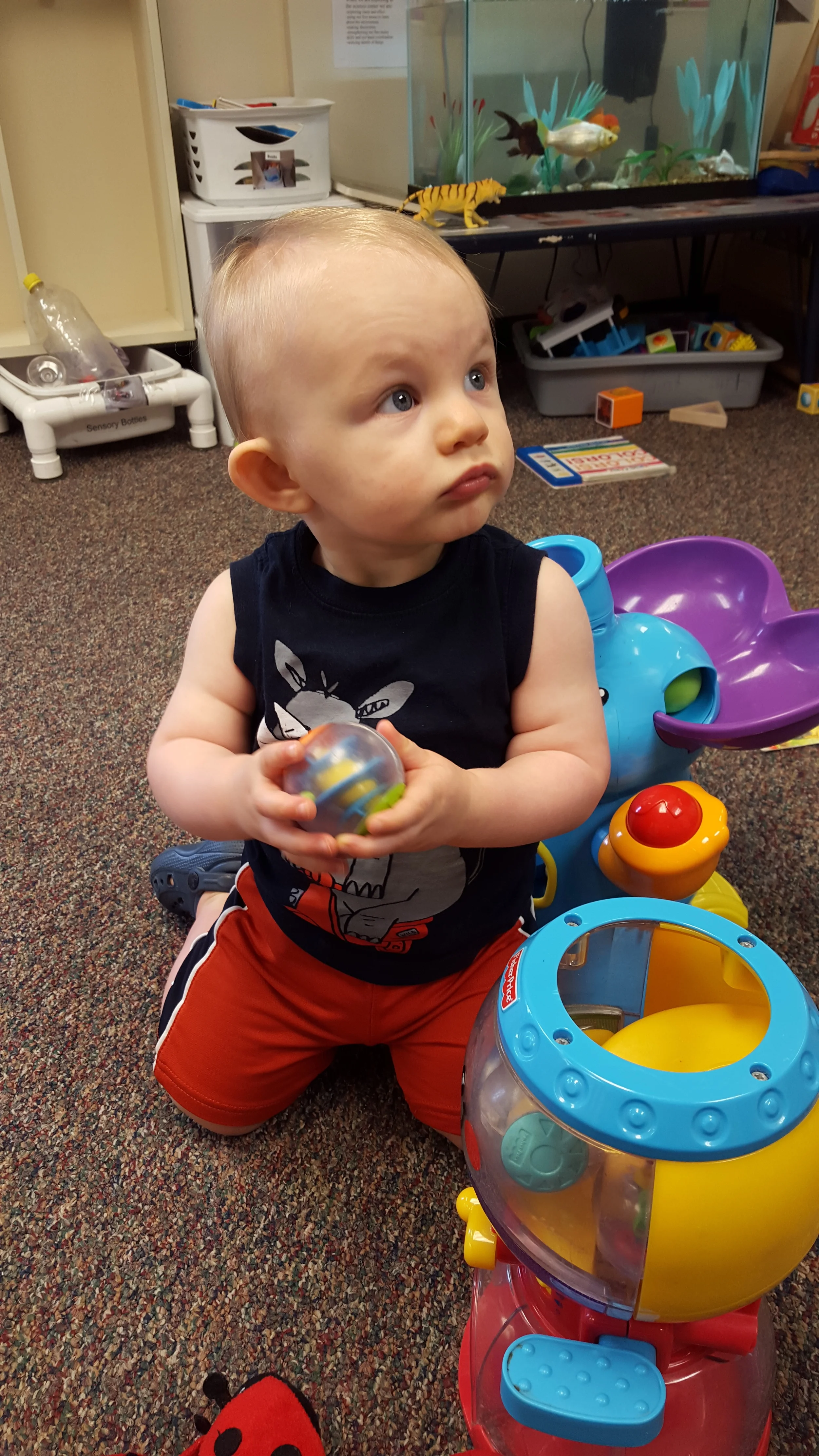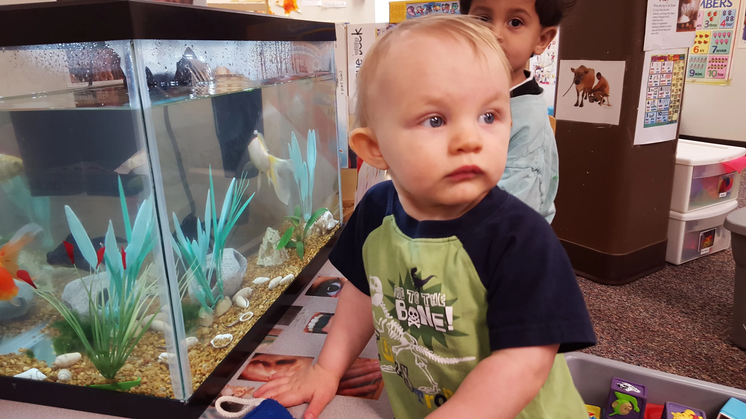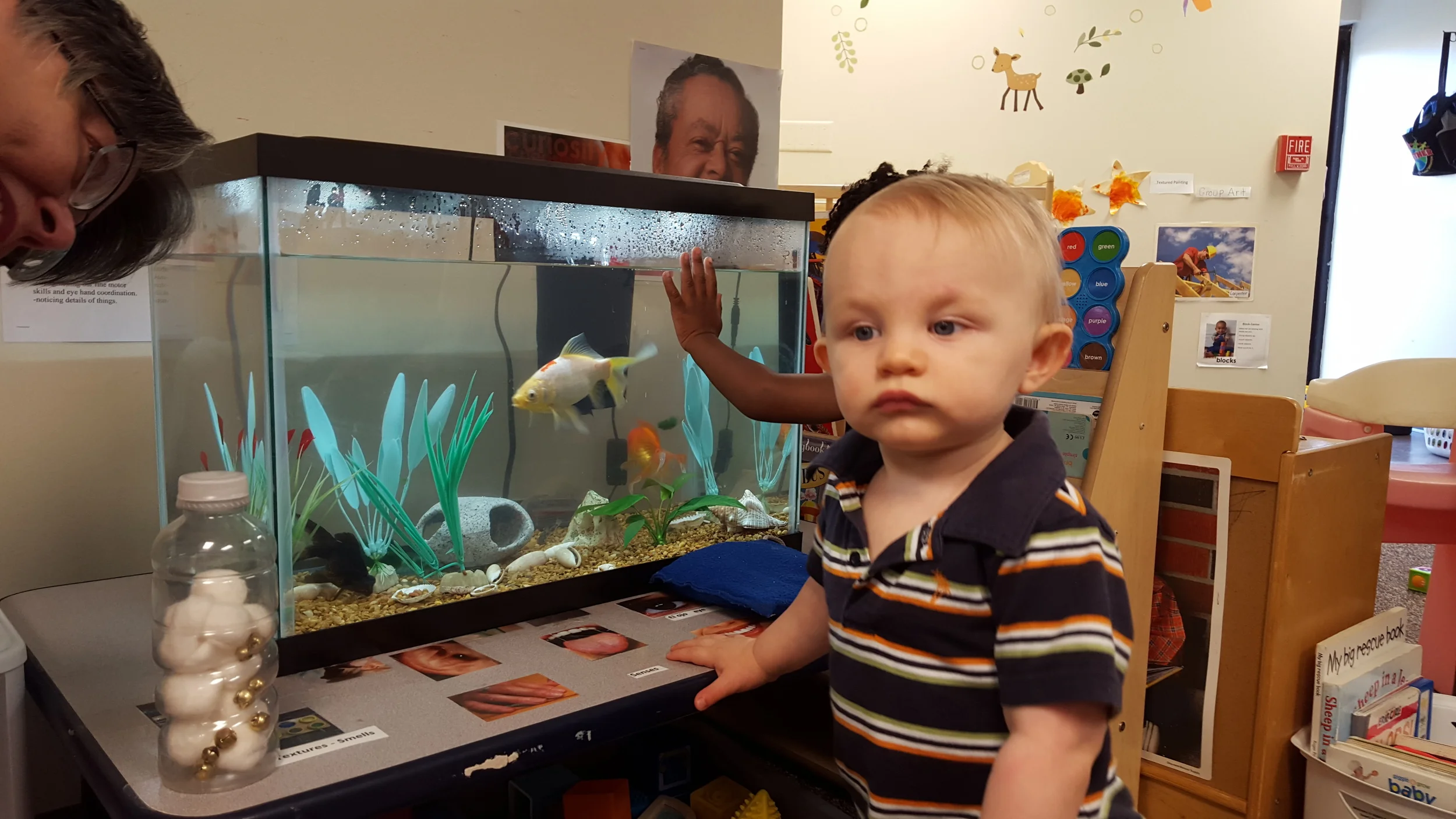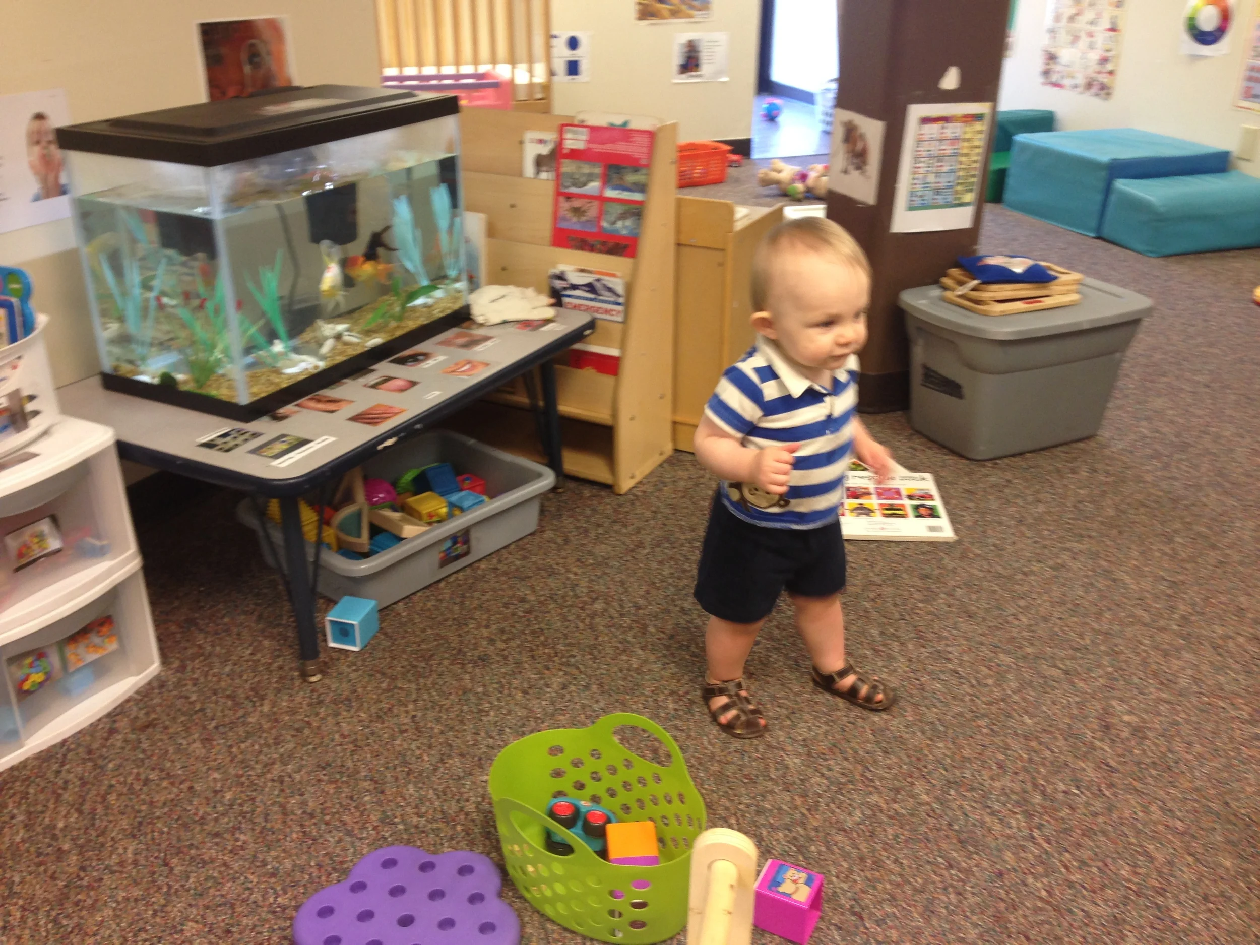 This was a few days before his official start. We had one really rough visit to his room and thankfully this visit was *so* much better! He loves the fishies so much. And he had a great time exploring all the other toys and new friends in the room.