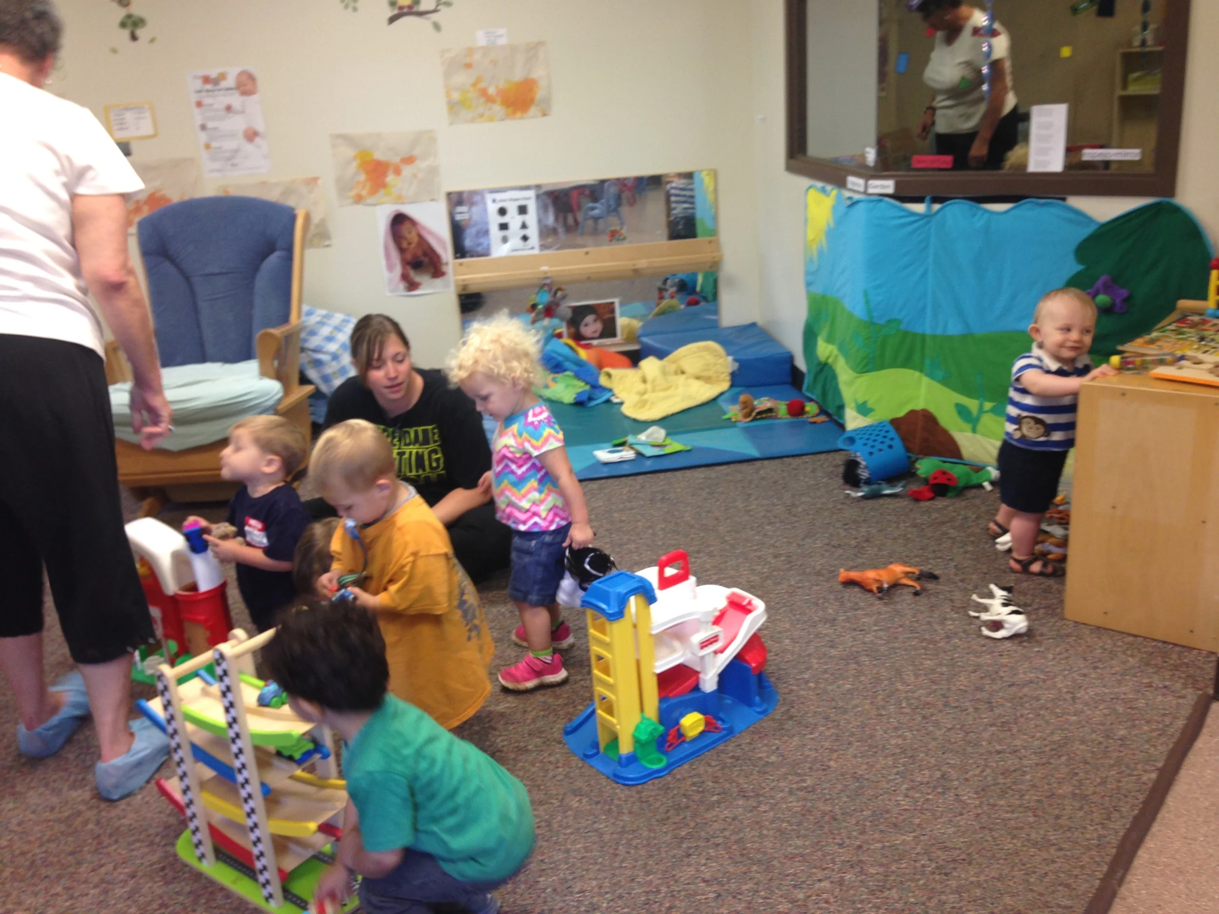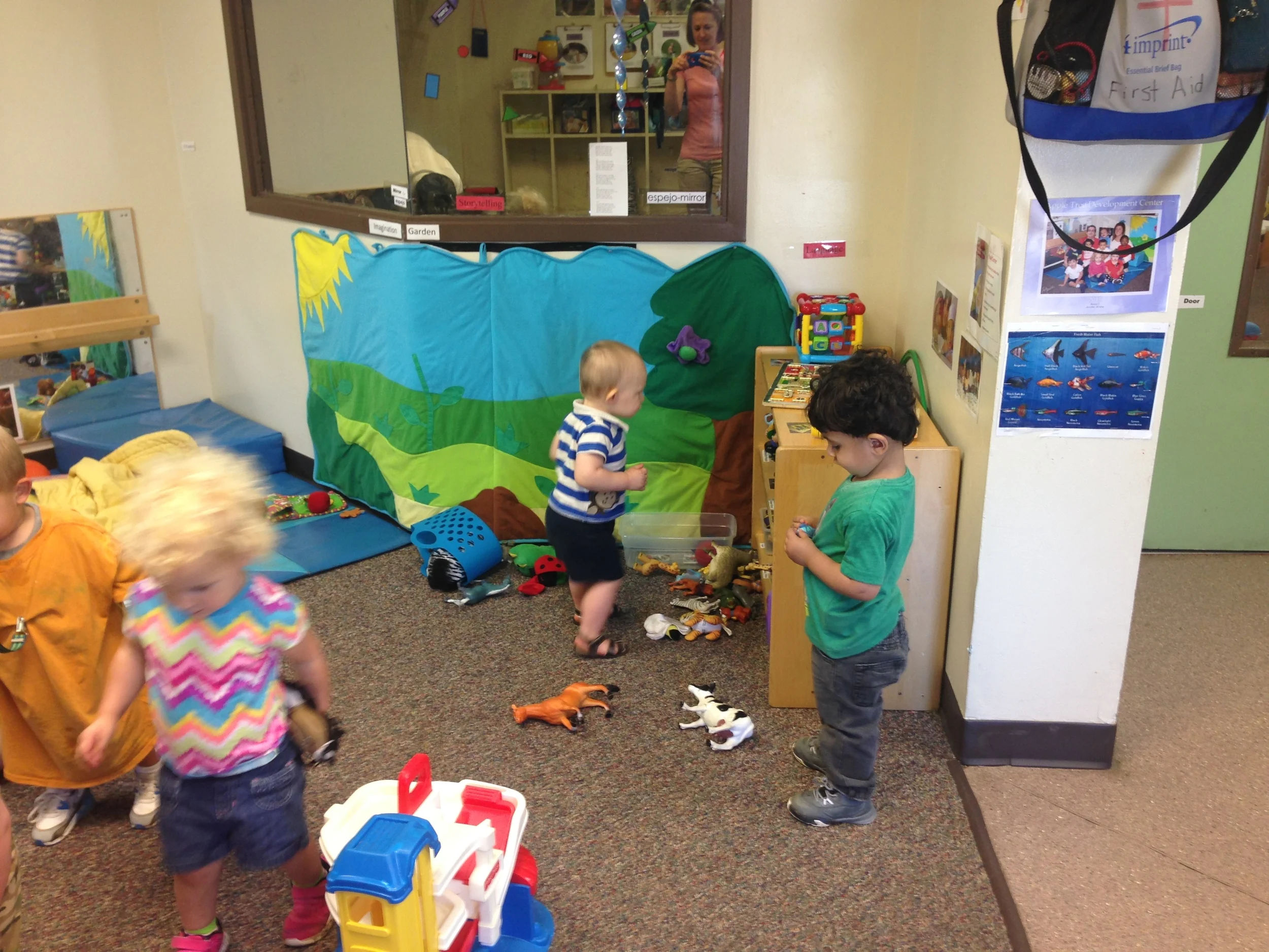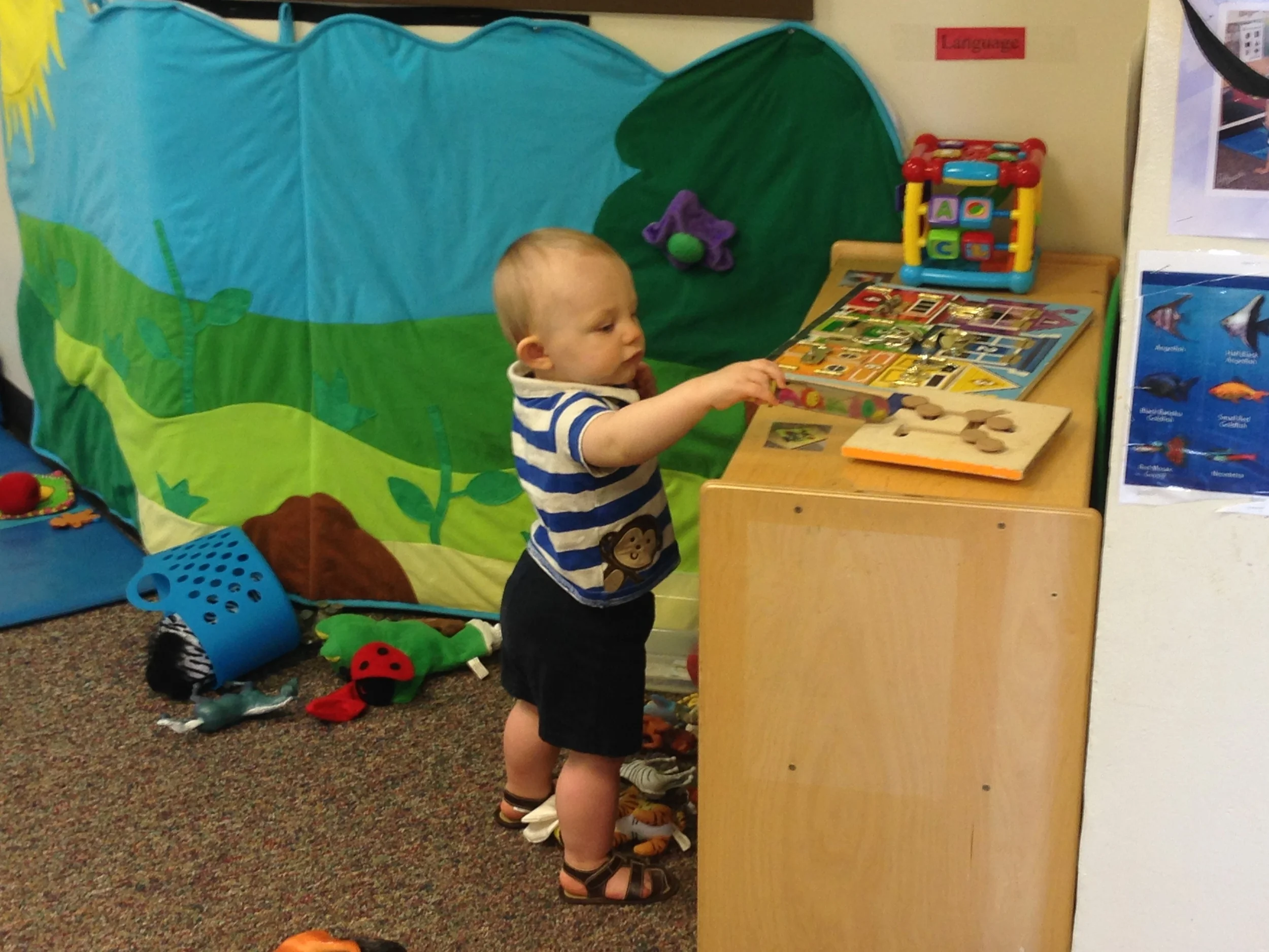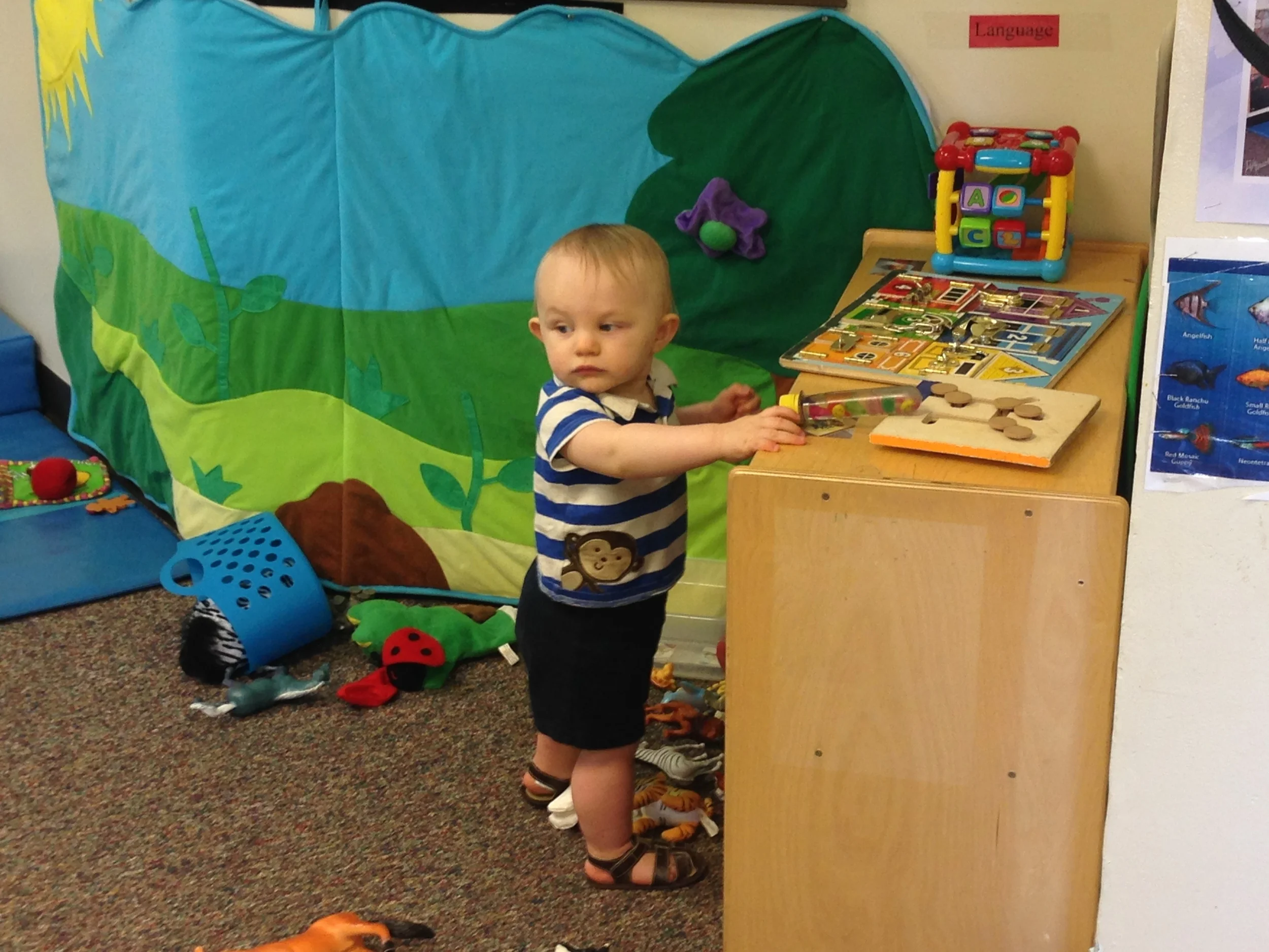 This was a few days before his official start. We had one really rough visit to his room and thankfully this visit was *so* much better! He loves the fishies so much. And he had a great time exploring all the other toys and new friends in the room.