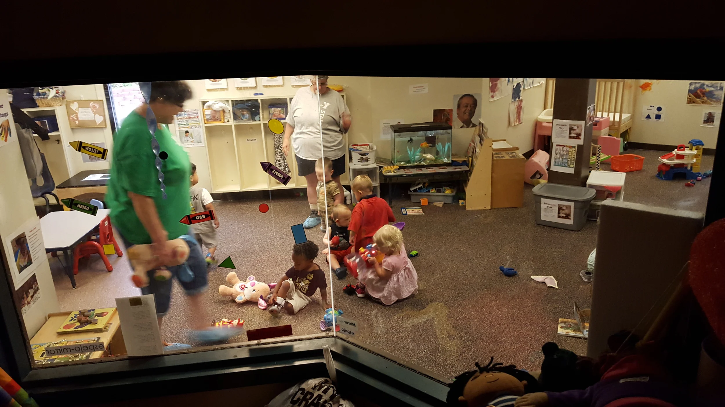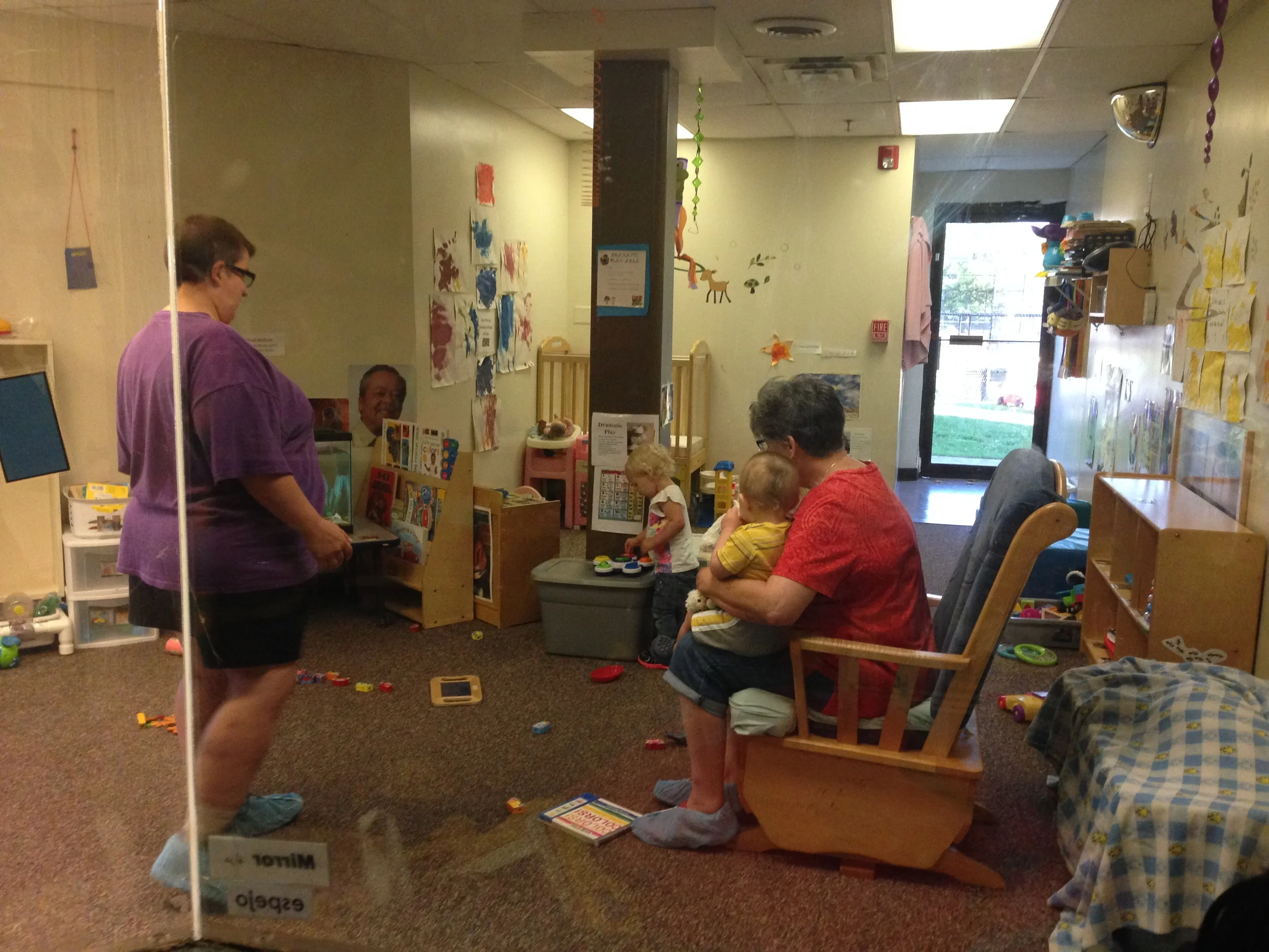 This is from behind the two-way mirror that looks into his room. His teachers are so good to him! Lots of snuggles anytime he needs them.